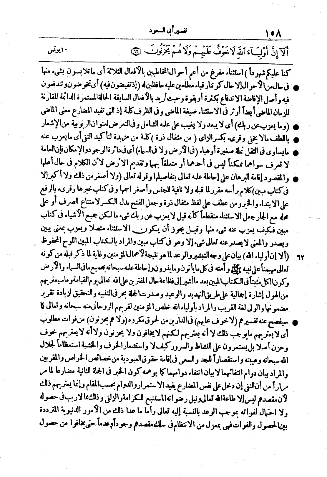 {أَلا إِنَّ أَوْلِيَاء الله} بيانٌ على وجه التبشير والوعد لما هو نتيجةٌ لأعمال المؤمنين وغايةٌ لما ذكر قبله من كونه تعالى مهيمناً على نبيه صلى الله عليه وسلم وأمتِه في كلِّ ما يأتُون وما يذرون وإحاطةِ علمه سبحانه بجميع ما فى السماء والأرض وكونِ الكلِّ مثبتاً في الكتاب المبين بعد ما أُشير إلى فظاعة حالِ المفترين على الله تعالى يومَ القيامةِ وما سيعتريهم من الهول إشارةٌ إجماليةٌ على طريق التهديدِ والوعيد وصُدّرت الجملةُ بحرفي التنبيهِ والتحقيقِ لزيادة تقريرِ مضمونِها والوليُّ لغة القريبُ والمرادُ بأولياء الله خُلّصُ المؤمنين لقربهم الروحاني منه سبحانه وتعالى كما سيفصح عنه تفسيرهم