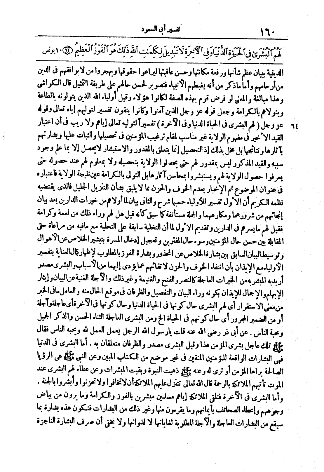 سورة يونس (64) الدينية ببيان عِظَم شأنِها ورفعةِ مكانتها وحُسن عاقبتِها ليُراعوا حقوقَها ويهجُروا من لا يواتفقهم في الدين من أرحامهم وأما ما ذكر من أنه يغبِطُهم الأنبياءُ فتصويرٌ لحسن حالِهم على طريقة التثميل قال الكواشي وهذا مبالغةٌ والمعنى لو فُرض قومٌ بهذه الصفة لكانوا هؤلاء وقيل أولياءُ الله الذين يتولّونه بالطاعة ويتولاهم بالكرامة وجعل قولِه عزَّ وجلَّ الذين آمنوا وكانوا يتقون تفسير لتولّيهم إياه تعالى وقوله عز وجل