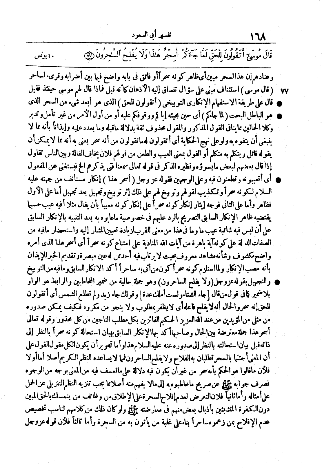سورة يونس (77) وعنادهم إن هذا السحر مبين أي ظاهرٌ كونُه سحراً أو فائقٌ في بابه واضحٌ فيما بين أضرابه وقرئ لساحر
