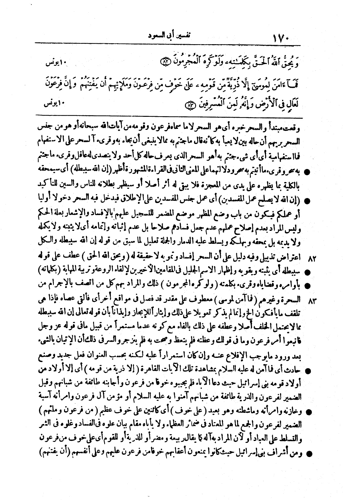 سورة يونس (82) (83) وقعت مبتدأ والسحرُ خبرُه أي هو السحرُ لا ما سماه فرعونُ وقومه من آيات الله سبحانه أو هو من جنس السحرِ يُريهم أن حالَه بيِّن لا يُعبأ به كأنه قال ما جئتم به مما لا ينبغي أن يجاء به وقرئ آلسحر على الاسفهام فما استفهاميةٌ أي أيُّ شيء جئتم به أهو السحرُ الذي يعرِف حالَه كلُّ أحدٍ ولا يتصدى له عاقل وقرئ ما جئتم به سحرٌ وقرئ ما أتيتم به سحرٌ ودلالتُهما على المعنى الثاني في القراءة المشهورة أظهرُ