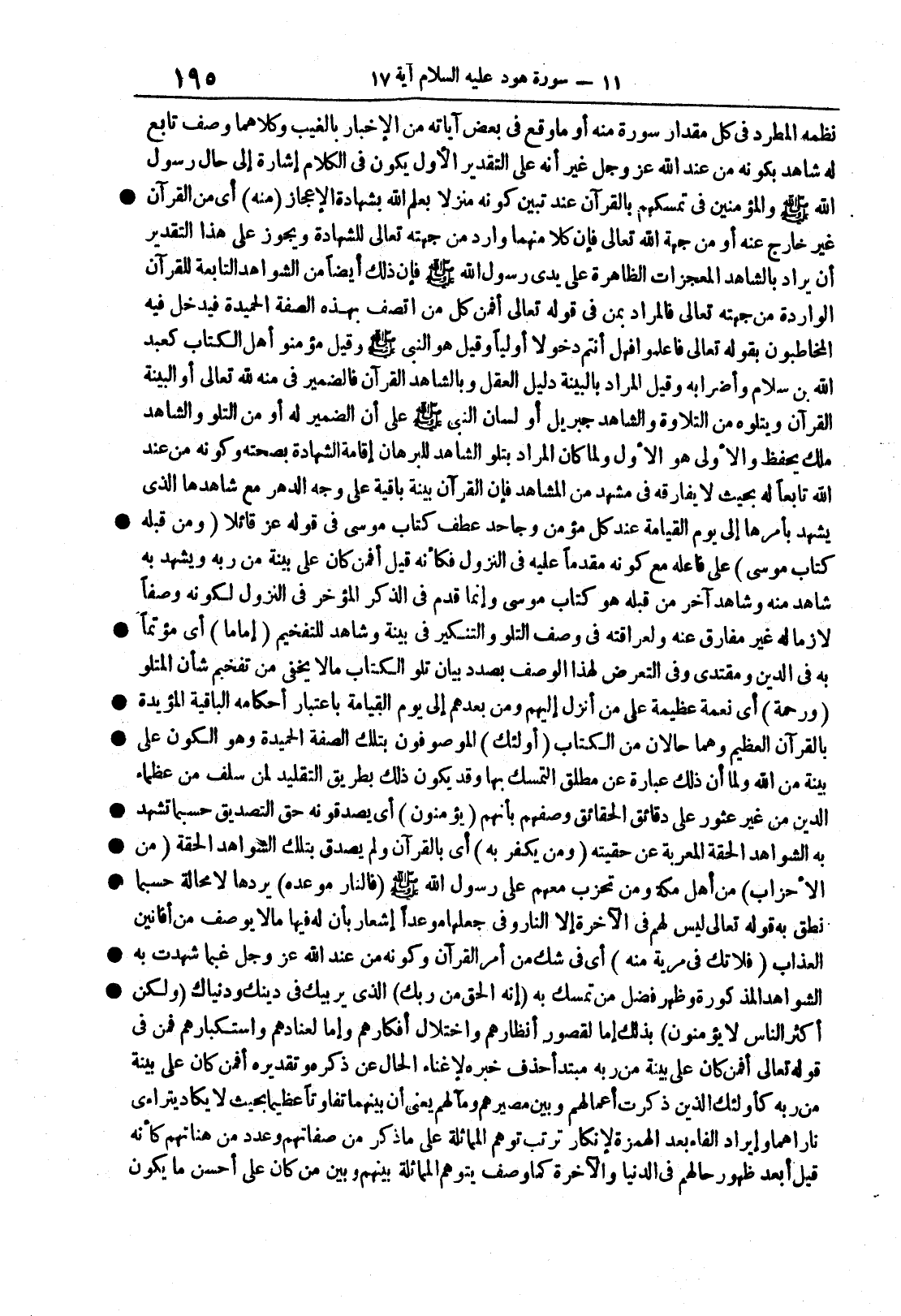 سورة هود (7 ا) نظمه المطّردِ في كل مقدارِ سورةٍ منه أو ما وقع في بعض آياتِه من الإخبار بالغيب وكلاهما وصفٌ تابعٌ له شاهدٌ بكونه من عندِ الله عزَّ وجل غيرَ أنه على التقدير الأولِ يكون في الكلامِ إشارةٌ إلى حال رسولِ الله صلى الله عليه وسلم والمؤمنين في تمسّكهم بالقرآن عند تبيُّنِ كونِه منزلاً بعلم الله بشهادة الإعجاز مِنْهُ أي من القرآن غيرَ خارجٍ عنه أو من جهة الله تعالى فإن كلاًّ منهما واردٌ من جهته تعالى للشهادة ويجوز على هذا التقديرِ أن يراد بالشاهد المعجزاتُ الظاهرةُ على يدَيْ رسولِ الله صلى الله عليه وسلم فإن ذلك أيضاً من الشواهد التابعةِ للقرآن الواردةِ من جهته تعالى فالمرادُ بَمنْ في قوله تعالى أَفَمَنِ كلُّ من اتصف بهذه الصفةِ الحميدةِ فيدخُل فيه المخاطَبون بقوله تعالى فاعلموا فَهَلْ أَنتُمْ دخولاً أولياً وقيل هو النبيُّ صلَّى الله عليهِ وسلم وقيل مؤمنو أهلِ الكتابِ كعبدِ اللَّهِ بن سلام وأضرابِه وقيل المرادُ بالبينة دليلُ العقلِ وبالشاهد القرآنُ فالضمير في منه لله تعالى أو البينةُ القرآنُ ويتلوه من التلاوة والشاهدُ جبريلُ أو لسانُ النبيِّ صلَّى الله عليهِ وسلم على أن الضميرَ له أو من التُّلُوّ والشاهدُ مَلَكٌ يحفظ والأَوْلى هو الأولُ ولما كان المرادُ بتلوّ الشاهدِ للبرهان إقامةَ الشهادة بصحته وكونِه من عند الله تابعاً له بحيث لا يفارقه في مشهد من المشاهد فإن القرآنَ بيِّنةٌ باقيةٌ على وجه الدهرِ مع شاهدها الذي يشهد بأمرها إلى يوم القيامةِ عند كلِّ مؤمنٍ وجاحدٍ عُطف كتابُ موسى في قوله عز قائلاً