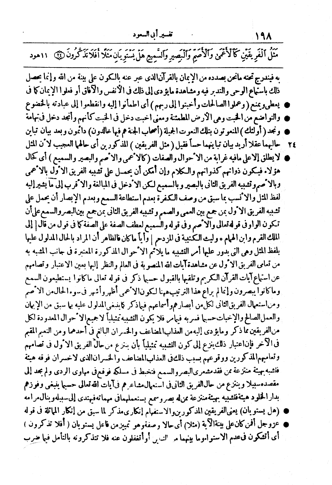 أي كحال هؤلاءِ فيكون ذواتُهم كذواتهم والكلامُ وإن أمكن أن يحمل على تشبيه الفريق الأولِ بالأعمى وبالأصمِّ وتشبيهِ الفريقِ الثاني بالبصير وبالسميع لكن الأدخلَ في المبالغة والأقربَ إلى ما يشير إليه لفظُ المثل والأنسبَ بما سبق من وصف الكفرةِ بعدم استطاعةِ السمع وبعدم الإبصارِ أن يُحمل على تشبيه الفريقِ الأولِ بمن جمع بين العَمى والصمَم وتشبيهُ الفريقِ الثاني بمَن جمع بين البصر والسمع على أن تكون الواوُ في قوله تعالى والاصم وفي قوله والسميع لعطف الصفةِ على الصفة كما في قول من قالَ ... إِلَى الملكِ القَرْمِ وابنِ الهُمام ... وليثِ الكتيبةِ في المُزْدَحَمْ ...