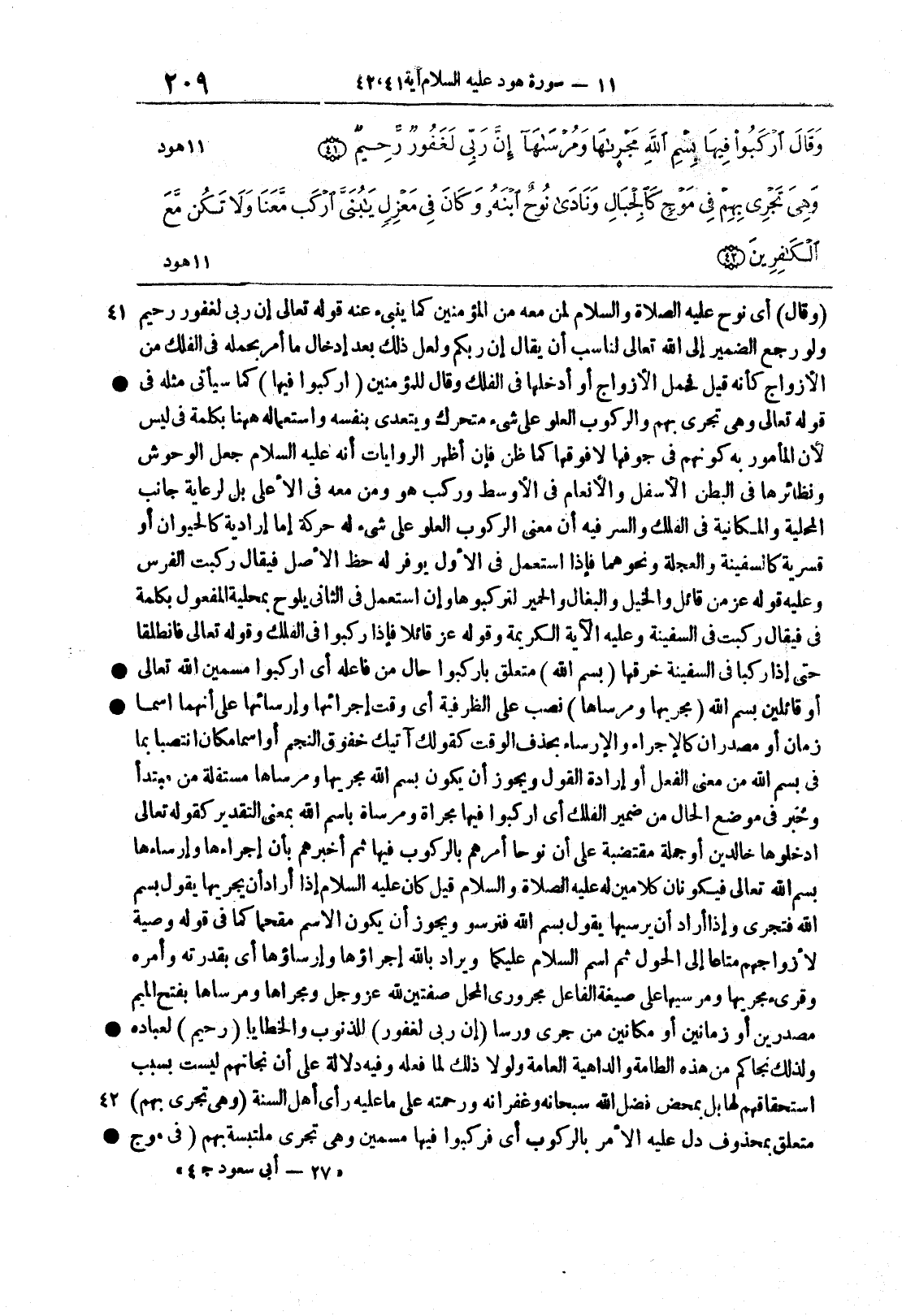 {مجراها ومرساها} نصبٌ على الظرفية أي وقتَ إجرائِها وإرسائِها على أنهما اسما زمانٍ أو مصدران كالإجراء والإرساءِ بحذف الوقت كقولك آتيك حقوق النجمِ أو اسما مكانٍ انتصبا بما في بِسْمِ الله منْ مَعْنى الفعلِ أو إرادةِ القول ويجوز أن يكون بِسْمِ اللَّهِ مجريها وَمُرْسَاهَا مستقلةً من مبتدأ وخبر في موضع الحالِ من ضمير الفلك أي اركبوا فيها مُجراةً ومُرساةً باسم الله بمعنى التقدير كقوله تعالى ادخلوها خالدين أو جملةٌ مقتضبةٌ على أن نوحاً أمرهم بالركوب فيها ثم أخبرهم بأن إجراءها وإرساءها بسم الله تعالى فيكونان كلامين له عليه الصلاة والسلام قيل كان عليه السلام إذا أراد أن يُجرِيَها يقول بسم الله فتجري وإذا أراد أن يرسيَها يقول بسم الله فترسو ويجوز أن يكون الاسمُ مقْحماً كما في قوله وصية لأزواجهم متاعا إلى الحولِ ثم اسمُ السلامِ عليكما ويراد بالله إجراؤُها وإرساؤُها أي بقدرته وأمره وقريء مجريها ومرسيها على صيغة الفاعل مجرورَي المحل صفتين لله عز وجل ومَجراها ومَرْساها بفتح الميم مصدرين أو زمانين أو مكانين من جرى ورسا