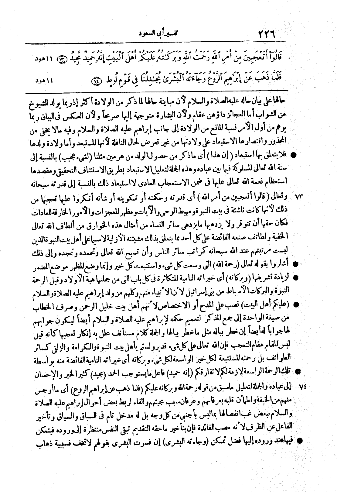 {عَلَيْكُمْ أَهْلَ البيت} نصبَ على المدحِ أو الاختصاصِ لأنهم أهلُ بيتِ خليلِ الرحمن وصرفُ الخطاب من صيغة الواحدة إلى جمع المذكر لتعميم حكمه لإبراهيم عليه الصلاة والسلام أيضاً ليكون جوابُهم لها جواباً له أيضاً إن خطر بباله مثلُ ما خطر ببالها والجملة كلامٌ مستأنَفٌ عُلّل به إنكارُ تعجُّبها كأنه قيل ليس المقام مقام التعجب فإن الله تعالَى على كُلِّ شيءٍ قديرٌ ولستم يأهل بيتِ النبوةِ والكرامةِ والزلفى كسائر الطوائفِ بل رحمتُه المستتبِعةُ لكل خيرٍ الواسعةُ لكل شيء وبركاتُه أي خيراتُه الناميةُ الفائضةُ منه بواسطة تلك الرحمةِ الواسعةِ لازمةٌ لكم لا تفارقكم