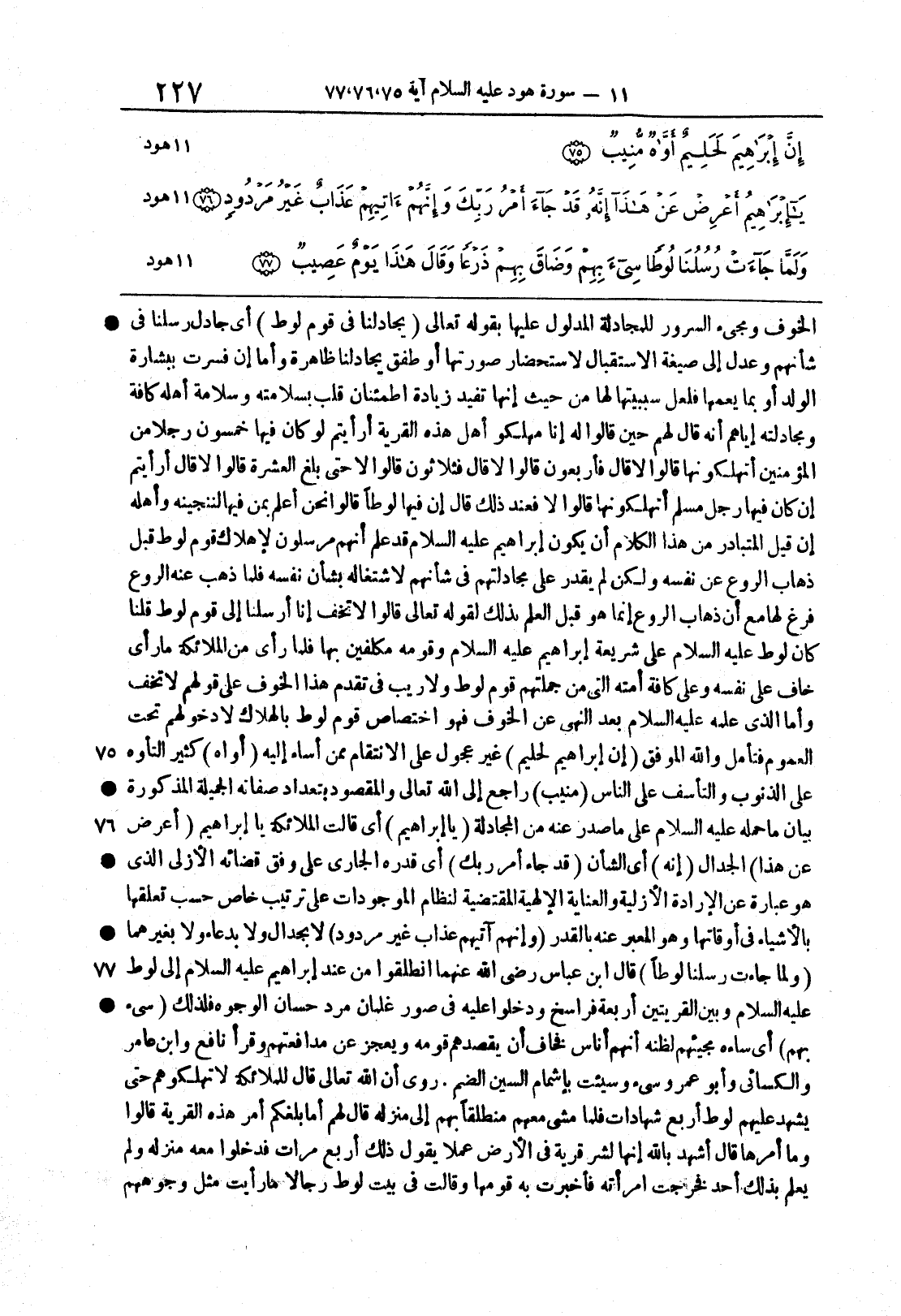 {يجادلنا فِى قَوْمِ لُوطٍ} أي جادل رسلَنا في شأنهم وعُدل إلى صيغة الاستقبالِ لاستحضار صورتِها أو طفِقَ يجادلنا ظاهرةٌ وأما إن فُسّرت ببشاره الولدِ أو بما يعُمها فلعل سببيّتَها لها من حيث إنها تفيد زيادةَ اطمئنانِ قلب بسلامته وسلامةِ أهلهِ كافةً ومجادلتُه إياهم أنه قال لهم حين قالوا له إنا مهلكوا أهلِ هذه القريةِ أرأيتم لو كان فيها خمسون رجلاً من المؤمنين أتُهلكونها قالوا لا قال فأربعون قالوا لا قال فثلاثون قالوا لا حتى بلغ العشرةَ قالوا لا قال أرأيتم إن كان فيها رجلٌ مسلمٌ أتهلكونها قالوا لا فعند ذلك قَالَ إِنَّ فِيهَا لُوطاً قَالُواْ نَحْنُ أعلمُ بِمَن فيها الننجينه وأهلَه إن قيل المتبادرُ من هذا الكلامِ أن يكون إبراهيمُ عليه السلام قد علِم أنهم مرسَلون لإهلاك قومِ لوطٍ قبل ذهابِ الرَّوع عن نفسه ولكن لم يقدِر على مجادلتهم في شأنهم لاشتغاله بشأن نفسِه فلما ذهب عنه الروعُ فرَغ لها مع أن ذهابَ الروعِ إنما هو قبل العِلم بذلك لقوله تعالى قَالُواْ لاَ تَخَفْ إِنَّا أُرْسِلْنَا إلى قَوْمِ لُوطٍ قلنا كان لوطٌ عليه السلام على شريعة إبراهيمَ عليه السلام وقومُه مكلّفين بها فلما رأى من الملائكة ما رأى خاف على نفسه وعلى كافة أمتِه التي من جملتهم قومُ لوط ولا ريبَ في تقدمِ هذا الخوفِ على قولهم لا تخف وأما الذي علمه السلام بعد النهي عن الخوف فهو اختصاصُ قومِ لوطٍ بالهلاك لا دخولُهم تحت العموم فتأملْ والله الموفق