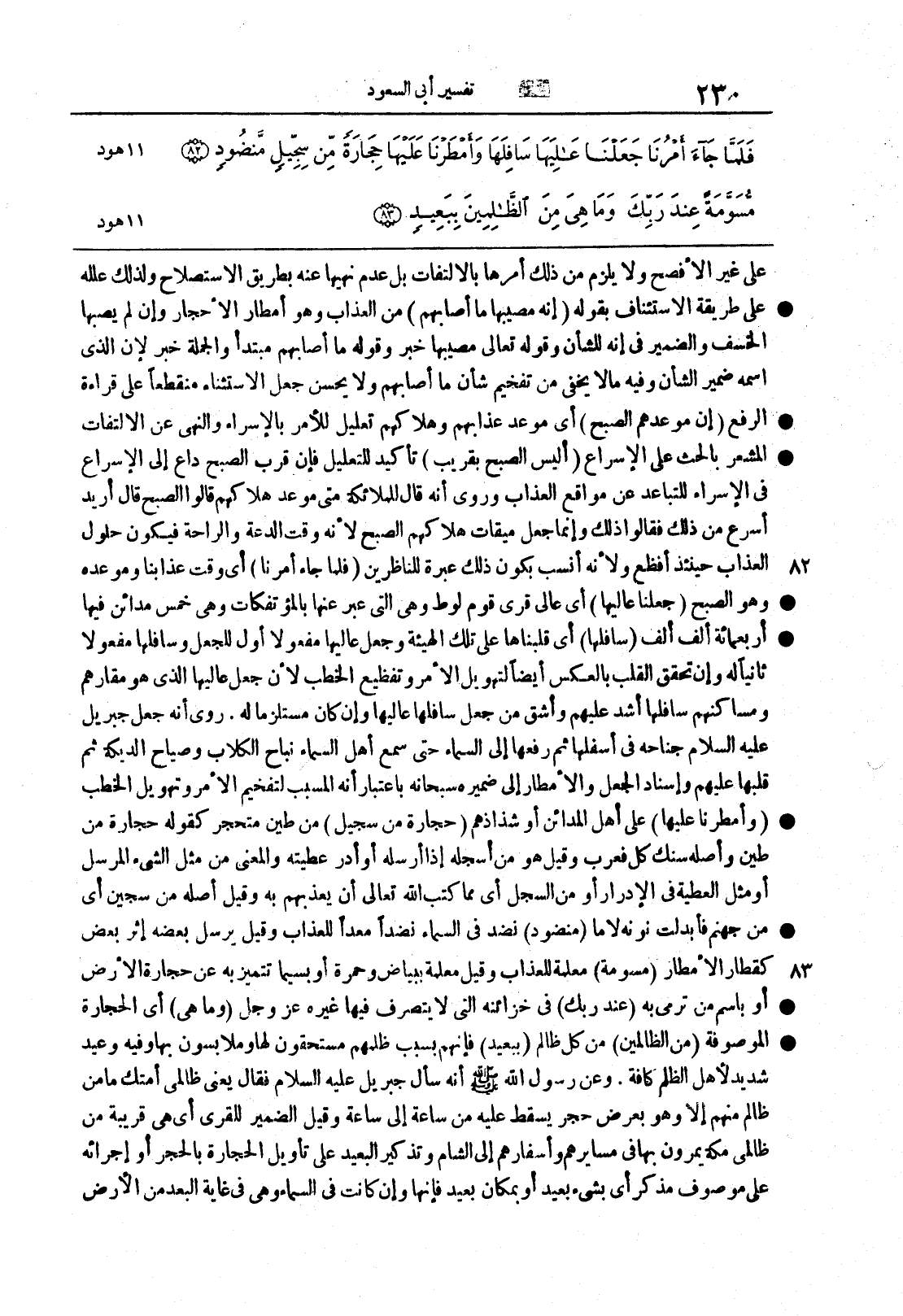 سورة هود (82 83) {جَعَلْنَا عاليها} أي عاليَ قُرى قومِ لوطٍ وهي التي عُبّر عنها بالمؤتفكات وهي خمسُ مدائنَ فيها أربعُمائةِ ألفِ ألفٍ