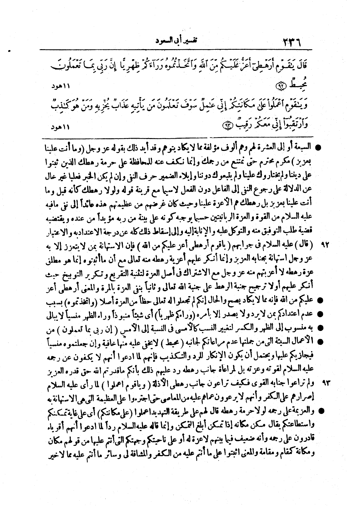 هود (92 93) {يا قوم أَرَهْطِى أَعَزُّ عَلَيْكُم مّنَ الله} فإن الاستهانةَ بمن لا يَتعزّز إلا به عز وجل استهانةٌ بجنابه العزيز وإنما أنكر عليهم أعزِّيّةَ رهطِه منه تعالى مع أن ما أثبتوه إنما هو مطلقُ عزةِ رهطِه لا أعزبتهم منه عز وجل مع الاشتراك في أصل العزةِ لتثنية التقريعِ وتكريرِ التوبيخِ حيث أنكر عليهم أولا ترجيح جنبة الرهطِ على جنبة الله تعالى وثانيا بنفي العزة بالمرة والمعنى أَرَهْطِى أَعَزُّ عَلَيْكُم مّنَ الله فإنه مما لا يكاد يصح والحال إنكم لم تجعلوا له تعالى حظاً من العزة أصلاً
