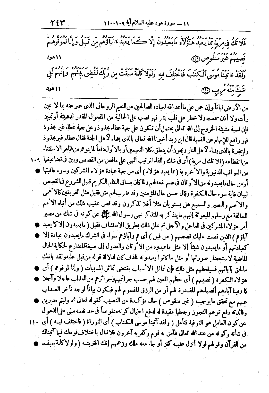هود الآية (109 110) من الارض نباتا وإن حُمل على ما أعد الله لعباده الصالحين من النعيم الروحاني الذي عبّر عنه بما لا عينٌ رأتْ ولا أذن سمعت ولا خطر على قلب بشر فهو نصبٌ على الحالية من المفعول المقدر للمشيئة أو تمييزٌ فإن نسبةَ مشيئةِ الخروج إلى الله تعالى يحتمل أن تكون على جهة عطاءٍ مجذوذ وعلى جهة عطاءٍ غيرِ مجذوذ فهو رافعٌ للإبهام عن النسبة قال ابن زيد أخبرنا الله تعالى بالذي يشاء لأهل الجنةِ فقال عَطَاء غَيْرَ مَجْذُوذٍ ولم يُخبرنا بالذي يشاء لأهل النارِ ويجوز أن يتعلق بكلا النعيمين أو بالأول دفعاً لما يتوهم من ظاهر الاستثناءِ من انقطاعه