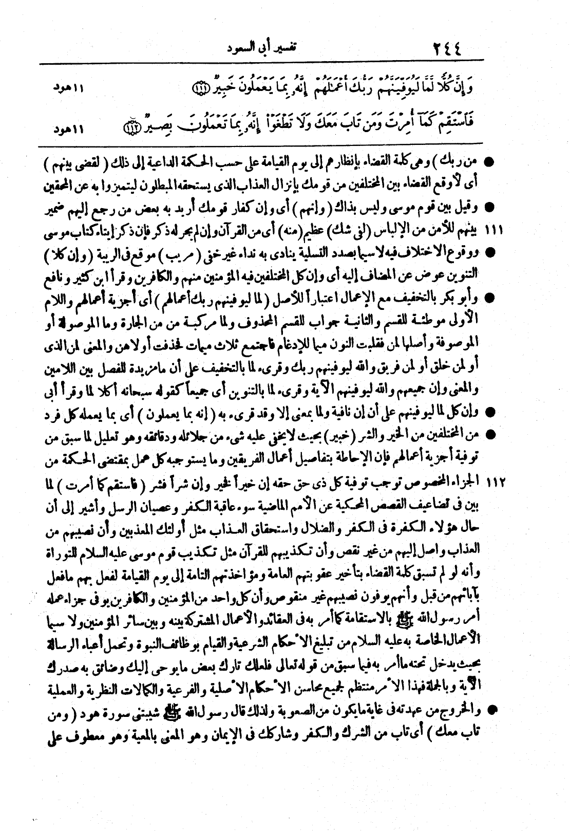 {فاستقم كَمَا أُمِرْتَ} لما بيّن في تضاعيف القصص المَحْكية عن الأمم الماضيةِ سوءُ عاقبة الكفرِ وعصيانِ الرسل وأُشير إلى أن حالَ هؤلاء الكفرةِ في الكفر والضلالِ واستحقاق العذابِ مثلُ أولئك المعذبين وأن نصيبَهم من العذاب واصلٌ إليهم من غير نقص وأن تكذيبَهم للقرآن مثلُ تكذيبِ قوم موسى عليه السلام للتوراة وأنه لو لم تسبِقْ كلمةُ القضاءِ بتأخير عقوبتِهم العامةِ ومؤاخذتِهم التامّةِ إلى يوم القيامة لفُعل بهم ما فُعل بآبائهم من قبلُ وأنهم يُوفَّوْن نصيبَهم غيرَ منقوص وأن كل واحدٍ من المؤمنين والكافرين يوفى جزاءَ عملِه أُمر رسولُ الله صلى الله عليه وسلم بالاستقامة كما أمر به في العقائد والأعمالِ المشتركة بينه وبين سائِر المؤمنين ولا سيما الأعمالُ الخاصةُ به عليه السلام من تبليغ الأحكامِ الشرعية والقيامِ بوظائف النبوةِ وتحمّل أعباءِ الرسالةِ بحيث يدخُل تحته ما أمر به فيما سبقَ من قولِه تعالى فَلَعَلَّكَ تَارِكٌ بَعْضَ مَا يوحى إِلَيْكَ وَضَائِقٌ بِهِ صَدْرُكَ الآية وبالجملة فهذا الأمرُ منتظمٌ لجميع محاسنِ الأحكامِ الأصليةِ والفرعية والكمالاتِ النظريةِ والعملية والخروجُ من عُهدته في غايةِ ما يكونُ من الصعوبة ولذلك قال رسول الله صلى الله عليه وسلم شيبتْني سورةُ هود