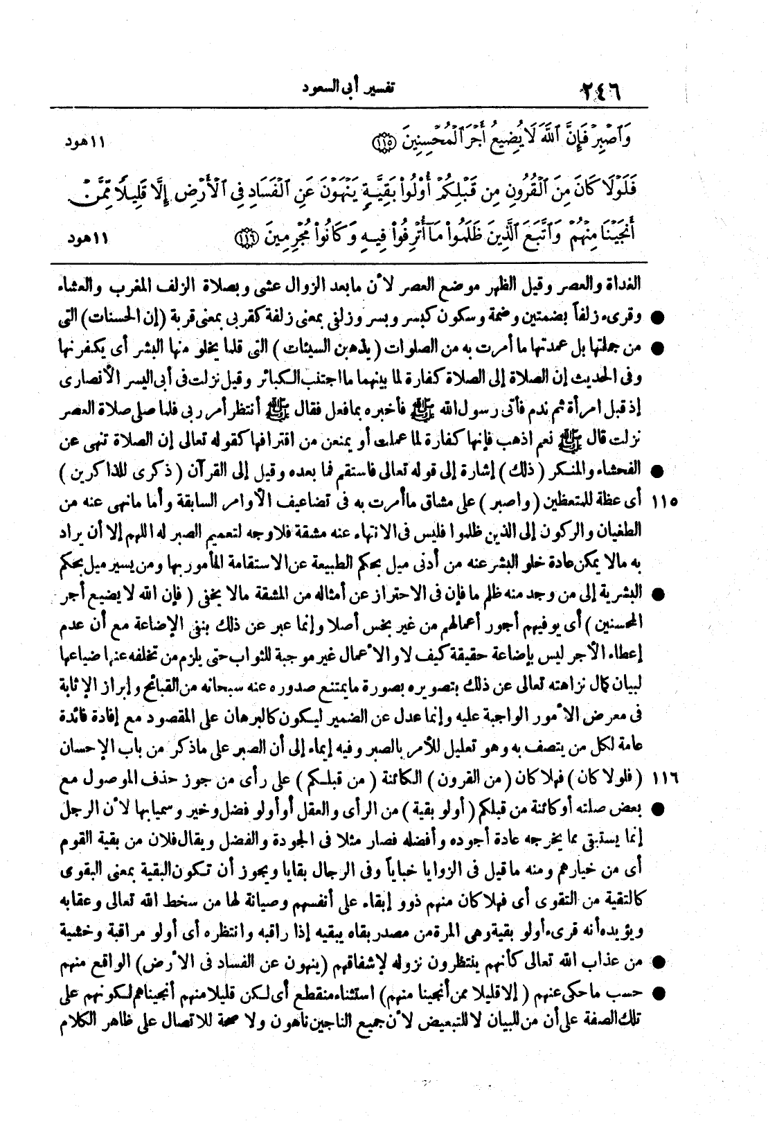 هود الآية (115 116) الغداة والعصرِ وقيل الظُهر موضعَ العصر لأن ما بعد الزوال عشيٌّ وبصلاة الزُلَف المغربُ والعشاء وقرىء زُلُفاً بضمتين وضمة وسكون كبُسْر وبُسُر وزُلفى بمعنى زُلفة كقربى بمعنى قربة