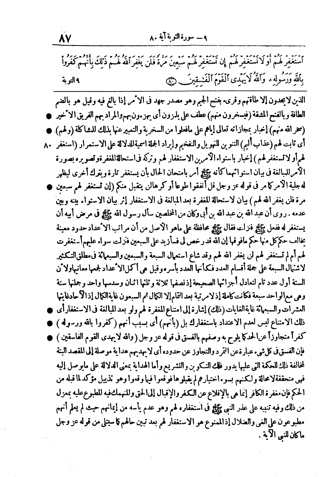 {إِن تَسْتَغْفِرْ لَهُمْ سَبْعِينَ مَرَّةً فَلَن يَغْفِرَ الله لَهُمْ} بيانٌ لاستحالة المغفرة بعد المبالغةِ في الاستغفار إثرَ بيانِ الاستواءِ بينه وبين عدمِه رُوِيَ أنَّ عبدَ اللَّه بنَ عبدِ اللَّه بنِ أُبيّ وكان من المخلِصين سأل رسول الله صلى الله عليه وسلم في مرض أبيه أن يستغفر له ففعل صلى الله عليه وسلم فنزلت فقال صلى الله عليه وسلم محافظةً على ما هو الأصلُ من أن مراتبَ الأعداد حدودٌ معينةٌ يخالف حكمُ كلَ منها حكمَ ما فوقها إن الله قد رخّص لي فسأزيد على السبعين فنزلت سَوَاء عَلَيْهِمْ أَسْتَغْفَرْتَ لَهُمْ أَمْ لَمْ تَسْتَغْفِرْ لَهُمْ لَن يَغْفِرَ الله لَهُمْ وقد شاع استعمالُ السبعةِ والسبعين والسبعِمائةِ في مطلق التكثيرِ لاشتمال السبعة على جملة أقسام العددِ فكأنها العددُ بأسره وقيل هي أكملُ الأعدادِ لجمعها معانيَها ولأن الستة أولُ عددٍ تامَ لتعادل أجزائِها الصحيحةِ إذ نصفُها ثلاثة وثلثُها اثنان وسدسُها واحد وجملتها ستةٌ وهي مع الواحد سبعةٌ فكانت كاملةً إذ لا مرتبةَ بعد التمام إلا الكمالُ ثم السبعون غايةُ الكمالِ إذ الآحادُ غايتُها العشرات والسبعُمائة غايةُ الغايات