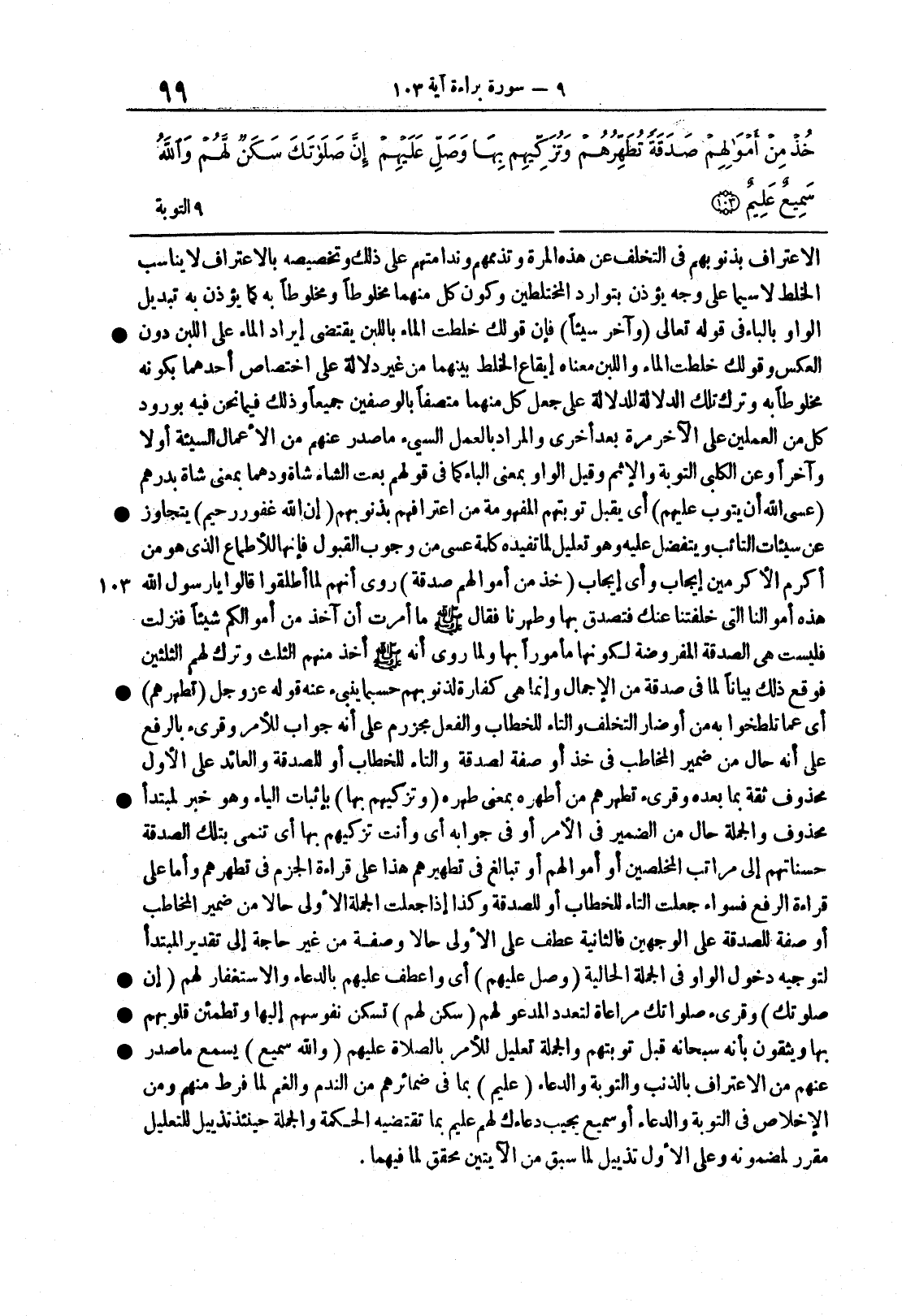 {خُذْ مِنْ أموالهم صَدَقَةً} روي أنهم لما أُطلقوا قالوا يا رسولَ الله هذه أموالُنا التي خلَّفتْنا عنك فتصدقْ بها وطهِّرْنا فقال صلى الله عليه وسلم ما أُمرتُ أن آخذَ من أموالكم شيئا فنزلت فليست هي الصدقةُ المفروضةُ لكونها مأموراً بها ولِما روى أنه صلى الله عليه وسلم أخذ منهم الثلثَ وتركَ لهم الثلثين فوقع ذلك بياناً لِما في صدقةً من الإجمال وإنما هي كفارةٌ لذنوبهم حسبما ينبيء عنه قوله عز وجل