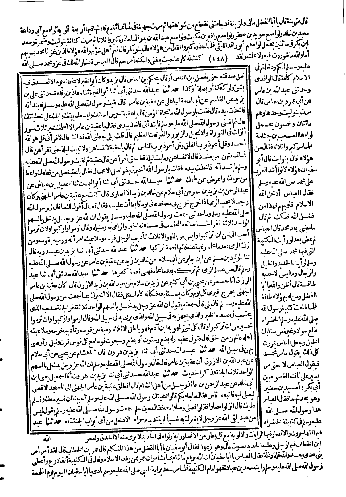 (17339) 17472- حَدَّثَنَا يَزِيدُ بْنُ هَارُونَ ، أَخْبَرَنَا إِسْمَاعِيلُ ، يَعْنِي ابْنَ أَبِي خَالِدٍ ، عَنْ عَبْدِ الرَّحْمَنِ بْنِ عَائِذٍ ، رَجُلٍ مِنْ أَهْلِ الشَّامِ ، قَالَ : انْطَلَقَ عُقْبَةُ بْنُ عَامِرٍ الْجُهَنِيُّ ، إِلَى الْمَسْجِدِ الأَقْصَى ، لِيُصَلِّيَ فِيهِ ، فَاتَّبَعَهُ نَاسٌ ، فَقَالَ : مَا جَاءَ بِكُمْ ؟ قَالُوا : صُحْبَتُكَ رَسُولَ اللهِ صَلَّى اللَّهُ عَلَيْهِ وَسَلَّمَ ، أَحْبَبْنَا أَنْ نَسِيرَ مَعَكَ وَنُسَلِّمَ عَلَيْكَ . قَالَ : انْزِلُوا فَصَلُّوا . فَنَزَلُوا فَصَلَّى وَصَلَّوْا مَعَهُ ، فَقَالَ حِينَ سَلَّمَ : سَمِعْتُ رَسُولَ اللهِ صَلَّى اللَّهُ عَلَيْهِ وَسَلَّمَ يَقُولُ : لَيْسَ مِنْ عَبْدٍ يَلْقَى اللَّهَ لاَ يُشْرِكُ بِهِ شَيْئًا ، لَمْ يَتَنَدَّ بِدَمٍ حَرَامٍ ، إِلاَّ دَخَلَ مِنْ أَيِّ أَبْوَابِ الْجَنَّةِ شَاءَ.