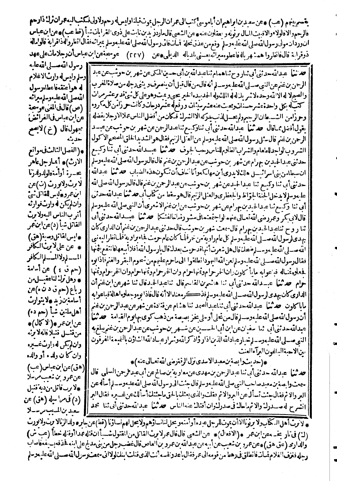 (17995) 18158- حَدَّثَنَا رَوْحٌ ، حَدَّثَنَا عَبْدُ الْحَمِيدِ بْنُ بَهْرَامٍ ، قَالَ : سَمِعْتُ شَهْرَ بْنَ حَوْشَبٍ ، قَالَ : حَدَّثَنِي عَبْدُ الرَّحْمَنِ بْنُ غَنْمٍ ، أَنَّ الدَّارِيَّ ، كَانَ يُهْدِي لِرَسُولِ اللهِ صَلَّى اللَّهُ عَلَيْهِ وَسَلَّمَ كُلَّ عَامٍ رَاوِيَةً مِنْ خَمْرٍ ، فَلَمَّا كَانَ عَامَ حُرِّمَتْ ، فَجَاءَ بِرَاوِيَةٍ فَلَمَّا نَظَرَ إِلَيْهِ ضَحِكَ قَالَ : هَلْ شَعَرْتَ أَنَّهَا قَدْ حُرِّمَتْ بَعْدَكَ ؟ قَالَ : يَا رَسُولَ اللهِ ، أَفَلاَ أَبِيعُهَا فَأَنْتَفِعَ بِثَمَنِهَا ؟ فَقَالَ رَسُولُ اللهِ صَلَّى اللَّهُ عَلَيْهِ وَسَلَّمَ : لَعَنَ اللَّهُ الْيَهُودَ ، لَعَنَ اللَّهُ الْيَهُودَ ، لَعَنَ اللَّهُ الْيَهُودَ ، انْطَلَقُوا إِلَى مَا حُرِّمَ عَلَيْهِمْ مِنْ شُحُومِ الْبَقَرِ ، وَالْغَنَمِ ، فَأَذَابُوهُ ، فَجَعَلُوهُ ثَمَنًا لَهُ ، فَبَاعُوا بِهِ مَا يَأْكُلُونَ ، وَإِنَّ الْخَمْرَ حَرَامٌ ، وَثَمَنَهَا حَرَامٌ ، وَإِنَّ الْخَمْرَ حَرَامٌ ، وَثَمَنَهَا حَرَامٌ ، وَإِنَّ الْخَمْرَ حَرَامٌ وَثَمَنَهَا حَرَامٌ.