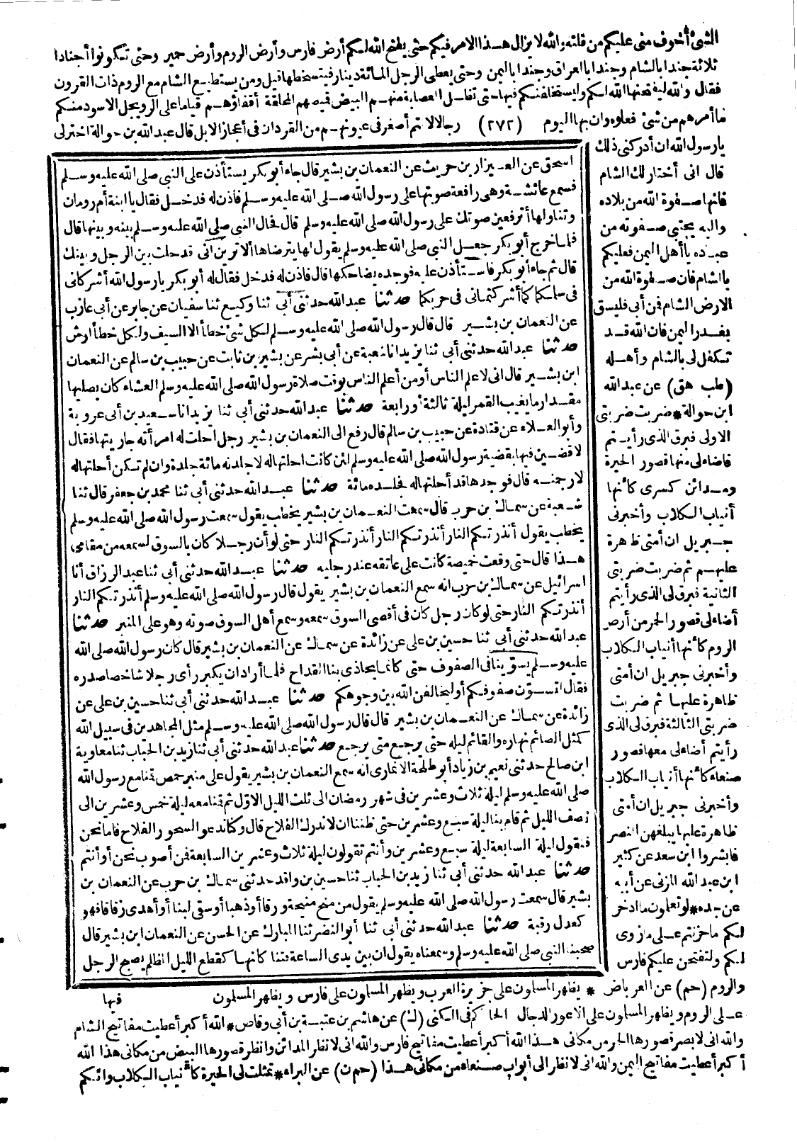 (18402) 18592- حَدَّثَنَا زَيْدُ بْنُ الْحُبَابِ ، حَدَّثَنَا مُعَاوِيَةُ بْنُ صَالِحٍ ، حَدَّثَنِي نُعَيْمُ بْنُ زِيَادٍ أَبُو طَلْحَةَ الأَنْمَارِيُّ ، أَنَّهُ سَمِعَ النُّعْمَانَ بْنَ بَشِيرٍ ، يَقُولُ عَلَى مِنْبَرِ حِمْصَ : قُمْنَا مَعَ رَسُولِ اللهِ صَلَّى اللَّهُ عَلَيْهِ وَسَلَّمَ ، لَيْلَةَ ثَلاَثٍ وَعِشْرِينَ فِي شَهْرِ رَمَضَانَ إِلَى ثُلُثِ اللَّيْلِ الأَوَّلِ ، ثُمَّ قُمْنَا مَعَهُ لَيْلَةَ خَمْسٍ وَعِشْرِينَ إِلَى نِصْفِ اللَّيْلِ ، ثُمَّ قَامَ بِنَا لَيْلَةَ سَبْعٍ وَعِشْرِينَ حَتَّى ظَنَنَّا أَنْ لاَ نُدْرِكَ الْفَلاَحَ ، قَالَ : وَكُنَّا نَدْعُو السُّحُورَ الْفَلاَحَ فَأَمَّا نَحْنُ فَنَقُولُ : لَيْلَةُ السَّابِعَةِ لَيْلَةُ سَبْعٍ وَعِشْرِينَ ، وَأَنْتُمْ تَقُولُونَ : لَيْلَةُ ثَلاَثٍ وَعِشْرِينَ السَّابِعَةُ ، فَمَنْ أَصَوْبُ نَحْنُ ، أَوْ أَنْتُمْ.