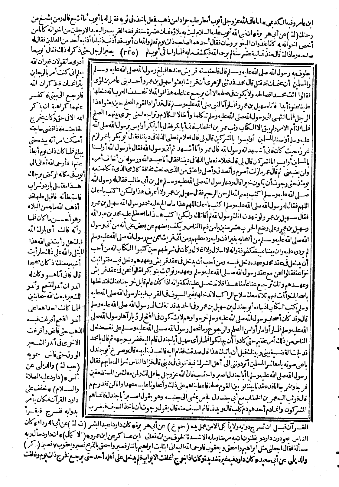 يَطُوفَ بِهِ رَسُولُ اللهِ صَلَّى اللَّهُ عَلَيْهِ وَسَلَّمَ . قَالَ : فَاحْتَبَسَتْهُ قُرَيْشٌ عِنْدَهَا ، فَبَلَغَ رَسُولَ اللهِ صَلَّى اللَّهُ عَلَيْهِ وَسَلَّمَ وَالْمُسْلِمِينَ أَنَّ عُثْمَانَ قَدْ قُتِلَ . قَالَ مُحَمَّدٌ : فَحَدَّثَنِي الزُّهْرِيُّ : أَنَّ قُرَيْشًا بَعَثُوا سُهَيْلَ بْنَ عَمْرٍو ، أَحَدَ بَنِي عَامِرِ بْنِ لُؤَيٍّ ، فَقَالُوا : ائْتِ مُحَمَّدًا فَصَالِحْهُ ، وَلاَ يَكُونُ فِي صُلْحِهِ إِلاَّ أَنْ يَرْجِعَ عَنَّا عَامَهُ هَذَا ، فَوَاللَّهِ لاَ تَتَحَدَّثُ الْعَرَبُ أَنَّهُ دَخَلَهَا عَلَيْنَا عَنْوَةً أَبَدًا ، فَأَتَاهُ سُهَيْلُ بْنُ عَمْرٍو ، فَلَمَّا رَآهُ النَّبِيُّ صَلَّى اللَّهُ عَلَيْهِ وَسَلَّمَ قَالَ : قَدْ أَرَادَ الْقَوْمُ الصُّلْحَ حِينَ بَعَثُوا هَذَا الرَّجُلَ ، فَلَمَّا انْتَهَى إِلَى رَسُولِ اللهِ صَلَّى اللَّهُ عَلَيْهِ وَسَلَّمَ تَكَلَّمَا ، وَأَطَالاَ الْكَلاَمَ ، وَتَرَاجَعَا حَتَّى جَرَى بَيْنَهُمَا الصُّلْحُ ، فَلَمَّا الْتَأَمَ الأَمْرُ وَلَمْ يَبْقَ إِلاَّ الْكِتَابُ وَثَبَ عُمَرُ بْنُ الْخَطَّابِ ، فَأَتَى أَبَا بَكْرٍ ، فَقَالَ : يَا أَبَا بَكْرٍ ، أَوَلَيْسَ بِرَسُولِ اللهِ صَلَّى اللَّهُ عَلَيْهِ وَسَلَّمَ ؟ أَوَلَسْنَا بِالْمُسْلِمِينَ ؟ أَوَلَيْسُوا بِالْمُشْرِكِينَ ؟ قَالَ : بَلَى . قَالَ : فَعَلاَمَ نُعْطِي الذِّلَّةَ فِي دِينِنَا . فَقَالَ أَبُو بَكْرٍ : يَا عُمَرُ الْزَمْ غَرْزَهُ حَيْثُ كَانَ ، فَإِنِّي أَشْهَدُ أَنَّهُ رَسُولُ اللهِ . قَالَ عُمَرُ : وَأَنَا أَشْهَدُ ، ثُمَّ أَتَى رَسُولَ اللهِ صَلَّى اللَّهُ عَلَيْهِ وَسَلَّمَ ، فَقَالَ : يَا رَسُولَ اللهِ ، أَوَلَسْنَا بِالْمُسْلِمِينَ ؟ أَوَلَيْسُوا بِالْمُشْرِكِينَ ؟ قَالَ : بَلَى ، قَالَ : فَعَلاَمَ نُعْطِي الذِّلَّةَ فِي دِينِنَا ؟ فَقَالَ : أَنَا عَبْدُ اللهِ وَرَسُولُهُ ، لَنْ أُخَالِفَ أَمْرَهُ ، وَلَنْ يُضَيِّعَنِي ثُمَّ قَالَ عُمَرُ : مَا زِلْتُ أَصُومُ وَأَتَصَدَّقُ وَأُصَلِّي وَأَعْتِقُ مِنَ الَّذِي صَنَعْتُ مَخَافَةَ كَلاَمِي الَّذِي تَكَلَّمْتُ بِهِ يَوْمَئِذٍ حَتَّى رَجَوْتُ أَنْ يَكُونَ خَيْرًا . قَالَ : وَدَعَا رَسُولُ اللهِ صَلَّى اللَّهُ عَلَيْهِ وَسَلَّمَ عَلِيَّ بْنَ أَبِي طَالِبٍ ، فَقَالَ لَهُ رَسُولُ اللهِ صَلَّى اللَّهُ عَلَيْهِ وَسَلَّمَ : اكْتُبْ بِسْمِ اللهِ الرَّحْمَنِ الرَّحِيمِ فَقَالَ سُهَيْلُ بْنُ عَمْرٍو : لاَ أَعْرِفُ هَذَا ، وَلَكِنْ اكْتُبْ بِاسْمِكَ اللَّهُمَّ ، فَقَالَ لَهُ رَسُولُ اللهِ صَلَّى اللَّهُ عَلَيْهِ وَسَلَّمَ : اكْتُبْ بِاسْمِكَ اللَّهُمَّ ، هَذَا مَا صَالَحَ عَلَيْهِ مُحَمَّدٌ رَسُولُ اللهِ سُهَيْلَ بْنَ عَمْرٍو فَقَالَ سُهَيْلُ بْنُ عَمْرٍو : لَوْ شَهِدْتُ أَنَّكَ رَسُولُ اللهِ لَمْ أُقَاتِلْكَ ، وَلَكِنْ اكْتُبْ : هَذَا مَا اصْطَلَحَ عَلَيْهِ مُحَمَّدُ بْنُ عَبْدِ اللهِ وَسُهَيْلُ بْنُ عَمْرٍو عَلَى وَضْعِ الْحَرْبِ عَشْرَ سِنِينَ ، يَأْمَنُ فِيهَا النَّاسُ ، وَيَكُفُّ بَعْضُهُمْ عَنْ بَعْضٍ ، عَلَى أَنَّهُ مَنْ أَتَى رَسُولَ اللهِ صَلَّى اللَّهُ عَلَيْهِ وَسَلَّمَ مِنْ أَصْحَابِهِ بِغَيْرِ إِذْنِ وَلِيِّهِ رَدَّهُ عَلَيْهِمْ ، وَمَنْ أَتَى قُرَيْشًا مِمَّنْ مَعَ رَسُولِ اللهِ صَلَّى اللَّهُ عَلَيْهِ وَسَلَّمَ لَمْ يَرُدُّوهُ عَلَيْهِ ، وَإِنَّ بَيْنَنَا عَيْبَةً مَكْفُوفَةً ، وَإِنَّهُ لاَ إِسْلاَلَ وَلاَ إِغْلاَلَ . وَكَانَ فِي شَرْطِهِمْ حِينَ كَتَبُوا الْكِتَابَ أَنَّهُ مَنْ أَحَبَّ أَنْ يَدْخُلَ فِي عَقْدِ مُحَمَّدٍ وَعَهْدِهِ دَخَلَ فِيهِ ، وَمَنْ أَحَبَّ أَنْ يَدْخُلَ فِي عَقْدِ قُرَيْشٍ وَعَهْدِهِمْ دَخَلَ فِيهِ ، فَتَوَاثَبَتْ خُزَاعَةُ فَقَالُوا : نَحْنُ مَعَ عَقْدِ رَسُولِ اللهِ صَلَّى اللَّهُ عَلَيْهِ وَسَل