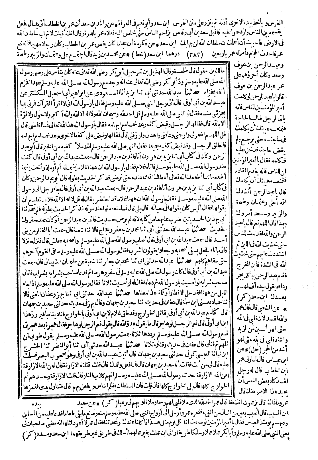 (19415) 19635- حَدَّثَنَا أَبُو النَّضْرِ ، حَدَّثَنَا الْحَشْرَجُ بْنُ نُبَاتَةَ الْعَبْسِيُّ كُوفِيٌّ ، حَدَّثَنِي سَعِيدُ بْنُ جُمْهَانَ قَالَ : أَتَيْتُ عَبْدَ اللهِ بْنَ أَبِي أَوْفَى وَهُوَ مَحْجُوبُ الْبَصَرِ ، فَسَلَّمْتُ عَلَيْهِ ، قَالَ لِي : مَنْ أَنْتَ ؟ فَقُلْتُ : أَنَا سَعِيدُ بْنُ جُمْهَانَ ، قَالَ : فَمَا فَعَلَ وَالِدُكَ ؟ قَالَ : قُلْتُ : قَتَلَتْهُ الأَزَارِقَةُ ، قَالَ : لَعَنَ اللَّهُ الأَزَارِقَةَ ، لَعَنَ اللَّهُ الأَزَارِقَةَ ، حَدَّثَنَا رَسُولُ اللهِ صَلَّى اللَّهُ عَلَيْهِ وَسَلَّمَ أَنَّهُمْ كِلاَبُ النَّارِ ، قَالَ : قُلْتُ : الأَزَارِقَةُ وَحْدَهُمْ أَمِ الْخَوَارِجُ كُلُّهَا ؟ قَالَ : بَلِ الْخَوَارِجُ كُلُّهَا . قَالَ : قُلْتُ : فَإِنَّ السُّلْطَانَ يَظْلِمُ النَّاسَ ، وَيَفْعَلُ بِهِمْ ، قَالَ : فَتَنَاوَلَ يَدِي فَغَمَزَهَا بِيَدِهِ غَمْزَةً شَدِيدَةً ، ثُمَّ قَالَ : وَيْحَكَ يَا ابْنَ جُمْهَانَ عَلَيْكَ بِالسَّوَادِ الأَعْظَمِ ، عَلَيْكَ بِالسَّوَادِ الأَعْظَمِ إِنْ كَانَ السُّلْطَانُ يَسْمَعُ مِنْكَ ، فَأْتِهِ فِي بَيْتِهِ ، فَأَخْبِرْهُ بِمَا تَعْلَمُ ، فَإِنْ قَبِلَ مِنْكَ ، وَإِلاَّ فَدَعْهُ ، فَإِنَّكَ لَسْتَ بِأَعْلَمَ مِنْهُ.