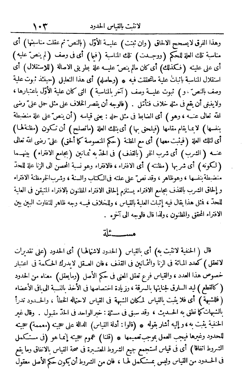 قَالَ (الْحَنَفِيَّة لَا تثبت بِهِ) أَي بِالْقِيَاسِ (الْحُدُود لاشتمالها) أَي الْحُدُود (على تقديرات لَا تعقل) كعدد الْمِائَة فِي الزِّنَا والثمانين فِي الْقَذْف، فَإِن الْعقل لَا يدْرك الْحِكْمَة فِي اعْتِبَار خُصُوص هَذَا الْعدَد، وَالْقِيَاس فرع تعقل الْمَعْنى فِي حكم الأَصْل (وَمَا يعقل) مَعْنَاهُ من الْحُدُود (كالقطع) ليد السَّارِق لجنايتها بِالسَّرقَةِ، وَزِيَادَة اختصاصها فِي الْأَخْذ بِالنِّسْبَةِ إِلَى بَاقِي الْأَعْضَاء (فللشبهة) أَي فَلَا يثبت بِالْقِيَاسِ لمَكَان الشُّبْهَة فِي الْقيَاس لاحْتِمَاله الْخَطَأ، وَالْحُدُود تدرأ بِالشُّبُهَاتِ كَمَا نطق بِهِ الحَدِيث، وَقد سبق فِي مسئلة: خبر الْوَاحِد فِي الْحَد مَقْبُول. وَقَالَ غير الْحَنَفِيَّة يثبت بِهِ، وَإِلَيْهِ أَشَارَ بقوله (قَالُوا: أَدِلَّة الْقيَاس) الدَّالَّة على حجتيه (معممة) حجيته للحدود وَغَيرهَا فَيجب الْعَمَل بِمُوجب تعميمها (قُلْنَا) عُمُوم حجيته إِنَّمَا هُوَ (فِي مُسْتَكْمل الشُّرُوط اتِّفَاقًا) أَي فِي قِيَاس استجمع جَمِيع الشُّرُوط الْمُعْتَبرَة فِي صِحَة الْقيَاس بالِاتِّفَاقِ وَمَا يَقع فِي الْحُدُود من الْقيَاس وَلَيْسَ بمستكمل لَهَا، فَإِن من الشُّرُوط أَن يكون حكم الأَصْل مَعْقُول