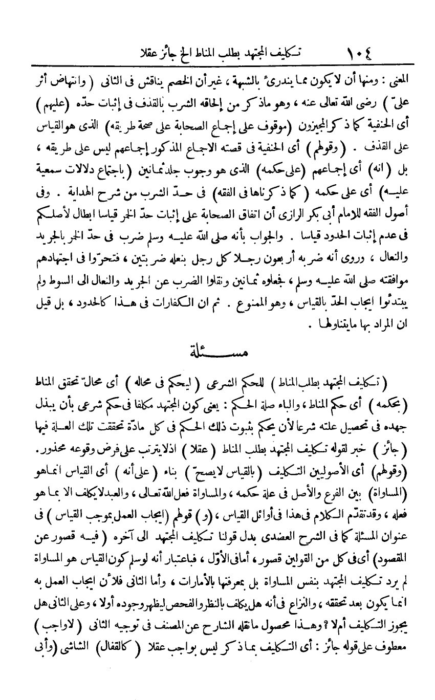 (تَكْلِيف الْمُجْتَهد بِطَلَب المناط) للْحكم الشَّرْعِيّ (ليحكم فِي محاله) أَي محَال تحقق المناط (بِحكمِهِ) أَي حكم المناط، وَالْبَاء صلَة الحكم: يَعْنِي كَون الْمُجْتَهد مُكَلّفا فِي حكم شَرْعِي بِأَن يبْذل جهده فِي تَحْصِيل علته شرعا لِأَن يحكم بِثُبُوت ذَلِك الحكم فِي كل مَادَّة تحققت تِلْكَ الْعلَّة فِيهَا (جَائِز) خبر لقَوْله تَكْلِيف الْمُجْتَهد بِطَلَب المناط (عقلا) إِذْ لَا يَتَرَتَّب على فرض وُقُوعه مَحْذُور. (وَقَوْلهمْ) أَي الْأُصُولِيِّينَ التَّكْلِيف (بِالْقِيَاسِ لَا يَصح) بِنَاء (على أَنه) أَي الْقيَاس إِنَّمَا هُوَ (الْمُسَاوَاة) بَين الْفَرْع وَالْأَصْل فِي عِلّة حكمه، والمساواة فعل الله تَعَالَى، وَالْعَبْد لَا يُكَلف إِلَّا بِمَا هُوَ فعله، وَقد تقدم الْكَلَام فِي هَذَا فِي أَوَائِل الْقيَاس، (و) قَوْلهم (إِيجَاب الْعَمَل بِمُوجب الْقيَاس) فِي عنوان المسئلة كَمَا فِي الشَّرْح العضدي بدل قَوْلنَا تَكْلِيف الْمُجْتَهد إِلَى آخِره (فِيهِ قُصُور عَن الْمَقْصُود) أَي فِي كل من الْقَوْلَيْنِ قُصُور، أما فِي الأول، فباعتبار أَنه لَو سلم كَون الْقيَاس هُوَ الْمُسَاوَاة لم يرد تَكْلِيف الْمُجْتَهد بِنَفس الْمُسَاوَاة بل بمعرفتها بالأمارات، وَأما الثَّانِي فَلِأَن إِيجَاب الْعَمَل بِهِ إِنَّمَا يكون بعد تحَققه، والنزاع فِي أَنه هَل يُكَلف بِالنّظرِ والفحص ليظْهر وجوده أَولا، وعَلى الثَّانِي هَل يجوز التَّكْلِيف أم لَا؟ وَهَذَا محصول مَا نَقله الشَّارِح عَن المُصَنّف فِي تَوْجِيه الثَّانِي (لَا وَاجِب) مَعْطُوف على قَوْله جَائِز: أَي التَّكْلِيف بِمَا ذكر لَيْسَ بِوَاجِب عقلا (كالقفال) الشَّاشِي (وَأبي