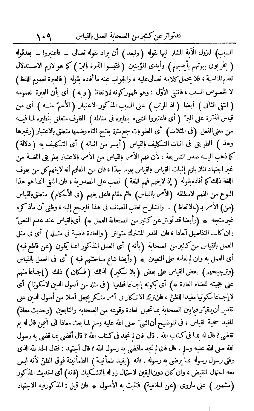 السَّبَب) لنزول الْآيَة الْمشَار إِلَيْهَا بقوله (ولبعد) أَن يُرَاد بقوله تَعَالَى - {فاعتبروا} - بعد قَوْله (يخربون بُيُوتهم بِأَيْدِيهِم) وأيدي الْمُؤمنِينَ (فقيسوا الذّرة بِالْبرِّ) كَمَا هُوَ لَازم الِاسْتِدْلَال لعدم الْمُنَاسبَة، فَلَا يحمل كَلَامه تَعَالَى عَلَيْهِ، وَالْجَوَاب عَنهُ مَا أَفَادَهُ بقوله (فَالْعِبْرَة لعُمُوم اللَّفْظ) لَا لخُصُوص السَّبَب، فَانْتفى الأول: وَهُوَ ظُهُور كَونه للاتعاظ (وَبِه) أَي بِأَن الْعبْرَة لعمومه (انْتَفَى الثَّانِي) أَيْضا (إِذْ الْمُرَتّب) على السَّبَب الْمَذْكُور الِاعْتِبَار (الْأَعَمّ مِنْهُ) أَي من قِيَاس الذّرة على الْبر (أَي فاعتبروا الشَّيْء بنظيره فِي مناطه) الظّرْف مُتَعَلق بنظيره لما فِيهِ من معنى الْفِعْل (فِي المثلات) أَي الْعُقُوبَات جمع مثلَة بِفَتْح الثَّاء وَضمّهَا مُتَعَلق بِالِاعْتِبَارِ (وَغَيرهَا وَهَذَا) الطَّرِيق فِي إِثْبَات التَّكْلِيف بِالْقِيَاسِ (أيسر من إثْبَاته) أَي التَّكْلِيف بِهِ (دلَالَة) كَمَا ذهب إِلَيْهِ صدر الشَّرِيعَة، لِأَن فهم الْأَمر بِالْقِيَاسِ من الْأَمر بِالِاعْتِبَارِ بطرِيق اللُّغَة من غير اجْتِهَاد لِئَلَّا يلْزم إِثْبَات الْقيَاس بِالْقِيَاسِ بعيد جدا، فَإِن من الْمَعْلُوم أَنه لَا يفهم كل من يعرف اللُّغَة ذَلِك كَمَا أَفَادَهُ بقوله (إِذْ لَا يفهم فهم اللُّغَة) نصب على المصدرية، فَإِن الْمَنْفِيّ إِنَّمَا هُوَ هَذَا النَّوْع من الْفَهم لَا مطلقه (الْأَمر بِالْقِيَاسِ) قَائِم مقَام فَاعل يفهم (فِي الْأَحْكَام) مُتَعَلق بِالْقِيَاسِ (من) الْأَمر ب (الاتعاظ). وَالشَّارِح تعقب المُصَنّف فِي هَذَا فَليرْجع إِلَيْهِ، وظني أَن مَا ذكره غير مُتَّجه (وَأَيْضًا قد تَوَاتر عَن كثير من الصَّحَابَة الْعَمَل بِهِ) أَي بِالْقِيَاسِ عِنْد عدم النَّص وَإِن كَانَت التفاصيل آحادا، فَإِن الْقدر الْمُشْتَرك متواتر (وَالْعَادَة قاضية فِي مثله) أَي فِي مثل الْعَمَل بِالْقِيَاسِ من كثير من الصَّحَابَة (بِأَنَّهُ) أَي الْعَمَل الْمَذْكُور إِنَّمَا يكون (عَن قَاطع فِيهِ) أَي الْعَمَل بِهِ وَإِن لم نعلمهُ على التَّعْيِين (وَأَيْضًا شاع مباحثتهم فِيهِ) أَي فِي الْعَمَل بِالْقِيَاسِ (وترجيحهم) بعض الْقيَاس على بعض (بِلَا نَكِير) لذَلِك (فَكَانَ) ذَلِك (إِجْمَاعًا مِنْهُم على حجيته لقَضَاء الْعَادة بِهِ) أَي بِكَوْنِهِ إِجْمَاعًا قَطْعِيا (فِي مثله من أصُول الدّين لَا سكُوتًا) أَي لَا إِجْمَاعًا سكوتيا مُفِيدا للظن، فَإِن ترك الْإِنْكَار فِي أَمر مُنكر يَجْعَل أصلا من أصُول الدّين على تَقْدِير أَن يَتَقَرَّر فِيمَا بَين الصَّحَابَة بِمَا تحيل الْعَادة وُقُوعه من الصَّحَابَة وَالتَّابِعِينَ (وَحَدِيث معَاذ) الْمُفِيد حجية الْقيَاس، فِي التَّوْضِيح أَن النَّبِي صلى الله عَلَيْهِ وَسلم لما بعث معَاذًا إِلَى الْيمن قَالَ لَهُ بِمَ تقضي؟ قَالَ لَهُ بِمَا فِي كتاب الله. قَالَ فَإِن لم تَجِد فِي كتاب الله؟ قَالَ أَقْْضِي بِمَا قضى بِهِ رَسُول الله صلى الله عَلَيْهِ وَسلم. قَالَ فَإِن لم تَجِد مَا قضى بِهِ رَسُول الله؟ قَالَ أجتهد: فَقَالَ الْحَمد لله الَّذِي وفْق رَسُول رَسُوله بِمَا يرضى بِهِ رَسُوله. فَإِنَّهُ (يُفِيد طمأنينة) الطُّمَأْنِينَة فَوق الظَّن لِأَنَّهُ لَيْسَ مَعَه احْتِمَال النقيض، وَإِن كَانَ دون الْيَقِين لاحْتِمَال زَوَاله بالتشكيك (فَإِنَّهُ) أَي الحَدِيث الْمَذْكُور (مَشْهُور) على مَا روى (عَن الْحَنَفِيَّة) فَتثبت بِهِ الْأُصُول فَإِن قيل: الْمَذْكُور فِيهِ الِاجْتِهَاد