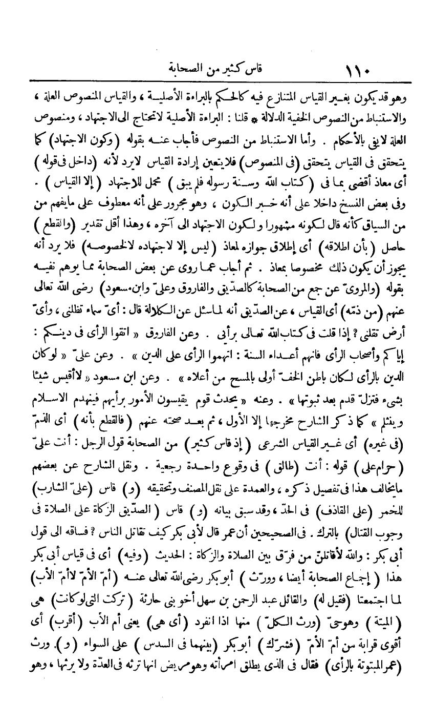 وَهُوَ قد يكون بِغَيْر الْقيَاس الْمُتَنَازع فِيهِ كَالْحكمِ بِالْبَرَاءَةِ الْأَصْلِيَّة، وَالْقِيَاس الْمَنْصُوص الْعلَّة، والاستنباط من النُّصُوص الْخفية الدّلَالَة قُلْنَا: الْبَرَاءَة الْأَصْلِيَّة لَا تحْتَاج إِلَى الِاجْتِهَاد، ومنصوص الْعلَّة لَا يَفِي بِالْأَحْكَامِ. وَأما الاستنباط من النُّصُوص فَأجَاب عَنهُ بقوله (وَكَون الِاجْتِهَاد) كَمَا يتَحَقَّق فِي الْقيَاس يتَحَقَّق (فِي الْمَنْصُوص) فَلَا يتَعَيَّن إِرَادَة الْقيَاس لَا يرد لِأَنَّهُ (دَاخل فِي قَوْله) أَي معَاذ أقضى بِمَا فِي (كتاب الله وَسنة رَسُوله فَلم يبْق) محمل للِاجْتِهَاد (إِلَّا الْقيَاس). وَفِي بعض النّسخ دَاخِلا على أَنه خبر الْكَوْن، وَهُوَ مجرور على أَنه مَعْطُوف على مَا يفهم من من السِّيَاق كَأَنَّهُ قَالَ لكَونه مَشْهُورا وَلكَون الِاجْتِهَاد إِلَى آخِره، وَهَذَا أقل تَقْدِير (وَالْقطع) حَاصِل (بِأَن إِطْلَاقه) أَي إِطْلَاق جَوَازه لِمعَاذ (لَيْسَ إِلَّا لاجتهاده لَا لخصوصه) فَلَا يرد أَنه يجوز أَن يكون ذَلِك مَخْصُوصًا بمعاذ. ثمَّ أجَاب عَمَّا روى عَن بعض الصَّحَابَة مِمَّا يُوهم نَفْيه بقوله (والمروي عَن جمع من الصَّحَابَة كالصديق والفاروق وَعلي وَابْن مَسْعُود) رَضِي الله تَعَالَى عَنْهُم (من ذمَّة) أَي الْقيَاس، عَن الصّديق أَنه لما سُئِلَ عَن الْكَلَالَة قَالَ: أَي سَمَاء تُظِلنِي، وَأي أَرض تُقِلني؟ إِذا قلت فِي كتاب الله تَعَالَى برأيي. وَعَن الْفَارُوق " اتَّقوا الرَّأْي فِي دينكُمْ: إيَّاكُمْ وَأَصْحَاب الرَّأْي فَإِنَّهُم أَعدَاء السّنة: اتهموا الرَّأْي على الدّين ". وَعَن عَليّ " لَو كَانَ الدّين بِالرَّأْيِ لَكَانَ بَاطِن الْخُف أولى بِالْمَسْحِ من أَعْلَاهُ ". وَعَن ابْن مَسْعُود " لَا أَقيس شَيْئا بِشَيْء فتزل قدم بعد ثُبُوتهَا ". وَعنهُ " يحدث قوم يقيسون الْأُمُور برأيهم فينهدم الْإِسْلَام وينثلم " كَمَا ذكر الشَّارِح مخرجها إِلَّا الأول، ثمَّ بعد صِحَّته عَنْهُم (فالقطع بِأَنَّهُ) أَي الذَّم (فِي غَيره) أَي غير الْقيَاس الشَّرْعِيّ (إِذْ قَاس كثير) من الصَّحَابَة قَول الرجل: أَنْت عَليّ (حرَام عَليّ) قَوْله: أَنْت (طَالِق) فِي وُقُوع وَاحِدَة رَجْعِيَّة. وَنقل الشَّارِح عَن بَعضهم مَا يُخَالف هَذَا فِي تَفْصِيل ذكره، والعمدة على نقل المُصَنّف وتحقيقه (و) قَاس (على الشَّارِب) للخمر (على الْقَاذِف) فِي الْحَد، وَقد سبق بَيَانه (و) قَاس (الصّديق الزَّكَاة على الصَّلَاة فِي وجوب الْقِتَال) بِالتّرْكِ. فِي الصَّحِيحَيْنِ أَن عمر قَالَ لأبي بكر كَيفَ تقَاتل النَّاس؟ فساقه إِلَى قَول أبي بكر: وَالله لأقاتلن من فرق بَين الصَّلَاة وَالزَّكَاة: الحَدِيث (وَفِيه) أَي فِي قِيَاس أبي بكر هَذَا (إِجْمَاع الصَّحَابَة أَيْضا، وَورث) أَبُو بكر رَضِي الله تَعَالَى عَنهُ (أم الْأُم لَا أم الْأَب) لما اجتمعتا (فَقيل لَهُ) وَالْقَائِل عبد الرَّحْمَن بن سهل أَخُو بني حَارِثَة (تركت الَّتِي لَو كَانَت) هِيَ (الْميتَة) وَهُوَ حَيّ (ورث الْكل) مِنْهَا إِذا انْفَرد (اي هِيَ) يَعْنِي أم الْأَب (أقرب) أَي أقوى قرَابَة من أم الْأُم (فشرك) أَبُو بكر (بَينهمَا فِي السُّدس) على السوَاء (و) ورث (عمر المبتوتة بِالرَّأْيِ) فَقَالَ فِي الَّذِي يُطلق امْرَأَته وَهُوَ مَرِيض أَنَّهَا تَرثه فِي الْعدة وَلَا يَرِثهَا، وَهُوَ