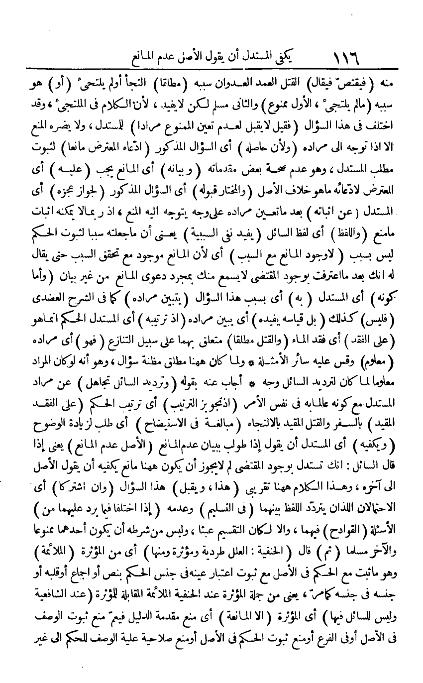 مِنْهُ (فيقتص فَيُقَال) الْقَتْل الْعمد الْعدوان سَببه (مُطلقًا) التجأ أَو لم يلتجئ (أَو) هُوَ سَببه (مَا لم يلتجئ، الأول مَمْنُوع) وَالثَّانِي مُسلم لَكِن لَا يُفِيد، لِأَن الْكَلَام فِي الملتجئ، وَقد اخْتلف فِي هَذَا السُّؤَال (فَقيل لَا يقبل لعدم تعين الْمَمْنُوع مرَادا) للمستدل، وَلَا يضرّهُ الْمَنْع إِلَّا إِذا توجه إِلَى مُرَاده (وَلِأَن حَاصله) أَي السُّؤَال الْمَذْكُور (ادِّعَاء الْمُعْتَرض مَانِعا) لثُبُوت مطلب الْمُسْتَدلّ، وَهُوَ عدم صِحَة بعض مقدماته (وَبَيَانه) أَي الْمَانِع يجب (عَلَيْهِ) أَي الْمُعْتَرض لادعائه مَا هُوَ خلاف الأَصْل (وَالْمُخْتَار قبُوله) أَي السُّؤَال الْمَذْكُور (لجَوَاز عَجزه) أَي الْمُسْتَدلّ (عَن إثْبَاته) بعد مَا تعين مُرَاده على وَجه يتَوَجَّه إِلَيْهِ الْمَنْع، إِذْ رُبمَا لَا يُمكنهُ إِثْبَات مَا منع (وَاللَّفْظ) أَي لفظ السَّائِل (يُفِيد نفي السَّبَبِيَّة) يَعْنِي أَن مَا جعلته سَببا لثُبُوت الحكم لَيْسَ بِسَبَب (لَا وجود الْمَانِع مَعَ السَّبَب) أَي لِأَن الْمَانِع مَوْجُود مَعَ تحقق السَّبَب حَتَّى يُقَال لَهُ إِنَّك بعد مَا اعْترفت بِوُجُود الْمُقْتَضى لَا يسمع مِنْك بِمُجَرَّد دَعْوَى الْمَانِع من غير بَيَان (وَأما كَونه) أَي الْمُسْتَدلّ (بِهِ) أَي بِسَبَب هَذَا السُّؤَال (يتَبَيَّن مُرَاده) كَمَا فِي الشَّرْح العضدي (فَلَيْسَ) كَذَلِك (بل قِيَاسه يفِيدهُ) أَي يبين مُرَاده (إِذْ ترتيبه) أَي الْمُسْتَدلّ الحكم إِنَّمَا هُوَ (على الْفَقْد) أَي فقد المَاء (وَالْقَتْل مُطلقًا) مُتَعَلق بهما على سَبِيل التَّنَازُع (فَهُوَ) أَي مُرَاده (مَعْلُوم) وَقس عَلَيْهِ سَائِر الْأَمْثِلَة وَلما كَانَ هَهُنَا مُطلق مَظَنَّة سُؤال، وَهُوَ أَنه لَو كَانَ المُرَاد مَعْلُوما لما كَانَ لترديد السَّائِل وَجه أجَاب عَنهُ بقوله (وترديد السَّائِل تجاهل) عَن مُرَاد الْمُسْتَدلّ مَعَ كَونه عَالما بِهِ فِي نفس الْأَمر (اذ تَجْوِيز التَّرْتِيب) أَي تَرْتِيب الحكم (على الْفَقْد الْمُقَيد) بِالسَّفرِ وَالْقَتْل الْمُقَيد بالالتجاء (مُبَالغَة فِي الاستيضاح) أَي طلب لزِيَادَة الوضوح (ويكفيه) أَي الْمُسْتَدلّ أَن يَقُول إِذا طُولِبَ بِبَيَان عدم الْمَانِع (الأَصْل عدم الْمَانِع) يَعْنِي إِذا قَالَ السَّائِل: إِنَّك تستدل بِوُجُود الْمُقْتَضى لم لَا يجوز أَن يكون هَهُنَا مَانع يَكْفِيهِ أَن يَقُول الأَصْل إِلَى آخِره، وَهَذَا الْكَلَام هَهُنَا تقريبي (هَذَا، وَيقبل) هَذَا السُّؤَال (وَإِن اشْتَركَا) أَي الاحتمالان اللَّذَان يتَرَدَّد اللَّفْظ بَينهمَا (فِي التَّسْلِيم) وَعَدَمه (إِذا اخْتلفَا فِيمَا يرد عَلَيْهِمَا من) الأسئلة (القوادح) فيهمَا، وَإِلَّا لَكَانَ التَّقْسِيم عَبَثا، وَلَيْسَ من شَرطه أَن يكون أَحدهمَا مَمْنُوعًا وَالْآخر مُسلما (ثمَّ) قَالَ (الْحَنَفِيَّة: الْعِلَل طردية ومؤثرة وَمِنْهَا) أَي من المؤثرة (الملائمة) وَهُوَ مَا ثَبت مَعَ الحكم فِي الأَصْل مَعَ ثُبُوت اعْتِبَار عينه فِي جنس الحكم بِنَصّ أَو إِجْمَاع أَو قلبه أَو جنسه فِي جنسه كَمَا مر، يَعْنِي من جملَة المؤثرة عِنْد الْحَنَفِيَّة الملائمة الْمُقَابلَة للمؤثرة (عِنْد الشَّافِعِيَّة وَلَيْسَ للسَّائِل فِيهَا) أَي المؤثرة (إِلَّا الْمَانِعَة) أَي منع مُقَدّمَة الدَّلِيل فَيعم منع ثُبُوت الْوَصْف فِي الأَصْل أَو فِي الْفَرْع أَو منع ثُبُوت الحكم فِي الأَصْل أَو منع صَلَاحِية علية الْوَصْف للْحكم إِلَى غير