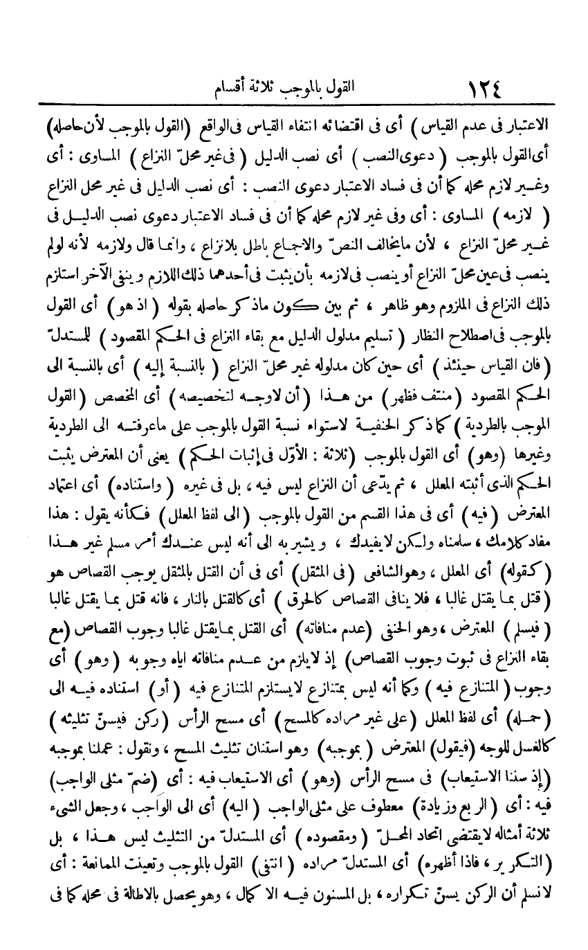 الِاعْتِبَار فِي عدم الْقيَاس) أَي فِي اقتضائه انْتِفَاء الْقيَاس فِي الْوَاقِع (القَوْل بِالْمُوجبِ لِأَن حَاصله) أَي القَوْل بِالْمُوجبِ (دَعْوَى النصب) أَي نصب الدَّلِيل (فِي غير مَحل النزاع) المساوى: أَي وَغير لَازم مَحَله كَمَا أَن فِي فَسَاد الِاعْتِبَار دَعْوَى النصب: أَي نصب الدَّلِيل فِي غير مَحل النزاع (لَازمه) الْمسَاوِي: أَي وَفِي غير لَازم مَحَله كَمَا أَن فِي فَسَاد الِاعْتِبَار دَعْوَى نصب الدَّلِيل فِي غير مَحل النزاع، لِأَن مَا يُخَالف النَّص وَالْإِجْمَاع بَاطِل بِلَا نزاع، وَإِنَّمَا قَالَ ولازمه لِأَنَّهُ لَو لم ينصب فِي عين مَحل النزاع أَو ينصب فِي لَازمه بِأَن يثبت فِي أَحدهمَا ذَلِك اللَّازِم وينفي الآخر استلزم ذَلِك النزاع فِي الْمَلْزُوم وَهُوَ ظَاهر، ثمَّ بَين كَون مَا ذكر حَاصله بقوله (إِذْ هُوَ) أَي القَوْل بِالْمُوجبِ فِي اصْطِلَاح النظار (تَسْلِيم مَدْلُول الدَّلِيل مَعَ بَقَاء النزاع فِي الحكم الْمَقْصُود) للمستدل (فَإِن الْقيَاس حِينَئِذٍ) أَي حِين كَانَ مَدْلُوله غير مَحل النزاع (بِالنِّسْبَةِ إِلَيْهِ) أَي بِالنِّسْبَةِ إِلَى الحكم الْمَقْصُود (مُنْتَفٍ فَظهر) من هَذَا (أَن لَا وَجه لتخصيصه) أَي الْمُخَصّص (القَوْل) الْمُوجب بالطردية) كَمَا ذكر الْحَنَفِيَّة لِاسْتِوَاء نِسْبَة القَوْل بِالْمُوجبِ على مَا عَرفته إِلَى الطردية وَغَيرهَا (وَهُوَ) أَي القَوْل بِالْمُوجبِ (ثَلَاثَة: الأول فِي إِثْبَات الحكم) يَعْنِي أَن الْمُعْتَرض يثبت الحكم الَّذِي أثْبته الْمُعَلل، ثمَّ يدعى أَن النزاع لَيْسَ فِيهِ، بل فِي غَيره (واستناده) أَي اعْتِمَاد الْمُعْتَرض (فِيهِ) أَي فِي هَذَا الْقسم من القَوْل بِالْمُوجبِ (إِلَى لفظ الْمُعَلل) فَكَأَنَّهُ يَقُول: هَذَا مفَاد كلامك، سلمناه وَلَكِن لَا يفيدك، وَيُشِير بِهِ إِلَى أَنه لَيْسَ عنْدك أَمر مُسلم غير هَذَا (كَقَوْلِه) أَي الْمُعَلل، وَهُوَ الشَّافِعِي (فِي المثقل) أَي فِي ان الْقَتْل بالمثقل يُوجب الْقصاص هُوَ (قتل بِمَا يقتل غَالِبا، فَلَا يُنَافِي الْقصاص كالحرق) أَي كَالْقَتْلِ بالنَّار، فَإِنَّهُ قتل بِمَا يقتل غَالِبا (فَيسلم) الْمُعْتَرض، وَهُوَ الْحَنَفِيّ (عدم منافاته) أَي الْقَتْل بِمَا يقتل غَالِبا وجوب الْقصاص (مَعَ بَقَاء النزاع فِي ثُبُوت وجوب الْقصاص) إِذْ لَا يلْزم من عدم منافاته إِيَّاه وُجُوبه (وَهُوَ) أَي وجوب (الْمُتَنَازع فِيهِ) وكما أَنه لَيْسَ بمتنازع لَا يسْتَلْزم الْمُتَنَازع فِيهِ (أَو) استناده فِيهِ إِلَى (حمله) أَي لفظ الْمُعَلل (على غير مُرَاده كالمسح) أَي مسح الرَّأْس (ركن فَيسنّ تثليثه) كالغسل للْوَجْه (فَيَقُول) الْمُعْتَرض (بِمُوجبِه) وَهُوَ استنان تثليث الْمسْح، ونقول: عَملنَا بِمُوجبِه (إِذْ سننا الِاسْتِيعَاب) فِي مسح الرَّأْس (وَهُوَ) أَي الِاسْتِيعَاب فِيهِ: أَي (ضم مثلي الْوَاجِب) فِيهِ: أَي (الرّبع وَزِيَادَة) مَعْطُوف على مثلي الْوَاجِب (إِلَيْهِ) أَي إِلَى الْوَاجِب، وَجعل الشَّيْء ثَلَاثَة أَمْثَاله لَا يقتضى اتِّحَاد الْمحل (ومقصوده) أَي الْمُسْتَدلّ من التَّثْلِيث لَيْسَ هَذَا، بل (التكرير، فَإِذا أظهره) أَي الْمُسْتَدلّ مُرَاده (انْتَفَى) القَوْل بِالْمُوجبِ وتعينت الممانعة: أَي لَا نسلم أَن الرُّكْن يسن تكراره، بل الْمسنون فِيهِ إِلَّا كَمَال، وَهُوَ يحصل بالإطالة فِي مَحَله كَمَا فِي