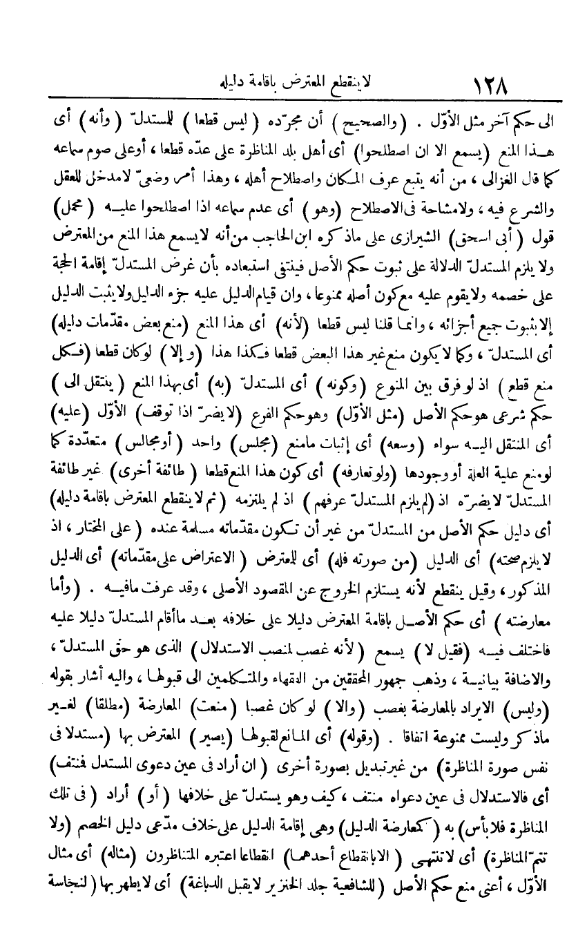 إِلَى حكم آخر مثل الأول. (وَالصَّحِيح) أَن مجرده (لَيْسَ قطعا) للمستدل (وَأَنه) أَي هَذَا الْمَنْع (يسمع إِلَّا أَن اصْطَلحُوا) أَي أهل بلد المناظرة على عده قطعا، أَو على صَوْم سَمَاعه كَمَا قَالَ الْغَزالِيّ، من أَنه يتبع عرف الْمَكَان واصطلاح أَهله، وَهَذَا أَمر وضعي لَا مدْخل لِلْعَقْلِ وَالشَّرْع فِيهِ، وَلَا مشاحة فِي الِاصْطِلَاح (وَهُوَ) أَي عدم سَمَاعه إِذا اصْطَلحُوا عَلَيْهِ (محمل) قَول (أبي إِسْحَق) الشِّيرَازِيّ على مَا ذكره ابْن الْحَاجِب من أَنه لَا يسمع هَذَا الْمَنْع من الْمُعْتَرض وَلَا يلْزم الْمُسْتَدلّ الدّلَالَة على ثُبُوت حكم الأَصْل فينتفى استبعاده بِأَن غَرَض الْمُسْتَدلّ إِقَامَة الْحجَّة على خَصمه وَلَا يقوم عَلَيْهِ مَعَ كَون أَصله مَمْنُوعًا، وَأَن قيام الدَّلِيل عَلَيْهِ جُزْء الدَّلِيل وَلَا يثبت الدَّلِيل إِلَّا بِثُبُوت جَمِيع أَجْزَائِهِ، وَإِنَّمَا قُلْنَا لَيْسَ قطعا (لِأَنَّهُ) أَي هَذَا الْمَنْع (منع بعض مُقَدمَات دَلِيله) أَي الْمُسْتَدلّ، وكما لَا يكون منع غير هَذَا الْبَعْض قطعا فَكَذَا وَهَذَا (وَإِلَّا) لَو كَانَ قطعا (فَكل منع قطع) إِذْ لَو فرق بَين المنوع (وَكَونه) أَي الْمُسْتَدلّ (بِهِ) أَي بِهَذَا الْمَنْع (ينْتَقل إِلَى) حكم شَرْعِي هُوَ حكم الأَصْل (مثل الأول) وَهُوَ حكم الْفَرْع (لَا يضر إِذا توقف) الأول (عَلَيْهِ) أَي الْمُنْتَقل إِلَيْهِ سَوَاء (وَسعه) أَي إِثْبَات مَا منع (مجْلِس) وَاحِد (أَو مجَالِس) مُتعَدِّدَة كَمَا لَو منع علية الْعلَّة أَو وجودهَا (وَلَو تعارفه) أَي كَون هَذَا الْمَنْع قطعا (طَائِفَة أُخْرَى) غير طَائِفَة الْمُسْتَدلّ لَا يضرّهُ إِذْ (لم يلْزم الْمُسْتَدلّ عرفهم) إِذْ لم يلتزمه (ثمَّ لَا يَنْقَطِع الْمُعْتَرض بِإِقَامَة دَلِيله) أَي دَلِيل حكم الأَصْل من الْمُسْتَدلّ من غير أَن تكون مقدماته مسلمة عِنْده (على الْمُخْتَار، إِذْ لَا يلْزم صِحَّته) أَي الدَّلِيل (من صورته فَلهُ) أَي للمعترض (الِاعْتِرَاض على مقدماته) أَي الدَّلِيل الْمَذْكُور، وَقيل يَنْقَطِع لِأَنَّهُ يسْتَلْزم الْخُرُوج عَن الْمَقْصُود الْأَصْلِيّ، وَقد عرفت مَا فِيهِ. (وَأما معارضته) أَي حكم الأَصْل بِإِقَامَة الْمُعْتَرض دَلِيلا على خِلَافه بعد مَا أَقَامَ الْمُسْتَدلّ دَلِيلا عَلَيْهِ فَاخْتلف فِيهِ (فَقيل لَا) يسمع (لِأَنَّهُ غصب لمنصب الِاسْتِدْلَال) الَّذِي هُوَ حق الْمُسْتَدلّ، وَالْإِضَافَة بَيَانِيَّة، وَذهب جُمْهُور الْمُحَقِّقين من الْفُقَهَاء والمتكلمين إِلَى قبُولهَا، وَإِلَيْهِ أَشَارَ بقوله (وَلَيْسَ) الْإِيرَاد بالمعارضة بِغَصب (وَإِلَّا) لَو كَانَ غصبا (منعت) الْمُعَارضَة (مُطلقًا) لغير مَا ذكر وَلَيْسَت مَمْنُوعَة اتِّفَاقًا. (وَقَوله) أَي الْمَانِع لقبولها (يصير) الْمُعْتَرض بهَا (مستدلا فِي نفس صُورَة المناظرة) من غير تَبْدِيل بِصُورَة أُخْرَى (إِن أَرَادَ فِي عين دَعْوَى الْمُسْتَدلّ فمنتف) أَي فالاستدلال فِي عين دَعْوَاهُ مُنْتَفٍ، كَيفَ وَهُوَ يسْتَدلّ على خلَافهَا (أَو) أَرَادَ (فِي تِلْكَ المناظرة فَلَا بَأْس) بِهِ (كمعارضة الدَّلِيل) وَهِي إِقَامَة الدَّلِيل على خلاف مدعي دَلِيل الْخصم (وَلَا تتمّ المناظرة) أَي لَا تَنْتَهِي (إِلَّا بِانْقِطَاع أَحدهمَا) انْقِطَاعًا اعْتَبرهُ المتناظرون (مِثَاله) أَي مِثَال الأول، أَعنِي منع حكم الأَصْل (للشَّافِعِيَّة جلد الْخِنْزِير لَا يقبل الدباغة) أَي لَا يطهر بهَا (لنجاسة