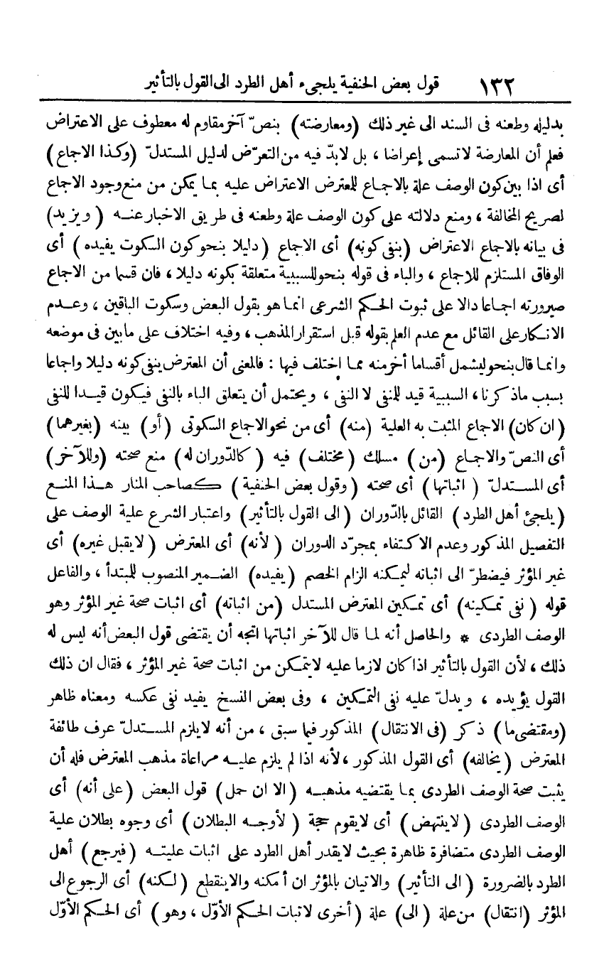 بدليله وطعنه فِي السَّنَد إِلَى غير ذَلِك (ومعارضته) بِنَصّ آخر مقاوم لَهُ مَعْطُوف على الِاعْتِرَاض فَعلم أَن الْمُعَارضَة لَا تسمى إعْرَاضًا، بل لَا بُد فِيهِ من التَّعَرُّض لدَلِيل الْمُسْتَدلّ (وَكَذَا الْإِجْمَاع) أَي إِذا بَين كَون الْوَصْف عِلّة بِالْإِجْمَاع للمعترض الِاعْتِرَاض عَلَيْهِ بِمَا يُمكن من منع وجود الْإِجْمَاع لصريح الْمُخَالفَة، وَمنع دلَالَته على كَون الْوَصْف عِلّة وطعنه فِي طَرِيق الْإِخْبَار عَنهُ (وَيزِيد) فِي بَيَانه بِالْإِجْمَاع الِاعْتِرَاض (بِنَفْي كَونه) أَي الْإِجْمَاع (دَلِيلا بِنَحْوِ كَون السُّكُوت يفِيدهُ) أَي الْوِفَاق المستلزم للْإِجْمَاع، وَالْبَاء فِي قَوْله بِنَحْوِ للسَّبَبِيَّة مُتَعَلقَة بِكَوْنِهِ دَلِيلا، فَإِن قسما من الْإِجْمَاع صَيْرُورَته إِجْمَاعًا دَالا على ثُبُوت الحكم الشَّرْعِيّ إِنَّمَا هُوَ بقول الْبَعْض وسكوت البَاقِينَ، وَعدم الْإِنْكَار على الْقَائِل مَعَ عدم الْعلم بقوله قبل اسْتِقْرَار الْمَذْهَب، وَفِيه اخْتِلَاف على مَا بَين فِي مَوْضِعه وَإِنَّمَا قَالَ بِنَحْوِ ليشْمل أقساما أخر مِنْهُ مِمَّا اخْتلف فِيهِ: فَالْمَعْنى أَن الْمُعْتَرض يَنْفِي كَونه دَلِيلا وإجماعا بِسَبَب مَا ذكرنَا، السَّبَبِيَّة قيد للمنفي لَا النَّفْي، وَيحْتَمل أَن يتَعَلَّق الْبَاء بِالنَّفْيِ فَيكون قيدا للنَّفْي (إِن كَانَ) الْإِجْمَاع الْمُثبت بِهِ الْعلية (مِنْهُ) أَي من نَحْو الْإِجْمَاع السكوتي (أَو) بَينه (بِغَيْرِهِمَا) أَي النَّص وَالْإِجْمَاع (من) مَسْلَك (مُخْتَلف) فِيهِ (كالدوران لَهُ) منع صِحَّته (وَللْآخر) أَي الْمُسْتَدلّ (إِثْبَاتهَا) أَي صِحَّته (وَقَول بعض الْحَنَفِيَّة) كصاحب الْمنَار هَذَا الْمَنْع (يلجئ أهل الطَّرْد) الْقَائِل بالدوران (إِلَى القَوْل بالتأثير) وَاعْتِبَار الشَّرْع علية الْوَصْف على التَّفْصِيل الْمَذْكُور وَعدم الِاكْتِفَاء بِمُجَرَّد الدوران (لِأَنَّهُ) أَي الْمُعْتَرض (لَا يقبل غَيره) أَي غير الْمُؤثر فيضطر إِلَى إثْبَاته ليمكنه إِلْزَام الْخصم (يفِيدهُ) الضَّمِير الْمَنْصُوب للمبتدأ، وَالْفَاعِل قَوْله (نفي تَمْكِينه) أَي تَمْكِين الْمُعْتَرض الْمُسْتَدلّ (من إثْبَاته) أَي إِثْبَات صِحَة غير الْمُؤثر وَهُوَ الْوَصْف الطردي وَالْحَاصِل أَنه لما قَالَ للْآخر إِثْبَاتهَا اتجه أَن يَقْتَضِي قَول الْبَعْض أَنه لَيْسَ لَهُ ذَلِك، لِأَن القَوْل بالتأثير إِذا كَانَ لَازِما عَلَيْهِ لَا يتَمَكَّن من إِثْبَات صِحَة غير الْمُؤثر، فَقَالَ إِن ذَلِك القَوْل يُؤَيّدهُ، وَيدل عَلَيْهِ نفي التَّمْكِين، وَفِي بعض النّسخ يُفِيد نفي عَكسه وَمَعْنَاهُ ظَاهر (وَمُقْتَضى مَا) ذكر (فِي الِانْتِقَال) الْمَذْكُور فِيمَا سبق، من أَنه لَا يلْزم الْمُسْتَدلّ عرف طَائِفَة الْمُعْتَرض (يُخَالِفهُ) أَي القَوْل الْمَذْكُور، لِأَنَّهُ إِذا لم يلْزم عَلَيْهِ مُرَاعَاة مَذْهَب الْمُعْتَرض فَلهُ أَن يثبت صِحَة الْوَصْف الطردي بِمَا يَقْتَضِيهِ مذْهبه (إِلَّا أَن حمل) قَول الْبَعْض (على أَنه) أَي الْوَصْف الطردي (لَا ينتهض) أَي لَا يقوم حجَّة (لأوجه الْبطلَان) أَي وُجُوه بطلَان علية الْوَصْف الطردي متضافرة ظَاهِرَة بِحَيْثُ لَا يقدر أهل الطَّرْد على إِثْبَات عليته (فَيرجع) أهل الطَّرْد بِالضَّرُورَةِ (إِلَى التَّأْثِير) والإتيان بالمؤثر إِن أمكنه وَألا يَنْقَطِع (لكنه) أَي الرُّجُوع إِلَى الْمُؤثر (انْتِقَال) من عِلّة (إِلَى) عِلّة (أُخْرَى لإِثْبَات الحكم الأول، وَهُوَ) أَي الحكم الأول