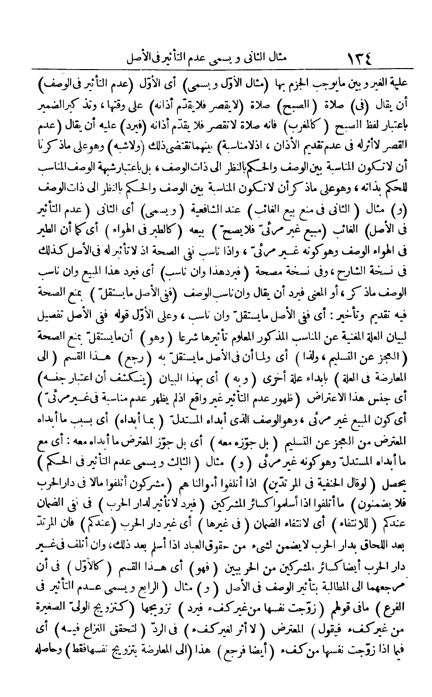 علية الْغَيْر وَبَين مَا يُوجب الْجَزْم بهَا (مِثَال الأول وَيُسمى) أَي الأول (عدم التَّأْثِير فِي الْوَصْف) أَن يُقَال (فِي) صَلَاة (الصُّبْح) صَلَاة (لَا يقصر فَلَا يقدم أَذَانه) على وَقتهَا، وتذكير الضَّمِير بِاعْتِبَار لفظ الصُّبْح (كالمغرب) فَإِنَّهُ صَلَاة لَا تقصر فَلَا يقدم أَذَانه (فَيرد) عَلَيْهِ أَن يُقَال (عدم الْقصر لَا أثر لَهُ فِي عدم تَقْدِيم الْأَذَان، إِذْ لَا مُنَاسبَة) بَينهمَا تَقْتَضِي ذَلِك (وَلَا شبه) وَهُوَ على مَا ذكرنَا أَن لَا تكون الْمُنَاسبَة بَين الْوَصْف وَالْحكم بِالنّظرِ إِلَى ذَات الْوَصْف، بل بِاعْتِبَار شُبْهَة الْوَصْف الْمُنَاسب للْحكم بِذَاتِهِ، وَهُوَ على مَا ذكر أَن لَا تكون الْمُنَاسبَة بَين الْوَصْف وَالْحكم بِالنّظرِ إِلَى ذَات الْوَصْف (و) مِثَال (الثَّانِي فِي منع بيع الْغَائِب) عِنْد الشَّافِعِيَّة (وَيُسمى) أَي الثَّانِي (عدم التَّأْثِير فِي الأَصْل) الْغَائِب (مَبِيع غير مرئي فَلَا يَصح) بَيْعه (كالطير فِي الْهَوَاء) أَي كَمَا أَن الطير فِي الْهَوَاء الْوَصْف وَهُوَ كَونه غير مرئي، وَإِذا ناسب نفي الصِّحَّة إِذْ لَا تَأْثِير لَهُ فِي الأَصْل كَذَلِك فِي نُسْخَة الشَّارِح، وَفِي نُسْخَة مَصَحَّة (فَيرد هَذَا وَإِن ناسب) أَي فَيرد هَذَا الْمَبِيع وَإِن ناسب الْوَصْف مَا ذكر، أَو الْمَعْنى فَيرد أَن يُقَال وَإِن ناسب الْوَصْف (فَفِي الأَصْل مَا يسْتَقلّ) بِمَنْع الصِّحَّة فِيهِ تَقْدِيم وَتَأْخِير: أَي فَفِي الأَصْل مَا يسْتَقلّ وَإِن ناسب، وعَلى الأول قَوْله فَفِي الأَصْل تَفْصِيل لبَيَان الْعلَّة الْمُغنيَة عَن الْمُنَاسب الْمَذْكُور الْمَعْلُوم تأثيرها شرعا (وَهُوَ) أَن مَا يسْتَقلّ بِمَنْع الصِّحَّة (الْعَجز عَن التَّسْلِيم، وَلذَا) أَي وَلما أَن فِي الأَصْل مَا يسْتَقلّ بِهِ (رَجَعَ) هَذَا الْقسم (إِلَى الْمُعَارضَة فِي الْعلَّة) بإبداء عِلّة أُخْرَى (وَبِه) أَي بِهَذَا الْبَيَان (ينْكَشف أَن اعْتِبَار جنسه) أَي جنس هَذَا الِاعْتِرَاض (ظُهُور عدم التَّأْثِير غير وَاقع إِذْ لم يظْهر عدم مُنَاسبَة فِي غير مرئي) أَي كَون الْمَبِيع غير مرئي، وَهُوَ الْوَصْف الَّذِي أبداه الْمُسْتَدلّ (بِمَا أبداه) أَي بِسَبَب مَا أبداه الْمُعْتَرض من الْعَجز عَن التَّسْلِيم (بل جوزه مَعَه) أَي بل جوز الْمُعْتَرض مَا أبداه مَعَه: أَي مَعَ مَا أبداه الْمُسْتَدلّ وَهُوَ كَونه غير مرئي (و) مِثَال (الثَّالِث وَيُسمى عدم التَّأْثِير فِي الحكم) يحصل (لَو قَالَ الْحَنَفِيَّة فِي الْمُرْتَدين) إِذا أتلفوا أَمْوَالنَا هم (مشركون أتلفوا مَالا فِي دَار الْحَرْب فَلَا يضمنُون) مَا أتلفوا إِذا أَسْلمُوا كَسَائِر الْمُشْركين (فَيرد لَا تَأْثِير لدار الْحَرْب) فِي نفي الضَّمَان عنْدكُمْ (للانتفاء) أَي لانْتِفَاء الضَّمَان (فِي غَيرهَا) أَي غير دَار الْحَرْب (عنْدكُمْ) فَإِن الْمُرْتَد بعد اللحاق بدار الْحَرْب لَا يضمن لشَيْء من حُقُوق الْعباد إِذا أسلم بعد ذَلِك، وَإِن أتلف فِي غير دَار الْحَرْب أَيْضا كَسَائِر الْمُشْركين من الْحَرْبِيين (فَهُوَ) أَي هَذَا الْقسم (كَالْأولِ) فِي أَن مرجعهما إِلَى الْمُطَالبَة بتأثير الْوَصْف فِي الأَصْل (و) مِثَال (الرَّابِع وَيُسمى عدم التَّأْثِير فِي الْفَرْع) مَا فِي قَوْلهم (زوجت نَفسهَا من غير كُفْء فَيرد) تَزْوِيجهَا (كتزويج الْوَلِيّ الصَّغِيرَة من غير كُفْء فَيَقُول) الْمُعْتَرض (لَا أثر لغير كُفْء) فِي الرَّد (لتحَقّق النزاع فِيهِ) أَي فِيمَا إِذا زوجت نَفسهَا من كُفْء (أَيْضا فَرجع) هَذَا (إِلَى الْمُعَارضَة بتزويج نَفسهَا فَقَط) وَحَاصِله