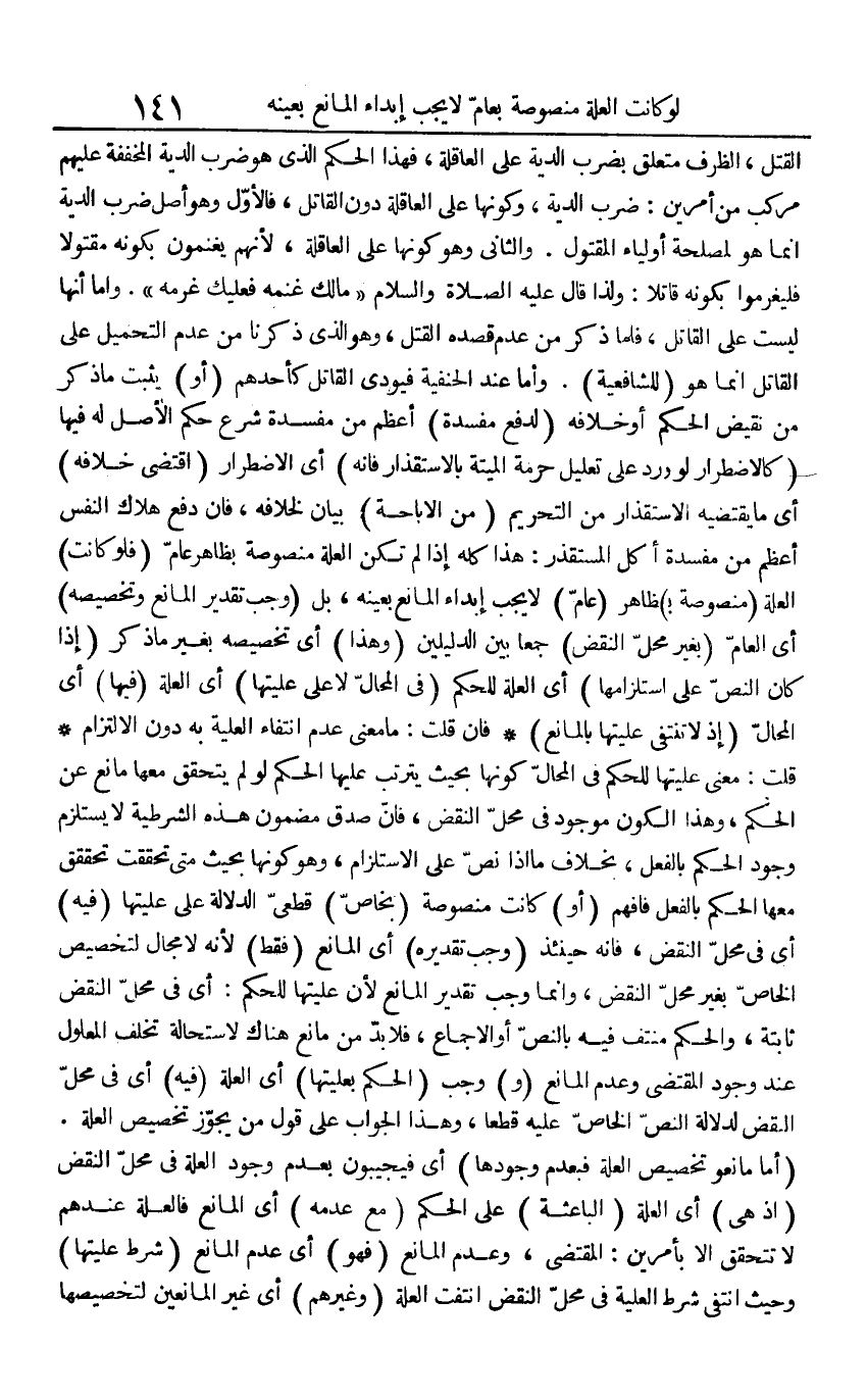 الْقَتْل، الظّرْف مُتَعَلق بِضَرْب الدِّيَة على الْعَاقِلَة، فَهَذَا الحكم الَّذِي هُوَ ضرب الدِّيَة المخففة عَلَيْهِم مركب من أَمريْن: ضرب الدِّيَة، وَكَونهَا على الْعَاقِلَة دون الْقَاتِل، فَالْأول وَهُوَ أصل ضرب الدِّيَة إِنَّمَا هُوَ لمصْلحَة أَوْلِيَاء الْمَقْتُول. وَالثَّانِي وَهُوَ كَونهَا على الْعَاقِلَة، لأَنهم يغنمون بِكَوْنِهِ مقتولا فليغرموا بِكَوْنِهِ قَاتلا: وَلذَا قَالَ صلى الله عَلَيْهِ وَسلم " مَالك غنمه فَعَلَيْك غرمه ". وَأما أَنَّهَا لَيست على الْقَاتِل، فَلَمَّا ذكر من عدم قَصده الْقَتْل، وَهُوَ الَّذِي ذكرنَا من عدم التحميل على الْقَاتِل إِنَّمَا هُوَ (للشَّافِعِيَّة). وَأما عِنْد الْحَنَفِيَّة فيودي الْقَاتِل كأحدهم (أَو) يثبت مَا ذكر من نقيض الحكم أَو خِلَافه (لدفع مفْسدَة) أعظم من مفْسدَة شرع حكم الأَصْل لَهُ فِيهَا (كالاضطرار لَو ورد على تَعْلِيل حُرْمَة الْميتَة بالاستقذار فَإِنَّهُ) أَي الِاضْطِرَار (اقْتضى خِلَافه) أَي مَا يَقْتَضِيهِ الاستقذار من التَّحْرِيم (من الْإِبَاحَة) بَيَان لخلافه، فَإِن دفع هَلَاك النَّفس أعظم من مفْسدَة أكل المستقذر: هَذَا كُله إِذا لم تكن الْعلَّة منصوصة بِظَاهِر عَام (فَلَو كَانَت) الْعلَّة (منصوصة ب) ظَاهر (عَام) لَا يجب إبداء الْمَانِع بِعَيْنِه، بل (وَجب تَقْدِير الْمَانِع وتخصيصه) أَي الْعَام (بِغَيْر مَحل النَّقْض) جمعا بَين الدَّلِيلَيْنِ (وَهَذَا) أَي تَخْصِيصه بِغَيْر مَا ذكر (إِذا كَانَ النَّص على استلزامها) أَي الْعلَّة للْحكم (فِي الْمحَال لَا على عليتها) أَي الْعلَّة (فِيهَا) أَي الْمحَال (إِذْ لَا تَنْتفِي عليتها بالمانع) فَإِن قلت: مَا معنى عدم انْتِفَاء الْعلية بِهِ دون الِالْتِزَام قلت: معنى عليتها للْحكم فِي الْمحَال كَونهَا بِحَيْثُ يَتَرَتَّب عَلَيْهَا الحكم لَو لم يتَحَقَّق مَعهَا مَانع عَن الحكم، وَهَذَا الْكَوْن مَوْجُود فِي مَحل النَّقْض، فَإِن صدق مَضْمُون هَذِه الشّرطِيَّة لَا يسْتَلْزم وجود الحكم بِالْفِعْلِ، بِخِلَاف مَا إِذا نَص على الاستلزام، وَهُوَ كَونهَا بِحَيْثُ مَتى تحققت تحقق مَعهَا الحكم بِالْفِعْلِ فَافْهَم (أَو) كَانَت منصوصة (بخاص) قَطْعِيّ الدّلَالَة على عليتها (فِيهِ) أَي فِي مَحل النَّقْض، فَإِنَّهُ حِينَئِذٍ (وَجب تَقْدِيره) أَي الْمَانِع (فَقَط) لِأَنَّهُ لَا مجَال لتخصيص الْخَاص بِغَيْر مَحل النَّقْض، وَإِنَّمَا وَجب تَقْدِير الْمَانِع لِأَن عليتها للْحكم: أَي فِي مَحل النَّقْض ثَابِتَة، وَالْحكم مُنْتَفٍ فِيهِ بِالنَّصِّ أَو الْإِجْمَاع، فَلَا بُد من مَانع هُنَاكَ لِاسْتِحَالَة تخلف الْمَعْلُول عِنْد وجود الْمُقْتَضى وَعدم الْمَانِع (و) وَجب (الحكم بعليتها) أَي الْعلَّة (فِيهِ) أَي فِي مَحل النَّقْض لدلَالَة النَّص الْخَاص عَلَيْهِ قطعا، وَهَذَا الْجَواب على قَول من يجوز تَخْصِيص الْعلَّة. (أما مانعو تَخْصِيص الْعلَّة فبعدم وجودهَا) أَي فيجيبون بِعَدَمِ وجود الْعلَّة فِي مَحل النَّقْض (إِذْ هِيَ) أَي الْعلَّة (الباعثة) على الحكم (مَعَ عَدمه) أَي الْمَانِع فالعلة عِنْدهم لَا تتَحَقَّق إِلَّا بأمرين: الْمُقْتَضى، وَعدم الْمَانِع (فَهُوَ) أَي عدم الْمَانِع (شَرط عليتها) وَحَيْثُ انْتَفَى شَرط الْعلية فِي مَحل النَّقْض انْتَفَت الْعلَّة (وَغَيرهم) أَي غير المانعين لتخصيصها
