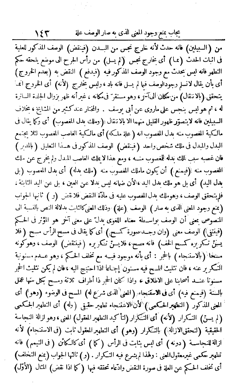 من (السَّبِيلَيْنِ) فَإِنَّهُ حدث لِأَنَّهُ خَارج نجس من الْبدن (فينقض) الْوَصْف الْمَذْكُور للعلية فِي إِثْبَات الْحَدث (بِمَا) أَي بِخَارِج نجس (لم يسل) من رَأس الْجرْح إِلَى مَوضِع يلْحقهُ حكم التطهر فَإِنَّهُ لَيْسَ بِحَدَث مَعَ وجود الْوَصْف الْمَذْكُور فِيهِ (فَيدْفَع) النَّقْض بِهِ (بِعَدَمِ الْخُرُوج) أَي بِأَن يُقَال لَا نسلم وجود الْوَصْف فِيمَا لم يسل فَإِنَّهُ باد، وَلَيْسَ بِخَارِج (لِأَنَّهُ) أَي الْخُرُوج إِنَّمَا يتَحَقَّق (بالانتقال) من مَكَان إِلَى آخر، وَهُوَ مُسْتَقر فِي مَكَانَهُ، غير أَنه ظهر بِزَوَال الْجلْدَة الساترة لَهُ، ثمَّ هُوَ لَيْسَ بِنَجس على مَا روى عَن أبي يُوسُف. وَالْمُخْتَار عِنْد كثير من الْمَشَايِخ، بِخِلَاف السَّبِيلَيْنِ فَإِنَّهُ لَا يتَصَوَّر ظُهُور الْقَلِيل مِنْهُمَا إِلَّا بالانتقال (وَملك بدل الْمَغْصُوب) أَي وكما يُقَال فِي مالكية الْمَغْصُوب مِنْهُ بدل الْمَغْصُوب أَنه (عِلّة ملكه) أَي مالكية الْغَاصِب الْمَغْصُوب لِئَلَّا يجْتَمع الْبَدَل والمبدل فِي ملك شخص وَاحِد (فينقض) الْوَصْف الْمَذْكُور فِي هَذَا التَّعْلِيل (بالمدبر) فَإِن غصبه سَبَب لملك بدله للْمَغْصُوب مِنْهُ، وَمَعَ هَذَا لَا يملك الْغَاصِب الْمُبدل وَلم يخرج عَن ملك الْمَغْصُوب مِنْهُ (فَيمْنَع) أَن يكون مَا ملك الْمَغْصُوب مِنْهُ (ملك بدله) أَي بدل الْمَغْصُوب (بل بدل الْيَد) أَي بل هُوَ ملك بدل الْيَد، لِأَن ضَمَانه لَيْسَ بَدَلا عَن الْعين، بل عَن الْيَد الثَّابِتَة، فَلم يتَحَقَّق الْوَصْف، وَهُوَ ملك بدل الْمَغْصُوب عَلَيْهِ فِي مَادَّة النَّقْض فَلَا نقض (و) ثَانِيهَا الْجَواب (بِمَنْع وجود الْمَعْنى الَّذِي بِهِ صَار) الْوَصْف (عِلّة) وَذَلِكَ الْمَعْنى كَالثَّابِتِ بِدلَالَة النَّص بِالنِّسْبَةِ إِلَى الْمَنْصُوص بِمَعْنى أَن الْوَصْف بِوَاسِطَة مَعْنَاهُ اللّغَوِيّ يدل على معنى آخر هُوَ الْمُؤثر فِي الحكم (فينتفى) الْوَصْف معنى (وَإِن وجد صُورَة كمسح) أَي كَمَا يُقَال فِي مسح الرَّأْس مسح (فَلَا يسن تكريره كمسح الْخُف) فَإِنَّهُ مسح، فَلَا يسن تكريره (فينتقض) الْوَصْف، وَهُوَ كَونه مسحا (بالاستنجاء) بِالْحجرِ: أَي بِأَنَّهُ مَوْجُود فِيهِ مَعَ تخلف الحكم، وَهُوَ عدم مسنونية التكرير عَنهُ، فَإِن تثليث الْمسْح فِيهِ مسنون إِجْمَاعًا إِذا احْتِيجَ إِلَيْهِ، فَإِن لم يكن تثليث الْحجر مسنونا عِنْد أَصْحَابنَا على الْإِطْلَاق، وَإِذا كَانَ الْحجر ذَا أَطْرَاف ثَلَاثَة وَمسح بِكُل مِنْهَا عمل بِالسنةِ (فَيمْنَع فِيهِ) أَي فِي الِاسْتِنْجَاء (الْمَعْنى الَّذِي شرع لَهُ) الْمسْح فِي الْوضُوء (وَهُوَ) أَي الْمَعْنى الْمَذْكُور (التَّطْهِير الْحكمِي) لِأَن الِاسْتِنْجَاء تَطْهِير حَقِيقِيّ (وَله) أَي التَّطْهِير الْحكمِي (لم يسن) التّكْرَار (لِأَنَّهُ) أَي التّكْرَار (لتأكيد التَّطْهِير الْمَعْقُول) الْمَعْنى، وَهُوَ إِزَالَة النَّجَاسَة الْحَقِيقِيَّة (لتحَقّق الْإِزَالَة) بالتكرار (وَهُوَ) أَي التَّطْهِير الْمَعْقُول ثَابت (فِي الِاسْتِنْجَاء) لِأَنَّهُ إِزَالَة للنَّجَاسَة (دونه) أَي لَيْسَ بِثَابِت فِي الرَّأْس (كَمَا) أَي كالكائن (فِي التَّيَمُّم) فَإِنَّهُ تَطْهِير حكمي غير مَعْقُول الْمَعْنى: وَلِهَذَا لم يشرع فِيهِ التّكْرَار. (و) ثَالِثهَا الْجَواب (بِمَنْع التَّخَلُّف) أَي تخلف الحكم عَن الْعلَّة فِي صُورَة النَّقْض وادعاء تحَققه فِيهَا (كَمَا إِذا نقض) الْمِثَال (الأول)