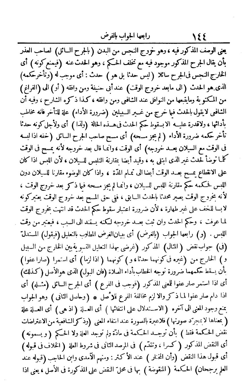 يَعْنِي الْوَصْف الْمَذْكُور فِيهِ، وَهُوَ خُرُوج النَّجس من الْبدن (بِالْجرْحِ السَّائِل) لصَاحب الْعذر بِأَن يُقَال الْجرْح الْمَذْكُور مَوْجُود فِيهِ مَعَ تخلف الحكم، وَهُوَ الْحَدث عَنهُ (فَيمْنَع كَونه) أَي الْخَارِج النَّجس فِي الْجرْح سَائِلًا (لَيْسَ حَدثا بل هُوَ) حدث: أَي مُوجب لَهُ (وَتَأَخر حكمه) الَّذِي هُوَ الْحَدث (إِلَى مَا بعد خُرُوج الْوَقْت) عِنْد أبي حنيفَة وَمن وَافقه (أَو) إِلَى (الْفَرَاغ) من الْمَكْتُوبَة وَمَا يتبعهَا من النَّوَافِل عِنْد الشَّافِعِي وَمن وَافقه، كَذَا ذكره الشَّارِح، وَفِيه أَن الشَّافِعِي لَا يَقُول بِالْحَدَثِ فِيمَا خرج من غير السَّبِيلَيْنِ (ضَرُورَة الْأَدَاء) عِلّة للتأخر فَإِنَّهُ مُخَاطب بأدائها، وَلَا قدرَة عَلَيْهِ إِلَّا بِسُقُوط حكم الْحَدث فِي هَذِه الْحَالة (وَلذَا) أَي وَلأَجل كَونه حَدثا تَأَخّر حكمه ضَرُورَة الْأَدَاء (لم يجز مَسحه) أَي مسح صَاحب الْجرْح السَّائِل (خفه إِذا لبسه فِي الْوَقْت مَعَ السيلان بعد خُرُوجه) أَي الْوَقْت، وَإِنَّمَا قَالَ بعد خُرُوجه لِأَنَّهُ يمسح فِي الْوَقْت كلما تَوَضَّأ لحَدث غير الَّذِي ابتلى بِهِ، وَقيد أَيْضا بمقارنة التَّلَبُّس للسيلان، لِأَن اللّبْس إِذا كَانَ على الِانْقِطَاع يمسح بعد الْوَقْت أَيْضا إِلَى تَمام الْمدَّة، وَإِذا كَانَ الْوضُوء مُقَارنًا للسيلان دون اللّبْس فَحكمه حكم مُقَارنَة اللّبْس للسيلان، وَإِنَّمَا لم يجز مَسحه فِيمَا ذكر بعد خُرُوج الْوَقْت، لِأَنَّهُ بِخُرُوج الْوَقْت يصير مُحدثا بِالْحَدَثِ السَّابِق، فَفِي حق الْمسْح بعد خُرُوج الْوَقْت يعْتَبر كَونه لابسا للخف على غير طَهَارَة، لِأَن ضَرُورَة اعْتِبَار سُقُوط حكم الْحَدث قد انْتَهَت بِخُرُوج الْوَقْت لما عرفت، وَحكم الْحَدث وَإِن ثَبت بعد خُرُوجه لكنه يسْتَند إِلَى السَّبَب، فَيعْتَبر من وَقت اللّبْس. (و) رَابِعهَا الْجَواب (بالغرض) أَي بِبَيَان الْغَرَض الْمَطْلُوب بِالتَّعْلِيلِ (فَيَقُول) الْمُسْتَدلّ (فِي) جَوَاب نقض (الْمِثَال) الْمَذْكُور (غرضي بِهَذَا التَّعْلِيل التَّسْوِيَة بَين الْخَارِج من السَّبِيل و) الْخَارِج من (غَيره فِي كَونهمَا حَدثا، و) كَونهمَا (إِذا لزما) أَي استمرا (صَارا عفوا) بِأَن يسْقط حكمهمَا ضَرُورَة توجه الْخطاب بأَدَاء الصَّلَاة (فَإِن الْبَوْل) الَّذِي هُوَ أصل (كَذَلِك) أَي إِذا اسْتمرّ صَار عفوا للمعنى الْمَذْكُور (فَوَجَبَ فِي الْفَرْع) أَي الْجرْح السَّائِل (مثله) أَي إِذا دَامَ صَار عفوا لما ذكر وَإِلَّا لزم مُخَالفَة الْفَرْع للْأَصْل (وَحَاصِل الثَّانِي) وَهُوَ الْجَواب بِمَنْع وجود الْمَعْنى إِلَى آخِره (الِاسْتِدْلَال على انتفائها) أَي الْعلَّة (إِذْ هِيَ) أَي الْعلَّة عِلّة (بمعناها لَا بِمُجَرَّد صورتهَا) فَلَا عِبْرَة بالصورة عِنْد انْتِفَاء الْمَعْنى (وَذكر الشَّافِعِيَّة من الاعتراضات) نقض الْحِكْمَة فَقَط) بِأَن تُوجد الْحِكْمَة فِي مَادَّة وَلم تُوجد الْعلَّة وَلَا الحكم (ويسمونه) أَي النَّقْض الْمَذْكُور (كسرا، وَتقدم) فِي المرصد الثَّانِي فِي شُرُوط الْعلَّة (الْخلاف فِي قبُوله) أَي قبُول هَذَا النَّقْض (وَأَن الْمُخْتَار) عِنْد الْأَكْثَر: وَمِنْهُم الْآمِدِيّ وَابْن الْحَاجِب (قبُوله عِنْد الْعلم برجحان) الْحِكْمَة (المنقوضة) بهَا فِي مَحل النَّقْض على الْمَذْكُورَة فِي الأَصْل، يَعْنِي إِذا
