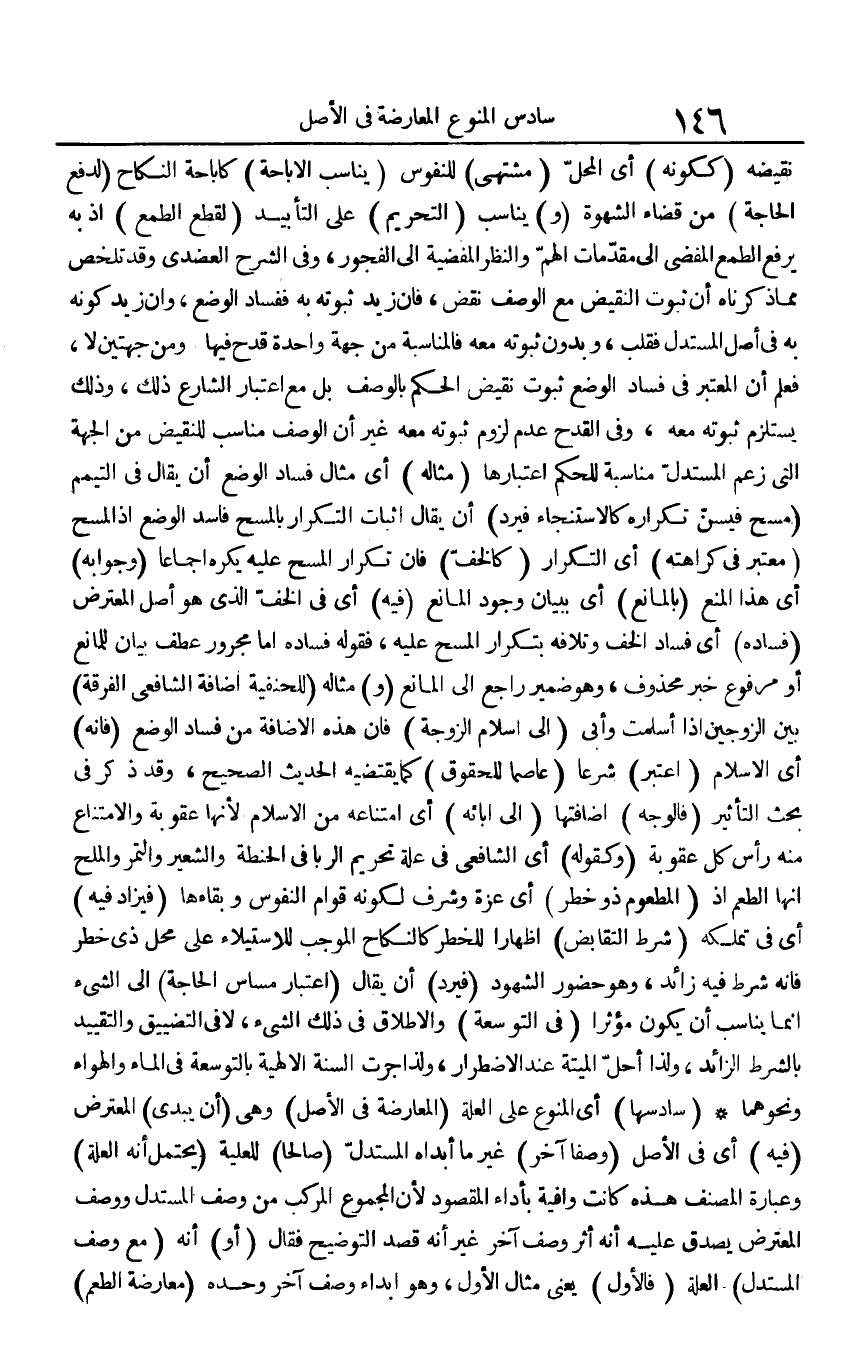 نقيضه (كَكَوْنِهِ) أَي الْمحل (مشتهى) للنفوس (يُنَاسب الْإِبَاحَة) كإباحة النِّكَاح (لدفع الْحَاجة) من قَضَاء الشَّهْوَة (و) يُنَاسب (التَّحْرِيم) على التَّأْبِيد (لقطع الطمع) إِذْ بِهِ يرفع الطمع المفضي إِلَى مُقَدمَات الْهم وَالنَّظَر المفضية إِلَى الْفُجُور، وَفِي الشَّرْح العضدي وَقد تخلص مِمَّا ذَكرْنَاهُ أَن ثُبُوت النقيض مَعَ الْوَصْف نقض، فَإِن زيد ثُبُوته بِهِ ففساد الْوَضع، وَأَن زيد كَونه بِهِ فِي أصل الْمُسْتَدلّ فَقلب، وَبِدُون ثُبُوته مَعَه فالمناسبة من جِهَة وَاحِدَة قدح فِيهَا وَمن جِهَتَيْنِ لَا، فَعلم أَن الْمُعْتَبر فِي فَسَاد الْوَضع ثُبُوت نقيض الحكم بِالْوَصْفِ بل مَعَ اعْتِبَار الشَّارِع ذَلِك، وَذَلِكَ يسْتَلْزم ثُبُوته مَعَه، وَفِي الْقدح عدم لُزُوم ثُبُوته مَعَه غير أَن الْوَصْف مُنَاسِب للنقيض من الْجِهَة الَّتِي زعم الْمُسْتَدلّ مُنَاسبَة للْحكم اعْتِبَارهَا (مِثَاله) أَي مِثَال فَسَاد الْوَضع أَن يُقَال فِي التَّيَمُّم (مسح فَيسنّ تكراره كالاستنجاء فَيرد) أَن يُقَال إِثْبَات التّكْرَار بِالْمَسْحِ فَاسد الْوَضع إِذْ الْمسْح (مُعْتَبر فِي كَرَاهَته) أَي التّكْرَار (كالخف) فَإِن تكْرَار الْمسْح عَلَيْهِ يكره إِجْمَاعًا (وَجَوَابه) أَي هَذَا الْمَنْع (بالمانع) أَي بِبَيَان وجود الْمَانِع (فِيهِ) أَي فِي الْخُف الَّذِي هُوَ أصل الْمُعْتَرض (فَسَاده) أَي فَسَاد الْخُف وتلافه بتكرار الْمسْح عَلَيْهِ، فَقَوله فَسَاده إِمَّا مجرور عطف بَيَان للمانع أَو مَرْفُوع خبر مَحْذُوف، وَهُوَ ضمير رَاجع إِلَى الْمَانِع (و) مِثَاله (للحنفية إِضَافَة الشَّافِعِي الْفرْقَة) بَين الزَّوْجَيْنِ إِذا أسلمت وأبى (إِلَى إِسْلَام الزَّوْجَة) فَإِن هَذِه الْإِضَافَة من فَسَاد الْوَضع (فَإِنَّهُ) أَي الْإِسْلَام (اعْتبر) شرعا (عَاصِمًا للحقوق) كَمَا يَقْتَضِيهِ الحَدِيث الصَّحِيح، وَقد ذكر فِي بحث التَّأْثِير (فَالْوَجْه) إضافتها (إِلَى آبَائِهِ) أَي امْتِنَاعه من الْإِسْلَام لِأَنَّهَا عُقُوبَة والامتناع مِنْهُ رَأس كل عُقُوبَة (وَكَقَوْلِه) أَي الشَّافِعِي فِي عِلّة تَحْرِيم الرِّبَا فِي الْحِنْطَة وَالشعِير وَالتَّمْر وَالْملح إِنَّهَا الطّعْم إِذْ (المطعوم ذُو خطر) أَي عزة وَشرف لكَونه قوام النُّفُوس وبقاءها (فيزاد فِيهِ) أَي فِي تملكه (شَرط التَّقَابُض) إِظْهَارًا للخطر كَالنِّكَاحِ الْمُوجب للاستيلاء على مَحل ذِي خطر فَإِنَّهُ شَرط فِيهِ زَائِد، وَهُوَ حُضُور الشُّهُود (فَيرد) أَن يُقَال (اعْتِبَار مساس الْحَاجة) إِلَى الشَّيْء إِنَّمَا يُنَاسب أَن يكون مؤثرا (فِي التَّوسعَة) وَالْإِطْلَاق فِي ذَلِك الشَّيْء، لَا فِي التَّضْيِيق وَالتَّقْيِيد بِالشّرطِ الزَّائِد، وَلذَا أحل الْميتَة عِنْد الِاضْطِرَار، وَلذَا جرت السّنة الإلهية بالتوسعة فِي المَاء والهواء وَنَحْوهمَا (سادسها) أَي المنوع على الْعلَّة (الْمُعَارضَة فِي الأَصْل) وَهِي (أَن يُبْدِي) الْمُعْتَرض (فِيهِ) أَي فِي الأَصْل (وَصفا آخر) غير مَا أبداه الْمُسْتَدلّ (صَالحا) للعلية (يحْتَمل أَنه الْعلَّة) وَعبارَة المُصَنّف هَذِه كَانَت وافية بأَدَاء الْمَقْصُود لِأَن الْمَجْمُوع الْمركب من وصف الْمُسْتَدلّ وَوصف الْمُعْتَرض يصدق عَلَيْهِ أَنه اثر وصف آخر غير أَنه قصد التَّوْضِيح فَقَالَ (أَو) أَنه (مَعَ وصف الْمُسْتَدلّ) الْعلَّة (فَالْأول) يَعْنِي مِثَال الأول، وَهُوَ إبداء وصف آخر وَحده (مُعَارضَة الطّعْم)