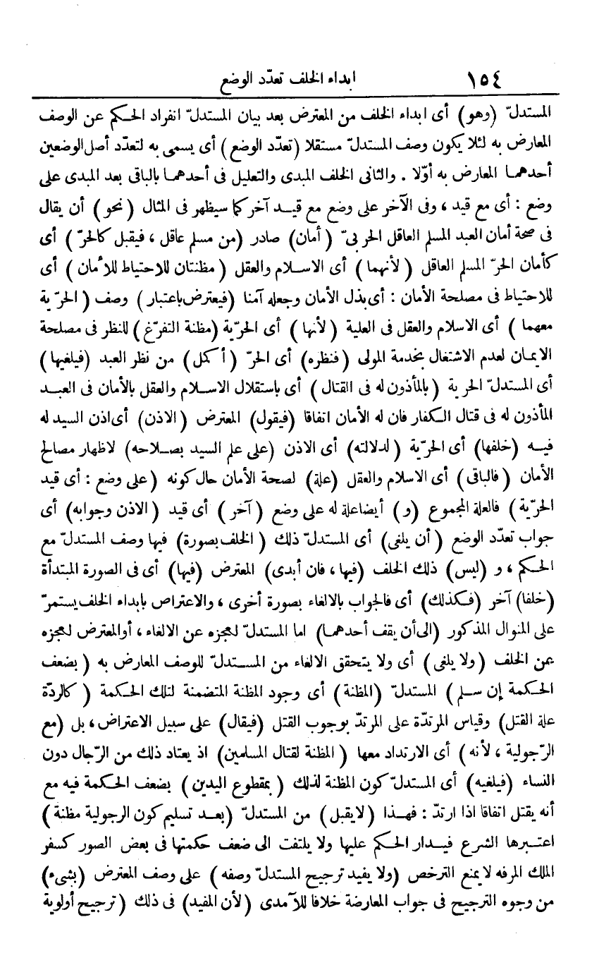 الْمُسْتَدلّ (وَهُوَ) أَي إبداء الْخلف من الْمُعْتَرض بعد بَيَان الْمُسْتَدلّ انْفِرَاد الحكم عَن الْوَصْف الْمعَارض بِهِ لِئَلَّا يكون وصف الْمُسْتَدلّ مُسْتقِلّا (تعدد الْوَضع) أَي يُسمى بِهِ لتَعَدد أصل الوضعين أَحدهمَا الْمعَارض بِهِ أَولا. وَالثَّانِي الْخلف المبدي وَالتَّعْلِيل فِي أَحدهمَا بِالْبَاقِي بعد المبدي على وضع: أَي مَعَ قيد، وَفِي الآخر على وضع مَعَ قيد آخر كَمَا سَيظْهر فِي الْمِثَال (نَحْو) أَن يُقَال فِي صِحَة أَمَان العَبْد الْمُسلم الْعَاقِل الْحَرْبِيّ (أَمَان) صادر (من مُسلم عَاقل، فَيقبل كَالْحرِّ) أَي كأمان الْحر الْمُسلم الْعَاقِل (لِأَنَّهُمَا) أَي الْإِسْلَام وَالْعقل (مظنتان للِاحْتِيَاط للأمان) أَي للِاحْتِيَاط فِي مصلحَة الْأمان: أَي بذل الْأمان وَجعله آمنا (فيعترض بِاعْتِبَار) وصف (الْحُرِّيَّة مَعَهُمَا) أَي الْإِسْلَام وَالْعقل فِي الْعلية (لِأَنَّهَا) أَي الْحُرِّيَّة (مَظَنَّة التفرغ) للنَّظَر فِي مصلحَة الْإِيمَان لعدم الِاشْتِغَال بِخِدْمَة الْمولى (فنظره) أَي الْحر (أكمل) من نظر العَبْد (فيلغيها) أَي الْمُسْتَدلّ الْحُرِّيَّة (بالمأذون لَهُ فِي الْقِتَال) أَي باستقلال الْإِسْلَام وَالْعقل بالأمان فِي العَبْد الْمَأْذُون لَهُ فِي قتال الْكفَّار فَإِن لَهُ الْأمان اتِّفَاقًا (فَيَقُول) الْمُعْتَرض (الْإِذْن) أَي إِذن السَّيِّد لَهُ فِيهِ (خلفهَا) أَي الْحُرِّيَّة (لدلالته) أَي الْإِذْن (على علم السَّيِّد بصلاحه) لإِظْهَار مصَالح الْأمان (فالباقي) أَي الْإِسْلَام وَالْعقل (عِلّة) لصِحَّة الْأمان حَال كَونه (على وضع: أَي قيد الْحُرِّيَّة) فالعلة الْمَجْمُوع (و) أَيْضا عِلّة لَهُ على وضع (آخر) أَي قيد (الْإِذْن وَجَوَابه) أَي جَوَاب تعدد الْوَضع (أَن يلغي) أَي الْمُسْتَدلّ ذَلِك (الْخلف) بِصُورَة فِيهَا وصف الْمُسْتَدلّ مَعَ الحكم، و (لَيْسَ) ذَلِك الْخلف (فِيهَا، فَإِن أبدى) الْمُعْتَرض (فِيهَا) أَي فِي الصُّورَة المبتدأة (خلفا) آخر (فَكَذَلِك) أَي فَالْجَوَاب بالإلغاء بِصُورَة أُخْرَى، والاعتراض بإبداء الْخلف يسْتَمر على المنوال الْمَذْكُور (إِلَى أَن يقف أَحدهمَا) أما الْمُسْتَدلّ لعَجزه عَن الإلغاء، أَو الْمُعْتَرض لعَجزه عَن الْخلف (وَلَا يلغي) أَي وَلَا يتَحَقَّق الإلغاء من الْمُسْتَدلّ للوصف الْمعَارض بِهِ (بِضعْف الْحِكْمَة إِن سلم) الْمُسْتَدلّ (المظنة) أَي وجود المظنة المتضمنة لتِلْك الْحِكْمَة (كالردة عِلّة الْقَتْل) وَقِيَاس الْمُرْتَدَّة على الْمُرْتَد بِوُجُوب الْقَتْل (فَيُقَال) على سَبِيل الِاعْتِرَاض، بل (مَعَ الرجولية، لِأَنَّهُ) أَي الارتداد مَعهَا (المظنة لقِتَال الْمُسلمين) إِذْ يعْتَاد ذَلِك من الرِّجَال دون النِّسَاء (فيلغيه) أَي الْمُسْتَدلّ كَون المظنة لذَلِك (بمقطوع الْيَدَيْنِ) بِضعْف الْحِكْمَة فِيهِ مَعَ أَنه يقتل اتِّفَاقًا إِذا ارْتَدَّ: فَهَذَا (لَا يقبل) من الْمُسْتَدلّ (بعد تَسْلِيم كَون الرجولية مَظَنَّة) اعتبرها الشَّرْع فيدار الحكم عَلَيْهَا وَلَا يلْتَفت إِلَى ضعف حكمتها فِي بعض الصُّور كسفر الْملك المرفه لَا يمْنَع التَّرَخُّص (وَلَا يُفِيد تَرْجِيح الْمُسْتَدلّ وَصفه) على وصف الْمُعْتَرض (بِشَيْء) من وُجُوه التَّرْجِيح فِي جَوَاب الْمُعَارضَة خلافًا للآمدي (لِأَن الْمُفِيد) فِي ذَلِك (تَرْجِيح أَوْلَوِيَّة