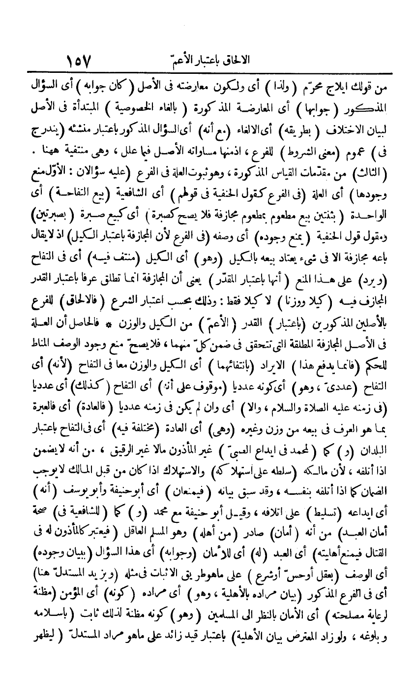 من قَوْلك إيلاج محرم (وَلذَا) أَي وَلكَون معارضته فِي الأَصْل (كَانَ جَوَابه) أَي السُّؤَال الْمَذْكُور (جوابها) أَي الْمُعَارضَة الْمَذْكُورَة (بإلغاء الخصوصية) المبتدأة فِي الأَصْل لبَيَان الِاخْتِلَاف (بطريقه) أَي الإلغاء (مَعَ أَنه) أَي السُّؤَال الْمَذْكُور بِاعْتِبَار منشئه (ينْدَرج فِي) عُمُوم (معنى الشُّرُوط) للفرع، إِذْ مِنْهَا مساواته الأَصْل فِيمَا علل، وَهِي منتفية هَهُنَا. (الثَّالِث) من مُقَدمَات الْقيَاس الْمَذْكُورَة، وَهُوَ ثُبُوت الْعلَّة فِي الْفَرْع (عَلَيْهِ سؤالان: الأول منع وجودهَا) أَي الْعلَّة (فِي الْفَرْع كَقَوْل الْحَنَفِيَّة فِي قَوْلهم) أَي الشَّافِعِيَّة (بيع التفاحة) أَي الْوَاحِدَة (بثنتين بيع مطعوم بمطعوم مجازفة فَلَا يَصح كصبرة) أَي كَبيع صبرَة (بصبرتين) ومقول قَول الْحَنَفِيَّة (يمْنَع وجوده) أَي وَصفه (فِي الْفَرْع لِأَن المجازفة بِاعْتِبَار الْكَيْل) إِذْ لَا يُقَال بَاعه مجازفة إِلَّا فِي شَيْء يعْتَاد بَيْعه بِالْكَيْلِ (وَهُوَ) أَي الْكَيْل (مُنْتَفٍ فِيهِ) أَي فِي التفاح (وَيرد) على هَذَا الْمَنْع (أَنَّهَا بِاعْتِبَار الْمُقدر) يَعْنِي أَن المجازفة إِنَّمَا تطلق عرفا بِاعْتِبَار الْقدر المجازف فِيهِ (كَيْلا ووزنا) لَا كَيْلا فَقَط: وَذَلِكَ بِحَسب اعْتِبَار الشَّرْع (فالإلحاق) للفرع بالأصلين الْمَذْكُورين (بِاعْتِبَار) الْقدر (الْأَعَمّ) من الْكَيْل وَالْوَزْن فَالْحَاصِل أَن الْعلَّة فِي الأَصْل المجازفة الْمُطلقَة الَّتِي تتَحَقَّق فِي ضمن كل مِنْهُمَا، فَلَا يَصح منع وجود الْوَصْف المناط للْحكم (فَإِنَّمَا يدْفع هَذَا) الْإِيرَاد (بانتفائها) أَي الْكَيْل وَالْوَزْن مَعًا فِي التفاح (لِأَنَّهُ) أَي التفاح (عددي، وَهُوَ) أَي كَونه عدديا (مَوْقُوف على أَنه) أَي التفاح (كَذَلِك) أَي عدديا (فِي زَمَنه صلى الله عَلَيْهِ وَسلم، وَإِلَّا) أَي وَإِن لم يكن فِي زَمَنه عدديا (فالعادة) أَي فَالْعِبْرَة بِمَا هُوَ الْعرف فِي بَيْعه من وزن وَغَيره (وَهِي) أَي الْعَادة (مُخْتَلفَة فِيهِ) أَي فِي التفاح بِاعْتِبَار الْبلدَانِ (و) كَمَا (لمُحَمد فِي إِيدَاع الصَّبِي) غير الْمَأْذُون مَالا غير الرَّقِيق، من أَنه لَا يضمن إِذا أتْلفه، لِأَن مَالِكه (سلطه على استهلاكه) والاستهلاك إِذا كَانَ من قبل الْمَالِك لَا يُوجب الضَّمَان كَمَا إِذا أتْلفه بِنَفسِهِ، وَقد سبق بَيَانه (فيمنعان) أَي أَبُو حنيفَة وَأَبُو يُوسُف (أَنه) أَي إيداعه (تسليط) على اتلافه، وَقيل أَبُو حنيفَة مَعَ مُحَمَّد (و) كَمَا (للشَّافِعِيَّة فِي) صِحَة أَمَان العَبْد) من أَنه (أَمَان) صادر (من أَهله) وَهُوَ الْمُسلم الْعَاقِل (فَيعْتَبر كالمأذون لَهُ فِي الْقِتَال فَيمْنَع أَهْلِيَّته) أَي العَبْد (لَهُ) أَي للأمان (وَجَوَابه) أَي هَذَا السُّؤَال (بِبَيَان وجوده) أَي الْوَصْف (بعقل أَو حس أَو شرع) على مَا هُوَ طَرِيق الْإِثْبَات فِي مثله (وَيزِيد الْمُسْتَدلّ هُنَا) أَي فِي الْفَرْع الْمَذْكُور (بَيَان مُرَاده بالأهلية، وَهُوَ) أَي مُرَاده (كَونه) أَي الْمُؤمن (مَظَنَّة لرعاية مصْلحَته) أَي الْأمان بِالنّظرِ إِلَى الْمُسلمين (وَهُوَ) كَونه مَظَنَّة لذَلِك ثَابت (بِإِسْلَامِهِ وبلوغه، وَلَو زَاد الْمُعْتَرض بَيَان الْأَهْلِيَّة) بِاعْتِبَار قيد زَائِد على مَا هُوَ مُرَاد الْمُسْتَدلّ (ليظْهر