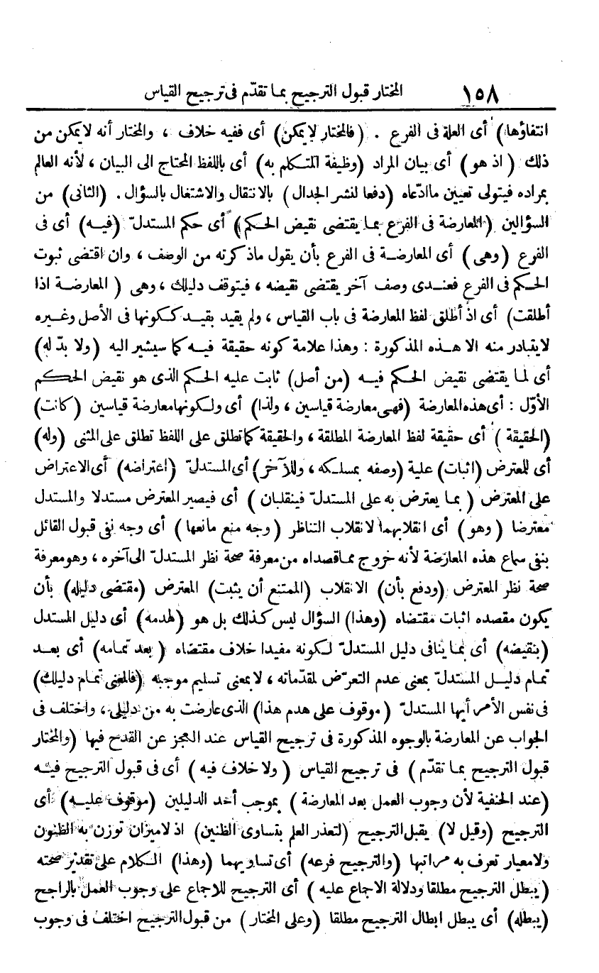 انتفاؤها) أَي الْعلَّة فِي الْفَرْع. (فالمختار لَا يُمكن) أَي فَفِيهِ خلاف، وَالْمُخْتَار أَنه لَا يُمكن من ذَلِك (إِذْ هُوَ) أَي بَيَان المُرَاد (وَظِيفَة الْمُتَكَلّم بِهِ) أَي بِاللَّفْظِ الْمُحْتَاج إِلَى الْبَيَان، لِأَنَّهُ الْعَالم بمراده فيتولى تعْيين مَا ادَّعَاهُ (دفعا لنشر الْجِدَال) بالانتقال والاشتغال بالسؤال. (الثَّانِي) من السؤالين (الْمُعَارضَة فِي الْفَرْع بِمَا يقتضى نقيض الحكم) أَي حكم الْمُسْتَدلّ (فِيهِ) أَي فِي الْفَرْع (وَهِي) أَي الْمُعَارضَة فِي الْفَرْع بِأَن يَقُول مَا ذكرته من الْوَصْف، وَإِن اقْتضى ثُبُوت الحكم فِي الْفَرْع فعندي وصف آخر يَقْتَضِي نقيضه، فَيتَوَقَّف دليلك، وَهِي (الْمُعَارضَة إِذا أطلقت) أَي إِذْ أطلق لفظ الْمُعَارضَة فِي بَاب الْقيَاس، وَلم يُقيد بِقَيْد ككونها فِي الأَصْل وَغَيره لَا يتَبَادَر مِنْهُ إِلَّا هَذِه الْمَذْكُورَة: وَهَذَا عَلامَة كَونه حَقِيقَة فِيهِ كَمَا سيشير إِلَيْهِ (وَلَا بُد لَهُ) أَي لما يَقْتَضِي نقيض الحكم فِيهِ (من أصل) ثَابت عَلَيْهِ الحكم الَّذِي هُوَ نقيض الحكم الأول: أَي هَذِه الْمُعَارضَة (فَهِيَ مُعَارضَة قياسين، وَلذَا) أَي ولكونها مُعَارضَة قياسين (كَانَت) (الْحَقِيقَة) أَي حَقِيقَة لفظ الْمُعَارضَة الْمُطلقَة، والحقيقة كَمَا تطلق على اللَّفْظ تطلق على الْمثنى (وَله) أَي للمعترض (إِثْبَات) علية (وَصفه بمسلكه، وَللْآخر) أَي الْمُسْتَدلّ (اعتراضه) أَي الِاعْتِرَاض على الْمُعْتَرض (بِمَا يعْتَرض بِهِ على الْمُسْتَدلّ فينقلبان) أَي فَيصير الْمُعْتَرض مستدلا والمستدل مُعْتَرضًا (وَهُوَ) أَي انقلابهما لانقلاب التناظر (وَجه منع مانعها) أَي وَجه نفي قبُول الْقَائِل بِنَفْي سَماع هَذِه الْمُعَارضَة لِأَنَّهُ خُرُوج مِمَّا قصداه من معرفَة صِحَة نظر الْمُسْتَدلّ إِلَى آخِره، وَهُوَ معرفَة صِحَة نظر الْمُعْتَرض (وَدفع بِأَن) الانقلاب (الْمُمْتَنع أَن يثبت) الْمُعْتَرض (مُقْتَضى دَلِيله) بِأَن يكون مقْصده إِثْبَات مُقْتَضَاهُ (وَهَذَا) السُّؤَال لَيْسَ كَذَلِك بل هُوَ (لهدمه) أَي دَلِيل الْمُسْتَدلّ (بنقيضه) أَي بِمَا يُنَافِي دَلِيل الْمُسْتَدلّ لكَونه مُفِيدا خلاف مُقْتَضَاهُ (بعد تَمَامه) أَي بعد تَمام دَلِيل الْمُسْتَدلّ بِمَعْنى عدم التَّعَرُّض لمقدماته، لَا بِمَعْنى تَسْلِيم مُوجبه (فَالْمَعْنى تَمام دليلك) فِي نفس الْأَمر أَيهَا الْمُسْتَدلّ (مَوْقُوف على هدم هَذَا) الَّذِي عارضت بِهِ من دليلي، وَاخْتلف فِي الْجَواب عَن الْمُعَارضَة بالوجوه الْمَذْكُورَة فِي تَرْجِيح الْقيَاس عِنْد الْعَجز عَن الْقدح فِيهَا (وَالْمُخْتَار قبُول التَّرْجِيح بِمَا تقدم) فِي تَرْجِيح الْقيَاس (وَلَا خلاف فِيهِ) أَي فِي قبُول التَّرْجِيح فِيهِ (عِنْد الْحَنَفِيَّة لِأَن وجوب الْعَمَل بعد الْمُعَارضَة) بِمُوجب أحد الدَّلِيلَيْنِ (مَوْقُوف عَلَيْهِ) أَي التَّرْجِيح (وَقيل لَا) يقبل التَّرْجِيح (لتعذر الْعلم بتساوي الظنين) إِذْ لَا ميزَان توزن بِهِ الظنون وَلَا معيار تعرف بِهِ مراتبها (وَالتَّرْجِيح فَرعه) أَي تساويهما (وَهَذَا) الْكَلَام على تَقْدِير صِحَّته (يبطل التَّرْجِيح مُطلقًا وَدلَالَة الْإِجْمَاع عَلَيْهِ) أَي التَّرْجِيح للْإِجْمَاع على وجوب الْعَمَل بالراجح (يُبطلهُ) أَي يبطل إبِْطَال التَّرْجِيح مُطلقًا (وعَلى الْمُخْتَار) من قبُول التَّرْجِيح اخْتلف فِي وجوب