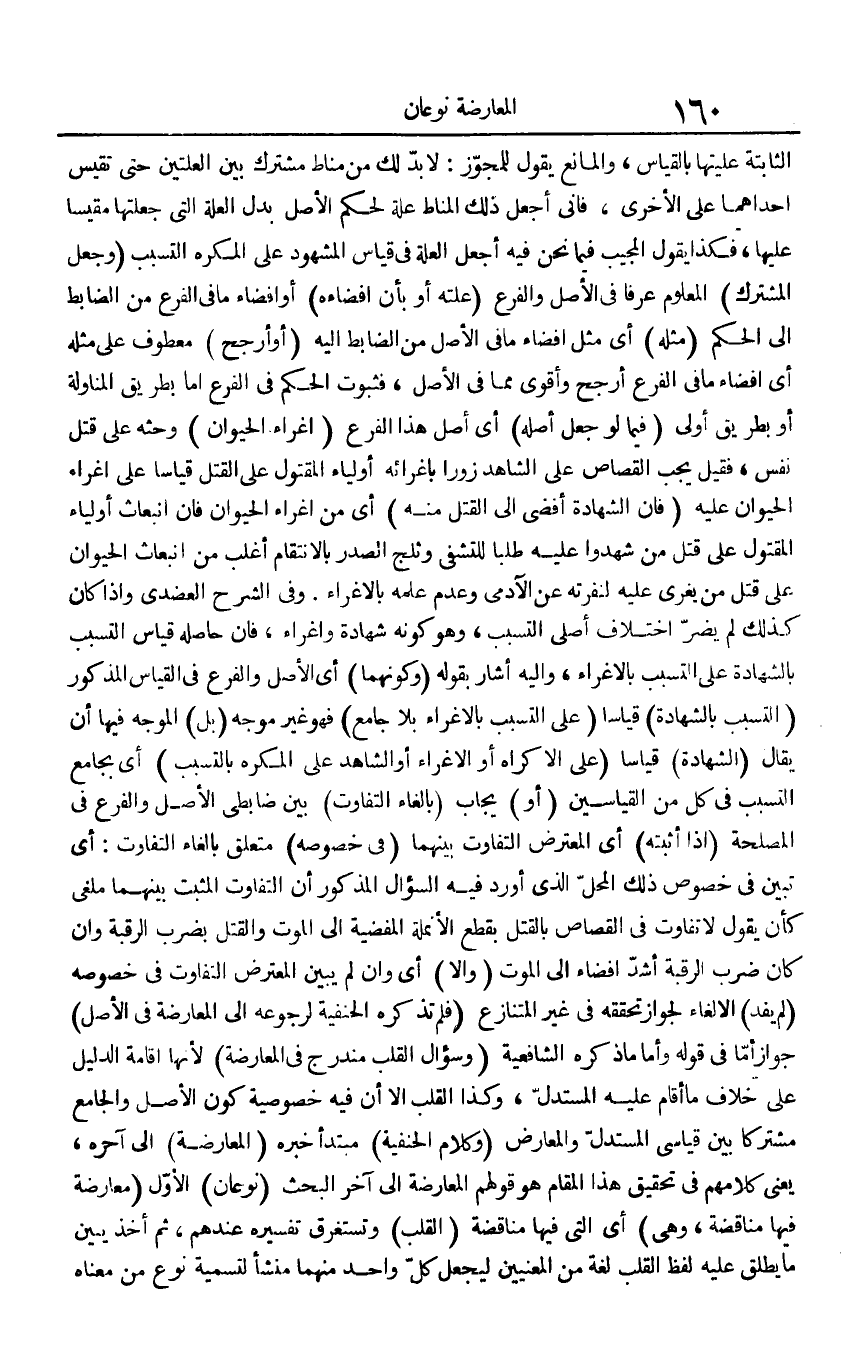الثَّابِتَة عليتها بِالْقِيَاسِ، وَالْمَانِع يَقُول للمجوز: لَا بُد لَك من منَاط مُشْتَرك بَين العلتين حَتَّى تقيس إِحْدَاهمَا على الْأُخْرَى، فَإِنِّي أجعَل ذَلِك المناط عِلّة لحكم الأَصْل بدل الْعلَّة الَّتِي جَعلتهَا مقيسا عَلَيْهَا، فَكَذَا يَقُول الْمُجيب فِيمَا نَحن فِيهِ أجعَل الْعلَّة فِي قِيَاس الْمَشْهُود على الْمُكْره التَّسَبُّب (وَجعل الْمُشْتَرك) الْمَعْلُوم عرفا فِي الأَصْل وَالْفرع (علته أَو بِأَن إفضاءه) أَو إفضاء مَا فِي الْفَرْع من الضَّابِط إِلَى الحكم (مثله) أَي مثل إفضاء مَا فِي الأَصْل من الضَّابِط إِلَيْهِ (أَو أرجح) مَعْطُوف على مثله أَي إفضاء مَا فِي الْفَرْع أرجح وَأقوى مِمَّا فِي الأَصْل، فثبوت الحكم فِي الْفَرْع إِمَّا بطرِيق المناولة أَو بطرِيق أولى (فِيمَا لَو جعل أَصله) أَي أصل هَذَا الْفَرْع (إغراء الْحَيَوَان) وحثه على قتل نفس، فَقيل يجب الْقصاص على الشَّاهِد زورا بإغرائه أَوْلِيَاء الْمَقْتُول على الْقَتْل قِيَاسا على إغراء الْحَيَوَان عَلَيْهِ (فَإِن الشَّهَادَة أفْضى إِلَى الْقَتْل مِنْهُ) أَي من إغراء الْحَيَوَان فَإِن انبعاث أَوْلِيَاء الْمَقْتُول على قتل من شهدُوا عَلَيْهِ طلبا للتشفي وثلج الصَّدْر بالانتقام أغلب من انبعاث الْحَيَوَان على قتل من يغرى عَلَيْهِ لنفرته عَن الْآدَمِيّ وَعدم علمه بالإغراء. وَفِي الشَّرْح العضدي وَإِذا كَانَ كَذَلِك لم يضر اخْتِلَاف أُصَلِّي التَّسَبُّب، وَهُوَ كَونه شَهَادَة وإغراء. فَإِن حَاصله قِيَاس التَّسَبُّب بِالشَّهَادَةِ على التَّسَبُّب بالإغراء، وَإِلَيْهِ أَشَارَ بقوله (وكونهما) أَي الأَصْل وَالْفرع فِي الْقيَاس الْمَذْكُور (التَّسَبُّب بِالشَّهَادَةِ) قِيَاسا (على التَّسَبُّب بالإغراء بِلَا جَامع) فَهُوَ غير موجه (بل) الموجه فِيهَا أَن يُقَال (الشَّهَادَة) قِيَاسا (على الْإِكْرَاه أَو الإغراء أَو الشَّاهِد على الْمُكْره بالتسبب) أَي بِجَامِع التَّسَبُّب فِي كل من القياسين (أَو) يُجَاب (بإلغاء التَّفَاوُت) بَين ضابطي الأَصْل وَالْفرع فِي الْمصلحَة (إِذا أثْبته) أَي الْمُعْتَرض التَّفَاوُت بَينهمَا (فِي خصوصه) مُتَعَلق بإلغاء التَّفَاوُت: أَي تبين فِي خُصُوص ذَلِك الْمحل الَّذِي أورد فِيهِ السُّؤَال الْمَذْكُور أَن التَّفَاوُت الْمُثبت بَينهمَا ملغى كَأَن يَقُول لَا تفَاوت فِي الْقصاص بِالْقَتْلِ بِقطع الْأُنْمُلَة المفضية إِلَى الْمَوْت وَالْقَتْل بِضَرْب الرَّقَبَة وَإِن كَانَ ضرب لرقبة أَشد إفضاء إِلَى الْمَوْت (وَإِلَّا) أَي وَإِن لم يبين الْمُعْتَرض التَّفَاوُت فِي خصوصه (لم يفد) الإلغاء لجَوَاز تحَققه فِي غير الْمُتَنَازع (فَلم تذكره الْحَنَفِيَّة لرجوعه إِلَى الْمُعَارضَة فِي الأَصْل) جَوَاز أما فِي قَوْله وَأما مَا ذكره الشَّافِعِيَّة (وسؤال الْقلب مندرج فِي الْمُعَارضَة) لِأَنَّهَا إِقَامَة الدَّلِيل على خلاف مَا أَقَامَ عَلَيْهِ الْمُسْتَدلّ، وَكَذَا الْقلب إِلَّا أَن فِيهِ خُصُوصِيَّة كَون الأَصْل وَالْجَامِع مُشْتَركا بَين قياسي الْمُسْتَدلّ والمعارض (وَكَلَام الْحَنَفِيَّة) مُبْتَدأ خَبره (الْمُعَارضَة) إِلَى آخِره، يَعْنِي كَلَامهم فِي تَحْقِيق هَذَا الْمقَام هُوَ قَوْلهم الْمُعَارضَة إِلَى آخر الْبَحْث (نَوْعَانِ) الأول (مُعَارضَة فِيهَا مناقضة، وَهِي) أَي الَّتِي فِيهَا مناقضة (الْقلب) وتستغرق تَفْسِيره عِنْدهم، ثمَّ أَخذ يبين مَا يُطلق عَلَيْهِ لفظ الْقلب لُغَة من الْمَعْنيين ليجعل كل وَاحِد مِنْهُمَا منشأ لتسمية نوع من مَعْنَاهُ