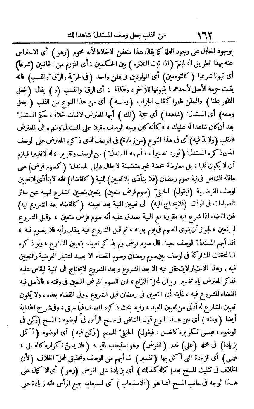 بِوُجُود الْمَعْلُول على وجود الْعلَّة كَمَا يُقَال هَذَا متعفن الإخلاط لِأَنَّهُ مَحْمُوم (وَهُوَ) أَي الاحتراس عَنهُ بِهَذَا الطَّرِيق إِنَّمَا يتم (إِذا ثَبت التلازم) بَين الْحكمَيْنِ: أَي اللُّزُوم من الْجَانِبَيْنِ (شرعا) أَي ثبوتا شَرْعِيًّا (كالتوءمين) أَي المولودين فِي بطن وَاحِد (فِي الْحُرِّيَّة وَالرّق وَالنّسب) فَإِنَّهُ يثبت حُرْمَة الأَصْل لأَحَدهمَا بثبوتها للْآخر، وَهَكَذَا: أَي الرّقّ وَالنّسب (و) يُقَال (لجعل الظّهْر بَطنا) والبطن ظهرا كقلب الجراب (وَمِنْه) أَي من هَذَا النَّوْع من الْقلب (جعل وَصفه) أَي الْمُسْتَدلّ (شَاهدا) أَي حجَّة (لَك) أَيهَا الْمُعْتَرض لإِثْبَات خلاف حكم الْمُسْتَدلّ بعد أَن كَانَ شَاهدا لَهُ عَلَيْك، فَكَأَنَّهُ كَانَ وَجه الْوَصْف مُقبلا على الْمُسْتَدلّ وظهره إِلَى الْمُعْتَرض فَانْقَلَبَ (وَلَا بُد فِيهِ) أَي فِي هَذَا النَّوْع (من زِيَادَة) فِي الْوَصْف الَّذِي ذكره الْمُعْتَرض على الْوَصْف الَّذِي ذكره الْمُسْتَدلّ (تورد تَفْسِيرا لما أبهمه الْمُسْتَدلّ) من الْوَصْف وتقريرا، لَهُ لَا تغييرا فَيلْزم أَن لَا يكون قلبا، بل مُعَارضَة مَحْضَة غير متضمنة لإبطال دَلِيل الْمُسْتَدلّ (كَصَوْم فرض) على مَا قَالَه الشَّافِعِي فِي نِيَّة صَوْم رَمَضَان (فَلَا يتَأَدَّى بِلَا تعْيين) للنِّيَّة (كالقضاء) فَإِنَّهُ لَا يتَأَدَّى بِلَا تعْيين لوصف الْفَرْضِيَّة (فَيَقُول) الْحَنَفِيّ (صَوْم فرض مُتَعَيّن) يتَعَيَّن بِتَعْيِين الشَّارِع لنَهْيه عَن سَائِر الصيامات فِي الْوَقْت (فَلَا يحْتَاج إِلَيْهِ) إِلَى تعْيين النِّيَّة بعد تَعْيِينه (كالقضاء بعد الشُّرُوع فِيهِ) فَإِن الْقَضَاء إِذا شرع فِيهِ مَقْرُونا مَعَ النِّيَّة يصدق عَلَيْهِ أَنه صَوْم فرض مُتَعَيّن، وَقبل الشُّرُوع لم يتَعَيَّن، لجَوَاز أَن يَنْوِي الصَّوْم فِي يَوْم بِعَيْنِه، ثمَّ قبل الشُّرُوع فِيهِ يَنْقَلِب رَأْيه فَلَا يَصُوم فِيهِ، فقد أبهم الْمُسْتَدلّ الْوَصْف حَيْثُ قَالَ صَوْم فرض وَلم يذكر تَعْيِينه بِتَعْيِين الشَّارِع، وَلَو ذكره لما تحققت الْمُشَاركَة فِي الْوَصْف بَين صَوْم رَمَضَان وَصَوْم الْقَضَاء إِلَّا بعد اعْتِبَار الْفَرْضِيَّة وَالتَّعْيِين فِيهِ، وَهَذَا الِاعْتِبَار لَا يتَحَقَّق فِيهِ إِلَّا بعد الشُّرُوع وَبعد الشُّرُوع لَا يحْتَاج إِلَى النِّيَّة ليقاس عَلَيْهِ فَذكر الْمُعْتَرض إِيَّاه تَفْسِير وَبَيَان لمحل النزاع، فَإِن الصَّوْم الْفَرْض الْمُتَعَيّن فِي وقته، فَالْأَصْل فِيهِ الْقَضَاء الْمَشْرُوع فِيهِ، غَايَته أَن التَّعْيِين فِي رَمَضَان قبل الشُّرُوع، وَفِي الْقَضَاء بعده، وَلَا يكون تعْيين الشَّارِع لَهُ أدنى من تعْيين العَبْد، وَفِيه بحث ذكره المُصَنّف فِيمَا سبق، وَفِي شرح الْهِدَايَة أَيْضا (وَمِنْه) أَي من هَذَا النَّوْع قَول الشَّافِعِي فِي مسح الرَّأْس فِي الْوضُوء: الْمسْح (ركن فِي الْوضُوء، فَيسنّ تكريره كالغسل: فَيَقُول) الْحَنَفِيّ الْمسْح (ركن فِيهِ) أَي الْوضُوء (أكمل بِزِيَادَة) فِي مَحَله (على) قدر (الْفَرْض) وَهُوَ اسْتِيعَاب بَاقِيه (فَلَا يسن تكراره كالغسل، فَهِيَ) أَي الزِّيَادَة الَّتِي أكمل بهَا (تَفْسِير) لما أبهم من الْوَصْف وَتَحْقِيق لمحل الْخلاف (لِأَن الْخلاف فِي تثليث الْمسْح بعد إكماله كَذَلِك) أَي بِزِيَادَة على الْفَرْض (وَهُوَ) أَي إِلَّا كَمَال على هَذَا الْوَجْه فِي جَانب الْمسْح إِنَّمَا هُوَ (الِاسْتِيعَاب) أَي استيعابه جَمِيع الراس فَإِنَّهُ زِيَادَة على