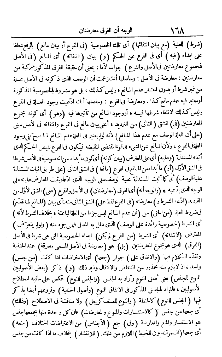 (شَرط) للعلية (مَعَ بَيَان انتفائها) أَي تِلْكَ الخصوصية (فِي الْفَرْع أَو بَيَان مَانع) بِالرَّفْع عطفا على إبداء (فِيهِ) أَي فِي الْفَرْع عَن الحكم (و) بَيَان (انتفائه) أَي الْمَانِع (فِي الأَصْل فمجموع معارضتين فِي الأَصْل وَالْفرع) جَوَاب لأما، بِمَعْنى أَن حَقِيقَة الْفرق الْمَذْكُور مركبة من معارضتين: مُعَارضَة فِي الأَصْل: وحاصلها أَنَّك زعمت أَن الْوَصْف الَّذِي ذكرته فِي الأَصْل عِلّة من غير شَرط أَو بِدُونِ اعْتِبَار عدم الْمَانِع، وَلَيْسَ كَذَلِك، بل هُوَ مَشْرُوط بالخصوصية الْمَذْكُورَة أَو مُعْتَبر فِيهِ عدم مَانع كَذَا. ومعارضة فِي الْفَرْع: وحاصلها أَنَّك ادعيت وجود الْعلَّة فِي الْفَرْع وَلَيْسَ كَذَلِك لانْتِفَاء شَرطهَا فِيهِ، أَو وجود الْمَانِع من تأثيرها فِيهِ (وَهُوَ) أَي كَونه مَجْمُوع المعارضتين (فِي) الشق (الثَّانِي) من الترديد، أَعنِي بَيَان مَانع فِي الْفَرْع وانتفائه فِي الأَصْل مَبْنِيّ (على أَن الْعلَّة الْوَصْف مَعَ عدم هَذَا الْمَانِع) لِأَنَّهُ لَو لم يعْتَبر فِي الْعلَّة عدم الْمَانِع لما صَحَّ نفي وجود الْعلَّة فِي الْفَرْع، وَلِأَن الْمَانِع عَن الشَّيْء فِي قُوَّة الْمُقْتَضى لنقيضه فَيكون فِي الْفَرْع نقيض الحكم الَّذِي أثْبته الْمُسْتَدلّ (وَعَلِيهِ) أَي على الْمُعْتَرض (بَيَان كَونه) أَي كَون مَا أبداه من الخصوصية فِي الأَصْل شرطا فِي الشق الأول (أَو) مَا أبداه من الْمَانِع فِي الْفَرْع (مَانِعا) فِي الشق الثَّانِي (على طَرِيق إِثْبَات الْمُسْتَدلّ علية الْوَصْف) أَي كَمَا أثبت الْمُسْتَدلّ علية الْوَصْف على الْوَجْه الَّذِي ادَّعَاهُ يثبت الْمعَارض عليته على الْوَجْه الَّذِي يَدعِيهِ (وَالْوَجْه أَنه) أَي الْفرق (معارضتان) فِي الأَصْل وَالْفرع (على) الشق الأول من الترديد (ادِّعَاء الشَّرْط و) معارضته (فِي الْفَرْع فَقَط على) الشق الثَّانِي مِنْهُ: أَي بَيَان (الْمَانِع لما تقدم) فِي شُرُوط الْعلَّة (من الْحق) من (أَن عدم الْمَانِع لَيْسَ جُزْءا من الْعلَّة الباعثة، بِخِلَاف الشَّرْط لِأَنَّهُ) أَي الشَّرْط (خُصُوصِيَّة زَائِدَة على الْوَصْف) الَّذِي علل بِهِ الْمُعَلل فَهِيَ جُزْء مِنْهُ (وَلَو لم يتَعَرَّض) الْمُعْتَرض (لانتفائه) أَي الشَّرْط (من الْفَرْع لم يكن) إبداء الخصوصية الَّتِي هِيَ شَرط فِي الأَصْل (الْفرق) الَّذِي هُوَ مَجْمُوع المعارضتين (بل) هُوَ (مُعَارضَة فِي الأَصْل الْمُسَمّى مُفَارقَة) عِنْد الْحَنَفِيَّة وَتقدم الْكَلَام فِيهَا (والاتفاق على) جَوَاز (جمعهَا) أَي الاعتراضات إِذا كَانَت (من جنس) وَاحِد، إِذْ لَا يلْزم مِنْهُ مَحْذُور من التَّنَاقُض والانتقال وَغير ذَلِك (و) ذكر (بعض الْأُصُولِيِّينَ النَّوْع للْجِنْس) يَعْنِي أطلق النَّوْع وَأَرَادَ بِهِ الْجِنْس (وَالْجِنْس للنوع) عكس على مَا فِيهِ اصْطِلَاح الْأُصُولِيِّينَ، فَالْمُرَاد بِالْجِنْسِ الْمَذْكُور فِي الِاتِّفَاق النَّوْع (وأصول الْحَنَفِيَّة) وفروعهم أَيْضا يذكر فِيهَا (الْجِنْس للنوع) كالحنطة (وَالنَّوْع للصنف كَرجل) وَلَا مناقشة فِي الِاصْطِلَاح (وَذَلِكَ) أَي جمعهَا من جنس (كالاستفسارات والمنوع والمعارضات) فَإِن كل وَاحِدَة مِنْهَا يجمعها جنس هُوَ الاستفسار وَالْمَنْع والمعارضة (وَفِي) جمع (الْأَجْنَاس) من الاعتراضات اخْتِلَاف (مَنعه) أَي جمعهَا (السمرقنديون للخبط) اللَّازِم من ذَلِك (للانتشار) بِخِلَاف مَا إِذا كَانَت من جنس