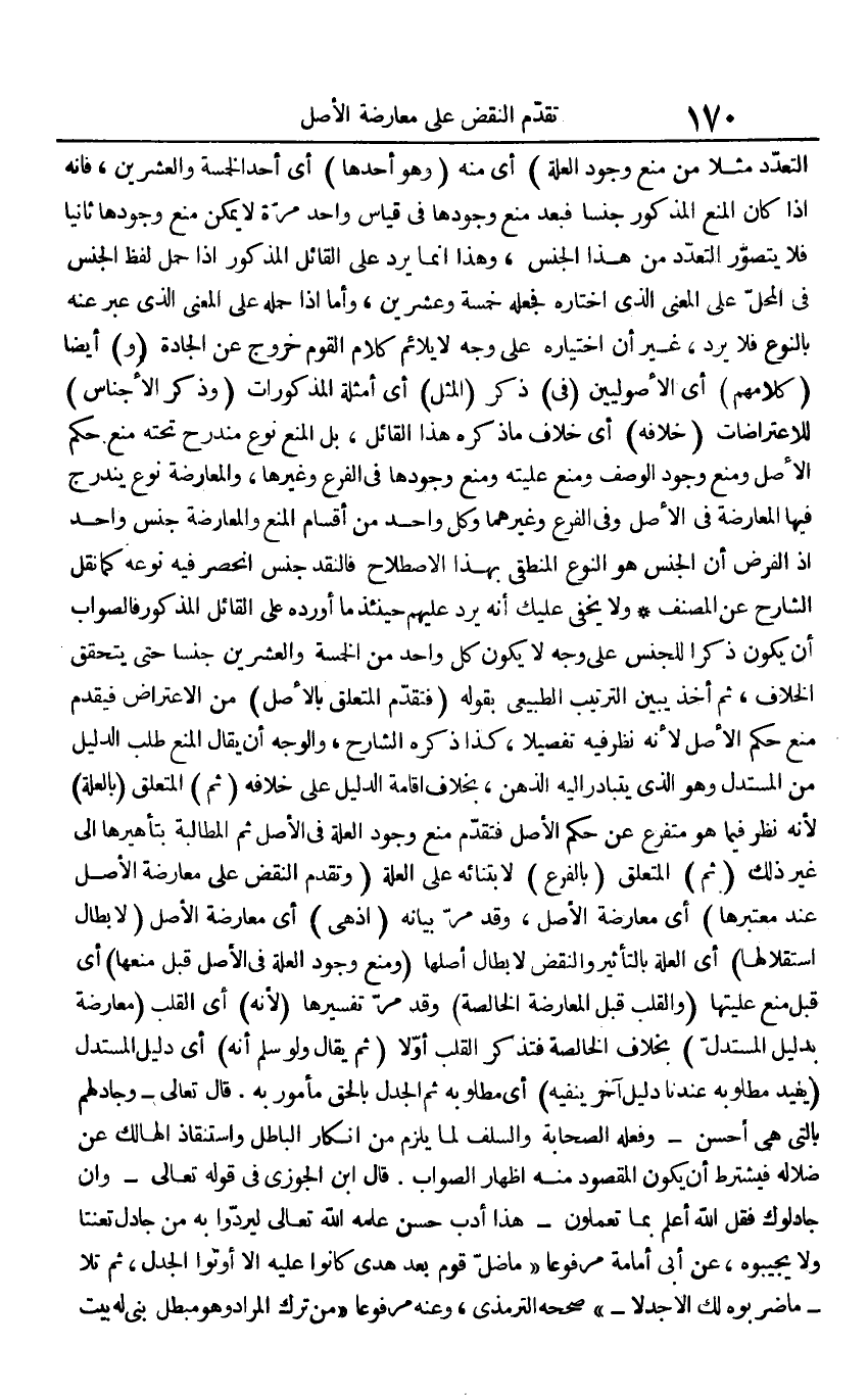 التَّعَدُّد مثلا من منع وجود الْعلَّة) أَي مِنْهُ (وَهُوَ أَحدهَا) أَي أحد الْخَمْسَة وَالْعِشْرين، فَإِنَّهُ إِذا كَانَ الْمَنْع الْمَذْكُور جِنْسا فَبعد منع وجودهَا فِي قِيَاس وَاحِد مرّة لَا يُمكن منع وجودهَا ثَانِيًا فَلَا يتَصَوَّر التَّعَدُّد من هَذَا الْجِنْس، وَهَذَا إِنَّمَا يرد على الْقَائِل الْمَذْكُور إِذا حمل لفظ الْجِنْس فِي الْمحل على الْمَعْنى الَّذِي اخْتَارَهُ فَجعله خَمْسَة وَعشْرين، وَأما إِذا حمله على الْمَعْنى الَّذِي عبر عَنهُ بالنوع فَلَا يرد، غير أَن اخْتِيَاره على وَجه لَا يلائم كَلَام الْقَوْم خُرُوج عَن الجادة (و) أَيْضا (كَلَامهم) أَي الْأُصُولِيِّينَ (فِي) ذكر (الْمثل) أَي أَمْثِلَة الْمَذْكُورَات (وَذكر الْأَجْنَاس) للاعتراضات (خِلَافه) أَي خلاف مَا ذكره هَذَا الْقَائِل، بل الْمَنْع نوع مندرج تَحْتَهُ منع حكم الأَصْل وَمنع وجود الْوَصْف وَمنع عليته وَمنع وجودهَا فِي الْفَرْع وَغَيرهَا، والمعارضة نوع ينْدَرج فِيهَا الْمُعَارضَة فِي الأَصْل وَفِي الْفَرْع وَغَيرهمَا وكل وَاحِد من أَقسَام الْمَنْع والمعارضة جنس وَاحِد إِذْ الْفَرْض أَن الْجِنْس هُوَ النَّوْع المنطقي بِهَذَا الِاصْطِلَاح فالنقد جنس انحصر فِيهِ نَوعه كَمَا نقل الشَّارِح عَن المُصَنّف وَلَا يخفى عَلَيْك أَنه يرد عَلَيْهِم حِينَئِذٍ مَا أوردهُ على الْقَائِل الْمَذْكُور فَالصَّوَاب أَن يكون ذكرا للْجِنْس على وَجه لَا يكون كل وَاحِد من الْخَمْسَة وَالْعِشْرين جِنْسا حَتَّى يتَحَقَّق الْخلاف، ثمَّ أَخذ يبين التَّرْتِيب الطبيعي بقوله (فَتقدم الْمُتَعَلّق بِالْأَصْلِ) من الِاعْتِرَاض فَيقدم منع حكم الأَصْل لِأَنَّهُ نظر فِيهِ تَفْصِيلًا، كَذَا ذكره الشَّارِح، وَالْوَجْه أَن يُقَال الْمَنْع طلب الدَّلِيل من الْمُسْتَدلّ وَهُوَ الَّذِي يتَبَادَر إِلَيْهِ الذِّهْن، بِخِلَاف إِقَامَة الدَّلِيل على خِلَافه (ثمَّ) الْمُتَعَلّق (بِالْعِلَّةِ) لِأَنَّهُ نظر فِيمَا هُوَ متفرع عَن حكم الأَصْل فَتقدم منع وجود الْعلَّة فِي الأَصْل ثمَّ الْمُطَالبَة بتأهيرها إِلَى غير ذَلِك (ثمَّ) الْمُتَعَلّق (بالفرع) لابتنائه على الْعلَّة (وَتقدم النَّقْض على مُعَارضَة الأَصْل عِنْد معتبرها) أَي مُعَارضَة الأَصْل، وَقد مر بَيَانه (إِذْ هِيَ) أَي مُعَارضَة الأَصْل (لإبطال استقلالها) أَي الْعلَّة بالتأثير والنقض لإبطال أَصْلهَا (وَمنع وجود الْعلَّة فِي الأَصْل قبل منعهَا) أَي قبل منع عليتها (وَالْقلب قبل الْمُعَارضَة الْخَالِصَة) وَقد مر تَفْسِيرهَا (لِأَنَّهُ) أَي الْقلب (مُعَارضَة بِدَلِيل الْمُسْتَدلّ) بِخِلَاف الْخَالِصَة فَتذكر الْقلب أَولا (ثمَّ يُقَال وَلَو سلم أَنه) أَي دَلِيل الْمُسْتَدلّ (يُفِيد مَطْلُوبه عندنَا دَلِيل آخر يَنْفِيه) أَي مَطْلُوبه ثمَّ الجدل بِالْحَقِّ مَأْمُور بِهِ. قَالَ تَعَالَى - {وجادلهم بِالَّتِي هِيَ أحسن} - وَفعله الصَّحَابَة وَالسَّلَف لما يلْزم من إِنْكَار الْبَاطِل واستنقاذ الْهَالِك عَن ضلاله فَيشْتَرط أَن يكون الْمَقْصُود مِنْهُ إِظْهَار الصَّوَاب. قَالَ ابْن الْجَوْزِيّ فِي قَوْله تَعَالَى - {وَإِن جادلوك فَقل الله أعلم بِمَا تَعْمَلُونَ} - هَذَا أدب حسن علمه الله تَعَالَى ليردوا بِهِ من جادل تعنتا وَلَا يُجِيبُوهُ، عَن أبي أُمَامَة مَرْفُوعا " مَا ضل قوم بعد هدي كَانُوا عَلَيْهِ إِلَّا أُوتُوا الجدل، ثمَّ تَلا - {مَا ضربوه لَك إِلَّا جدلا} - " صَححهُ التِّرْمِذِيّ، وَعنهُ مَرْفُوعا " من ترك المُرَاد وَهُوَ مُبْطل بني لَهُ بَيت