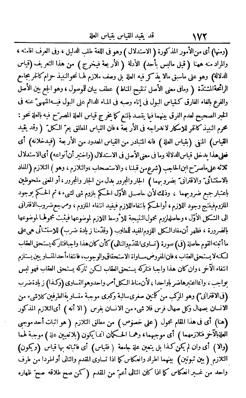 (وَمِنْهَا) أَي من الْأُمُور الْمَذْكُورَة (الِاسْتِدْلَال) وَهُوَ فِي اللُّغَة طلب الدَّلِيل، وَفِي الْعرف إِقَامَته، وَالْمرَاد مِنْهُ هَهُنَا (قيل مَا لَيْسَ بِأحد) الْأَدِلَّة (الْأَرْبَعَة فَيخرج) من هَذَا التَّعْرِيف (قِيَاس الدّلَالَة) وَهُوَ على مَا سبق مَا لَا يذكر فِيهِ الْعلَّة بل وصف ملازم لَهَا نَحْو النَّبِيذ حرَام كَالْخمرِ بِجَامِع الرَّائِحَة المشتدة (وَمَا فِي معنى الأَصْل تَنْقِيح المناط) عطف بَيَان للموصول، وَهُوَ الْجمع بَين الأَصْل وَالْفرع بإلغاء الْفَارِق كقياس الْبَوْل فِي إِنَاء وصبه فِي المَاء الدَّائِم على الْبَوْل فِيهِ الْمنْهِي عَنهُ فِي الْخَبَر الصَّحِيح لعدم الْفرق بَينهمَا فِيمَا يقْصد بِالْمَنْعِ كَمَا يخرج قِيَاس الْعلَّة الْمُصَرّح فِيهِ بِالْعِلَّةِ نَحْو: محرم النَّبِيذ كَالْخمرِ للإسكار لاندراجه فِي الْأَرْبَعَة، فَإِن الْقيَاس الْمُطلق يعم الْكل (وَقد يُقيد الْقيَاس) الْمَنْفِيّ (بِقِيَاس الْعلَّة) فَإِنَّهُ الْمُتَبَادر من الْقيَاس الْمَعْدُود من الْأَرْبَعَة (فيدخلانه) أَي فعلى هَذَا يدْخل قِيَاس الدّلَالَة وَمَا فِي معنى الأَصْل فِي الِاسْتِدْلَال (واختير أَن أَنْوَاعه) أَي الِاسْتِدْلَال ثَلَاثَة على مَا صرح ابْن الْحَاجِب (شرع من قبلنَا، والاستصحاب، والتلازم، وَهُوَ) التلازم (المفاد بالاستثنائي والاقتراني بضروبهما) الْجَار وَالْمَجْرُور بدل من الْجَار وَالْمَجْرُور، أَو الْمَعْنى ملحوظين بِاعْتِبَار جَمِيع ضروبهما، وَذَلِكَ لِأَن حَاصِل الأول الحكم بِلُزُوم شَيْء لشَيْء، ثمَّ الحكم بِوُجُود الْمَلْزُوم فينتج وجود اللَّازِم، أَو الحكم بِانْتِفَاء اللَّازِم فَيُفِيد انْتِفَاء الْمَلْزُوم، ومرجع ضروب الاقتراني إِلَى الشكل الأول، وَحَاصِله لُزُوم مَحْمُول النتيجة للأوسط اللَّازِم لموضوعها فَيثبت محمولها لموضوعها بِالضَّرُورَةِ، فَظهر أَن مفَاد الْكل اللُّزُوم الْمُفِيد للمطلوب (وَقدمنَا زِيَادَة ضرب) للاستثنائي هِيَ على مَا أثْبته الْقَوْم حَاصله (فِي) صُورَة (تَسَاوِي الْمُقدم والتالي) كَأَن كَانَ هَذَا وَاجِبا فتاركه يسْتَحق الْعقَاب لكنه لَا يسْتَحق الْعقَاب، فَإِن الْمَفْرُوض مُسَاوَاة الِاسْتِحْقَاق وَالْوُجُوب، فانتفاء أحد المتساويين يسْتَلْزم انْتِفَاء الآخر، وَإِن كَانَ هَذَا وَاجِبا فتاركه يسْتَحق الْعقَاب لَكِن تَاركه يسْتَحق الْعقَاب فَهُوَ لَيْسَ بِوَاجِب، وَإِنَّمَا اعتبرها ضربا وَاحِدًا، لِأَن منَاط الْكل أَمر وَاحِد وَهُوَ التَّسَاوِي (وَكَذَا) زِيَادَة ضرب (فِي الاقتراني) وَهُوَ الْمركب من كَلِمَتَيْنِ صغرى سالبة وكبرى مُوجبَة مُتَسَاوِيَة الطَّرفَيْنِ كلا شَيْء من الْإِنْسَان بصهال وكل صهال فرس فَلَا شَيْء من الْإِنْسَان بفرس (إِلَّا أَنه) أَي التلازم الْمَذْكُور (هُنَا) أَي فِي هَذَا الْمقَام مَحْمُول (على خُصُوص) من مُطلق التلازم (هُوَ إِثْبَات أحد موجبي الْعلَّة بِالْآخرِ فتلازمهما) أَي موجبهما، وهما الحكمان إِنَّمَا يكون (بِلَا تعْيين عِلّة) مُوجبَة لَهما (وَإِلَّا) أَي وَإِن لم يكن كَذَا بل يتَعَيَّن عِلّة جَامِعَة (فَقِيَاس) أَي فإثباته بهَا قِيَاس (وَيكون) التلازم (بَين ثبوتين) بَينهمَا اطراد وانعكاس كَمَا إِذا تساوى الْمُقدم والتالي أَو اطراد من طرف وَاحِد من غير انعكاس كَمَا إِذا كَانَ التَّالِي أَعم من الْمُقدم (كمن صَحَّ طَلَاقه صَحَّ ظِهَاره