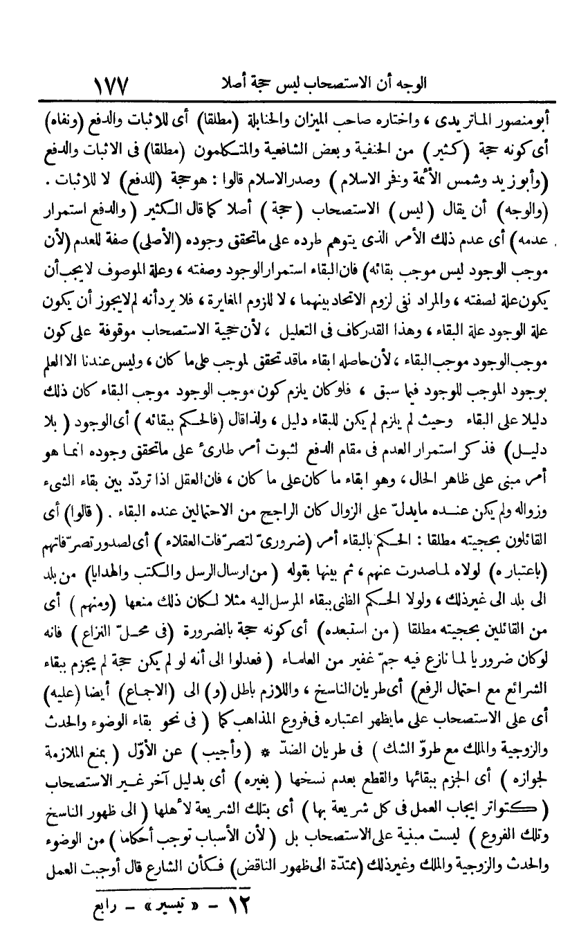 أَبُو مَنْصُور الماتريدي، وَاخْتَارَهُ صَاحب الْمِيزَان والحنابلة (مُطلقًا) أَي للإثبات وَالدَّفْع (ونفاه) أَي كَونه حجَّة (كثير) من الْحَنَفِيَّة وَبَعض الشَّافِعِيَّة والمتكلمون (مُطلقًا) فِي الْإِثْبَات وَالدَّفْع (وَأَبُو زيد وشمس الْأَئِمَّة وفخر الْإِسْلَام) وَصدر الْإِسْلَام قَالُوا: هُوَ حجَّة (للدَّفْع) لَا للإثبات. (وَالْوَجْه) أَن يُقَال (لَيْسَ) الِاسْتِصْحَاب (حجَّة) أصلا كَمَا قَالَ الْكثير (وَالدَّفْع اسْتِمْرَار عَدمه) أَي عدم ذَلِك الْأَمر الَّذِي يتَوَهَّم طرده على مَا تحقق وجوده (الْأَصْلِيّ) صفة للعدم (لِأَن مُوجب الْوُجُود لَيْسَ مُوجب بَقَائِهِ) فَإِن الْبَقَاء اسْتِمْرَار الْوُجُود وَصفته، وَعلة الْمَوْصُوف لَا يجب أَن يكون عِلّة لصفته، وَالْمرَاد نفي لُزُوم الِاتِّحَاد بَينهمَا، لَا للُزُوم الْمُغَايرَة، فَلَا يرد أَنه لم لَا يجوز أَن يكون عِلّة الْوُجُود عِلّة الْبَقَاء، وهذاالقدر كَاف فِي التَّعْلِيل، لِأَن حجية الِاسْتِصْحَاب مَوْقُوفَة على كَون مُوجب الْوُجُود مُوجب الْبَقَاء، لِأَن حَاصله إبْقَاء مَا قد تحقق لموجب على مَا كَانَ، وَلَيْسَ عندنَا إِلَّا الْعلم بِوُجُود الْمُوجب للوجود فِيمَا سبق، فَلَو كَانَ يلْزم كَون مُوجب الْوُجُود مُوجب الْبَقَاء كَانَ ذَلِك دَلِيلا على الْبَقَاء وَحَيْثُ لم يلْزم لم يكن للبقاء دَلِيل، وَلذَا قَالَ (فَالْحكم بِبَقَائِهِ) أَي الْوُجُود (بِلَا دَلِيل) فَذكر اسْتِمْرَار الْعَدَم فِي مقَام الدّفع لثُبُوت أَمر طَارِئ على مَا تحقق وجوده إِنَّمَا هُوَ أَمر مَبْنِيّ على ظَاهر الْحَال، وَهُوَ إبْقَاء مَا كَانَ على مَا كَانَ، فَإِن الْعقل إِذا تردد بَين بَقَاء الشَّيْء وزواله وَلم يكن عِنْده مَا يدل على الزَّوَال كَانَ الرَّاجِح من الِاحْتِمَالَيْنِ عِنْده الْبَقَاء. (قَالُوا) أَي الْقَائِلُونَ بحجيته مُطلقًا: الحكم بِالْبَقَاءِ أَمر (ضَرُورِيّ لتصرفات الْعُقَلَاء) أَي لصدور تصرفاتهم (بِاعْتِبَارِهِ) لولاه لما صدرت عَنْهُم، ثمَّ بَينهَا بقوله (من إرْسَال الرُّسُل والكتب والهدايا) من بلد إِلَى بلد إِلَى غير ذَلِك، وَلَوْلَا الحكم الظني بِبَقَاء الْمُرْسل إِلَيْهِ مثلا لَكَانَ ذَلِك منعهَا (وَمِنْهُم) أَي من الْقَائِلين بحجيته مُطلقًا (من استبعده) أَي كَونه حجَّة بِالضَّرُورَةِ (فِي مَحل النزاع) فَإِنَّهُ لَو كَانَ ضَرُورِيًّا لما نَازع فِيهِ جم غفير من الْعلمَاء (فعدلوا إِلَى أَنه لَو لم يكن حجَّة لم يجْزم بِبَقَاء الشَّرَائِع مَعَ احْتِمَال الرّفْع) أَي طريان النَّاسِخ، وَاللَّازِم بَاطِل (و) إِلَى (الْإِجْمَاع) أَيْضا (عَلَيْهِ) أَي على الِاسْتِصْحَاب على مَا يظْهر اعْتِبَاره فِي فروع الْمذَاهب كَمَا (فِي نَحْو بَقَاء الْوضُوء وَالْحَدَث والزوجية وَالْملك مَعَ طرُو الشَّك) فِي طريان الضِّدّ (وَأجِيب) عَن الأول (بِمَنْع الْمُلَازمَة لجوازه) أَي الْجَزْم ببقائها وَالْقطع بِعَدَمِ نسخهَا (بِغَيْرِهِ) أَي بِدَلِيل آخر غير الِاسْتِصْحَاب (كتواتر إِيجَاب الْعَمَل فِي كل شَرِيعَة بهَا) أَي بِتِلْكَ الشَّرِيعَة لأَهْلهَا (إِلَى ظُهُور النَّاسِخ وَتلك الْفُرُوع) لَيست مَبْنِيَّة على الِاسْتِصْحَاب بل (لِأَن الْأَسْبَاب توجب أحكاما) من الْوضُوء وَالْحَدَث والزوجية وَالْملك وَغير ذَلِك (ممتدة إِلَى ظُهُور الناقض) فَكَأَن الشَّارِع قَالَ أوجبت الْعَمَل