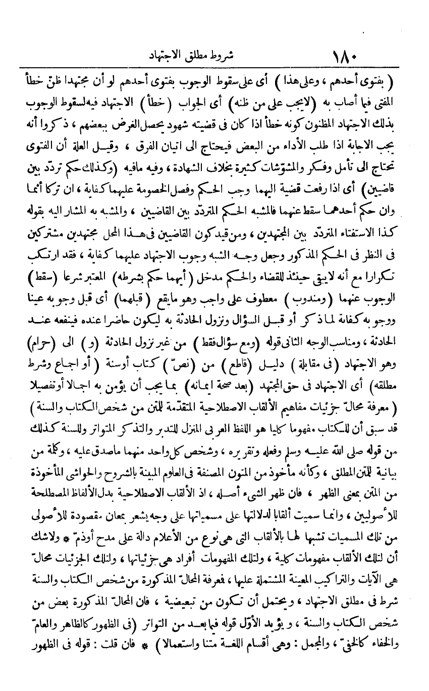 (بفتوى أحدهم، وعَلى هَذَا) أَي على سُقُوط الْوُجُوب بفتوى أحدهم لَو أَن مُجْتَهدا ظن خطأ الْمُفْتِي فِيمَا أصَاب بِهِ (لَا يجب على من ظَنّه) أَي الْجَواب (خطأ) الِاجْتِهَاد فِيهِ لسُقُوط الْوُجُوب بذلك الِاجْتِهَاد المظنون كَونه خطأ إِذا كَانَ فِي قَضيته شُهُود يحصل الْغَرَض ببعضهم، ذكرُوا أَنه يجب الْإِجَابَة إِذا طلب الْأَدَاء من الْبَعْض فَيحْتَاج إِلَى إتْيَان الْفرق، وَقيل الْعلَّة أَن الْفَتْوَى تحْتَاج إِلَى تَأمل وفكر والمشوشات كَثِيرَة بِخِلَاف الشَّهَادَة، وَفِيه مَا فِيهِ (وَكَذَلِكَ حكم تردد بَين قاضيين) أَي إِذا رفعت قَضِيَّة إِلَيْهِمَا وَجب الحكم وَفصل الْخُصُومَة عَلَيْهِمَا كِفَايَة، إِن تركا أثما وَإِن حكم أحدهم سقط عَنْهُمَا فالمشبه الحكم المتردد بَين القاضيين، والمشبه بِهِ الْمشَار إِلَيْهِ بقوله كَذَا الاستفتاء المتردد بَين الْمُجْتَهدين، وَمن قيد كَون القاضيين فِي هَذَا الْمحل مجتهدين مشتركين فِي النّظر فِي الحكم الْمَذْكُور وَجعل وَجه الشّبَه وجوب الِاجْتِهَاد عَلَيْهِمَا كِفَايَة، فقد ارْتكب تَكْرَارا مَعَ أَنه لَا يبْقى حِينَئِذٍ للْقَضَاء وَالْحكم مدْخل (أَيهمَا حكم بِشَرْطِهِ) الْمُعْتَبر شرعا (سقط) الْوُجُوب عَنْهُمَا (ومندوب) مَعْطُوف على وَاجِب وَهُوَ مَا يَقع (قبلهمَا) أَي قبل وُجُوبه عينا ووجوبه كِفَايَة لما ذكر أَو قبل السُّؤَال ونزول الْحَادِثَة بِهِ ليَكُون حَاضرا عِنْده فينفعه عِنْد الْحَادِثَة، ومناسب الْوَجْه الثَّانِي قَوْله (وَمَعَ سُؤال فَقَط) من غير نزُول الْحَادِثَة (و) إِلَى (حرَام) وَهُوَ الِاجْتِهَاد (فِي مُقَابلَة) دَلِيل (قَاطع) من (نَص) كتاب أَو سنة (أَو إِجْمَاع وَشرط مطلقه) أَي الِاجْتِهَاد فِي حق الْمُجْتَهد (بعد صِحَة إيمَانه) بِمَا يجب أَن يُؤمن بِهِ إِجْمَالا أَو تَفْصِيلًا (معرفَة محَال جزئيات مفاهيم الألقاب الاصطلاحية الْمُتَقَدّمَة للمتن من شخص الْكتاب وَالسّنة) قد سبق أَن للْكتاب مفهوما كليا هُوَ اللَّفْظ الْعَرَبِيّ الْمنزل للتدبر والتذكر الْمُتَوَاتر وللسنة كَذَلِك من قَوْله صلى الله عَلَيْهِ وَسلم وَفعله وَتَقْرِيره، وشخص كل وَاحِد مِنْهُمَا مَا صدق عَلَيْهِ، وَكلمَة من بَيَانِيَّة للمتن الْمُطلق، وَكَأَنَّهُ مَأْخُوذ من الْمُتُون المصنفة فِي الْعُلُوم المبينة بالشروح والحواشي الْمَأْخُوذَة من الْمَتْن بِمَعْنى الظّهْر، فَإِن ظهر الشَّيْء أَصله، إِذْ الألقاب الاصطلاحية بدل الْأَلْفَاظ المصطلحة للأصوليين، وَإِنَّمَا سميت ألقابا لدلالتها على مسمياتها على وَجه يشْعر بمعان مَقْصُودَة للأصولي من تِلْكَ المسميات تشبها لَهَا بِالْأَلْقَابِ الَّتِي هِيَ نوع من الْأَعْلَام دَالَّة على مدح أَو ذمّ وَلَا شكّ أَن لتِلْك الألقاب مفهومات كُلية، ولتلك المفهومات أَفْرَاد هِيَ جزئياتها، ولتلك الجزئيات محَال هِيَ الْآيَات والتراكيب الْمعينَة الْمُشْتَملَة عَلَيْهَا، فمعرفة الْمحَال الْمَذْكُورَة من شخص الْكتاب وَالسّنة شَرط فِي مُطلق الِاجْتِهَاد، وَيحْتَمل أَن تكون من تبعيضية، فَإِن الْمحَال الْمَذْكُورَة بعض من شخص الْكتاب وَالسّنة، وَيُؤَيّد الأول قَوْله فِيمَا بعد من التَّوَاتُر (فِي الظُّهُور كَالظَّاهِرِ وَالْعَام والخفاء كالخفي، والمجمل: وَهِي أَقسَام اللُّغَة متْنا واستعمالا) فَإِن قلت: قَوْله فِي الظُّهُور