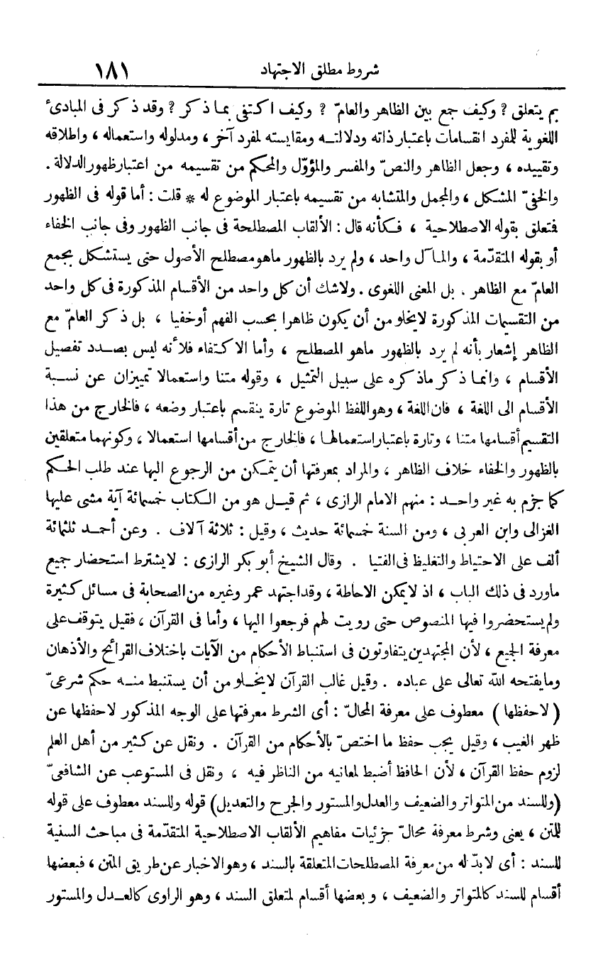 بِمَ يتَعَلَّق؟ وَكَيف جمع بَين الظَّاهِر وَالْعَام؟ وَكَيف اكْتفى بِمَا ذكر؟ وَقد ذكر فِي المبادئ اللُّغَوِيَّة للمفرد انقسامات بِاعْتِبَار ذَاته ودلالته ومقايسته لمفرد آخر، ومدلوله واستعماله، وإطلاقه وتقييده، وَجعل الظَّاهِر وَالنَّص والمفسر والمؤول والمحكم من تقسيمه من اعْتِبَار ظُهُور الدّلَالَة. والخفي الْمُشكل، والمجمل والمتشابه من تقسيمه بِاعْتِبَار الْمَوْضُوع لَهُ قلت: أما قَوْله فِي الظُّهُور فمتعلق بقوله الاصطلاحية، فَكَأَنَّهُ قَالَ: الألقاب المصطلحة فِي جَانب الظُّهُور وَفِي جَانب الخفاء أَو بقوله الْمُتَقَدّمَة، والمآل وَاحِد، وَلم يرد بالظهور مَا هُوَ مصطلح الْأُصُول حَتَّى يسْتَشْكل بِجمع الْعَام مَعَ الظَّاهِر، بل الْمَعْنى اللّغَوِيّ. وَلَا شكّ أَن كل وَاحِد من الْأَقْسَام الْمَذْكُورَة فِي كل وَاحِد من التقسيمات الْمَذْكُورَة لَا يَخْلُو من أَن يكون ظَاهرا بِحَسب الْفَهم أَو خفِيا، بل ذكر الْعَام مَعَ الظَّاهِر إِشْعَار بِأَنَّهُ لم يرد بالظهور مَا هُوَ المصطلح، وَأما الِاكْتِفَاء فَلِأَنَّهُ لَيْسَ بصدد تَفْصِيل الْأَقْسَام، وَإِنَّمَا ذكر مَا ذكره على سَبِيل التَّمْثِيل، وَقَوله متْنا واستعمالا تمييزان عَن نِسْبَة الْأَقْسَام إِلَى اللُّغَة، فَإِن اللُّغَة، وَهُوَ اللَّفْظ الْمَوْضُوع تَارَة يَنْقَسِم بِاعْتِبَار وَضعه، فالخارج من هَذَا التَّقْسِيم أقسامها متْنا، وَتارَة بِاعْتِبَار اسْتِعْمَالهَا، فالخارج من أقسامها اسْتِعْمَالا، وكونهما مُتَعَلقين بالظهور والخفاء خلاف الظَّاهِر، وَالْمرَاد بمعرفتها أَن يتَمَكَّن من الرُّجُوع إِلَيْهَا عِنْد طلب الحكم كَمَا جزم بِهِ غير وَاحِد: مِنْهُم الإِمَام الرَّازِيّ، ثمَّ قيل هُوَ من الْكتاب خَمْسمِائَة آيَة مَشى عَلَيْهَا الْغَزالِيّ وَابْن الْعَرَبِيّ، وَمن السّنة خَمْسمِائَة حَدِيث، وَقيل: ثَلَاثَة آلَاف. وَعَن أَحْمد ثلثمِائة ألف على الِاحْتِيَاط والتغليظ فِي الْفتيا. وَقَالَ الشَّيْخ أَبُو بكر الرَّازِيّ: لَا يشْتَرط استحضار جَمِيع مَا ورد فِي ذَلِك الْبَاب، إِذْ لَا يُمكن الْإِحَاطَة، وَقد اجْتهد عمر وَغَيره من الصَّحَابَة فِي مسَائِل كَثِيرَة وَلم يستحضروا فِيهَا الْمَنْصُوص حَتَّى رويت لَهُم فَرَجَعُوا إِلَيْهَا، وَأما فِي الْقُرْآن، فَقيل يتَوَقَّف على معرفَة الْجَمِيع، لِأَن الْمُجْتَهدين يتفاوتون فِي استنباط الْأَحْكَام من الْآيَات باخْتلَاف القرائح والأذهان وَمَا يَفْتَحهُ الله تَعَالَى على عباده. وَقيل غَالب الْقُرْآن لَا يَخْلُو من أَن يستنبط مِنْهُ حكم شَرْعِي (لاحفظها) مَعْطُوف على معرفَة الْمحَال: أَي الشَّرْط مَعْرفَتهَا على الْوَجْه الْمَذْكُور لأحفظها عَن ظهر الْغَيْب، وَقيل يجب حفظ مَا اخْتصَّ بِالْأَحْكَامِ من الْقُرْآن. وَنقل عَن كثير من أهل الْعلم لُزُوم حفظ الْقُرْآن، لِأَن الْحَافِظ أضبط لمعانيه من النَّاظر فِيهِ، وَنقل فِي الْمُسْتَوْعب عَن الشَّافِعِي (وللسند من الْمُتَوَاتر والضعيف وَالْعدْل والمستور وَالْجرْح وَالتَّعْدِيل) قَوْله وللسند مَعْطُوف على قَوْله للمتن، يَعْنِي وَشرط معرفَة محَال جزئيات مفاهيم الألقاب الاصطلاحية الْمُتَقَدّمَة فِي مبَاحث السّنيَّة للسند: أَي لَا بُد لَهُ من معرفَة المصطلحات الْمُتَعَلّقَة بالسند، وَهُوَ الْإِخْبَار عَن طَرِيق الْمَتْن، فبعضها أَقسَام للسند كالمتواتر والضعيف، وَبَعضهَا أَقسَام لمتعلق السَّنَد، وَهُوَ الرَّاوِي كالعدل والمستور