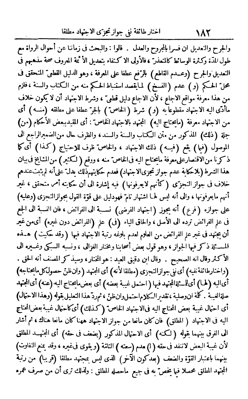 وَالْجرْح وَالتَّعْدِيل إِن فسرا بالجروح وَالْعدْل. قَالُوا: والبحث فِي زَمَاننَا عَن أَحْوَال الروَاة مَعَ طول الْمدَّة وَكَثْرَة الوسائط كالمتعذر، فَالْأولى الِاكْتِفَاء بتعديل الْأَئِمَّة الْمَعْرُوف صِحَة مَذْهَبهم فِي التَّعْدِيل وَالْجرْح (وَعدم الْقَاطِع) بِالرَّفْع عطفا على الْمعرفَة، وَهُوَ الدَّلِيل الْقطعِي المتحقق فِي مَحل الحكم (و) عدم (النّسخ) لما يقْصد استنباط الحكم مِنْهُ من الْكتاب وَالسّنة، فَلَزِمَ من هَذَا معرفَة مواقع الْإِجْمَاع، لِأَن الْإِجْمَاع دَلِيل قَطْعِيّ، وَشرط الِاجْتِهَاد أَن لَا يكون خلاف مَا أدّى إِلَيْهِ الِاجْتِهَاد مَقْطُوعًا بِهِ (و) شَرط (الْخَاص) بِالْجَرِّ عطفا على مطلقه (مِنْهُ) أَي من الِاجْتِهَاد معرفَة (مَا يحْتَاج إِلَيْهِ) الْمُجْتَهد بِالِاجْتِهَادِ الْخَاص: أَي الْمُقَيد بِبَعْض الْأَحْكَام (من) جملَة (ذَلِك) الْمَذْكُور من متن الْكتاب وَالسّنة والسند، والظرف حَال من الضَّمِير الرَّاجِع إِلَى الْمَوْصُول (فِيمَا) يَقع (فِيهِ) ذَلِك الِاجْتِهَاد، وَالْخَاص ظرف للاحتياج (كَذَا) أَي كَمَا ذكرنَا من الِاقْتِصَار على معرفَة مَا يحْتَاج إِلَيْهِ فِي الْخَاص مِنْهُ، وَوَقع (لكثير) من الْمَشَايِخ فِي بَيَان هَذَا الشَّرْط (بِلَا حِكَايَة عدم جَوَاز تجزي الِاجْتِهَاد) فَعدم حكايتهم ذَلِك يدل على أَنه لم يثبت عِنْدهم خلاف فِي جَوَاز التجزي (كَأَنَّهُمْ لَا يعرفونها) فِيهِ إِشَارَة إِلَى أَن حكايته أَمر مُتَحَقق، غير أَنهم مَا يعرفونها، وَإِلَى أَنه لَيْسَ لَهَا اشتهار تَامّ فَهُوَ دَلِيل على قُوَّة القَوْل بِجَوَاز التجزي (وَعَلِيهِ) على جَوَازه (فرع) أَنه يجوز (اجْتِهَاد الفرضي) نِسْبَة إِلَى الْفَرَائِض، فَإِن النِّسْبَة إِلَى الْجمع فِي علم الْفَرَائِض ترده إِلَى الأَصْل، وإلحاق الْيَاء (فِي) علم (الْفَرَائِض دون غَيره) أَي من غير أَن يجْتَهد فِي غير علم الْفَرَائِض من الْعُلُوم لعدم بُلُوغه رُتْبَة الِاجْتِهَاد فِيهَا (وَقد حكيت) هَذِه المسئلة ذكر فِيهَا الْجَوَاز، وَهُوَ قَول بعض أَصْحَابنَا ومختار الْغَزالِيّ، وَنسبه السُّبْكِيّ وَغَيره إِلَى الْأَكْثَر وَقَالَ أَنه الصَّحِيح. وَقَالَ ابْن دَقِيق الْعِيد: هُوَ الْمُخْتَار، وَسَيذكر المُصَنّف أَنه الْحق. (وَاخْتَارَ طَائِفَة نَفْيه) أَي نفي جَوَاز التجزي (مُطلقًا لِأَنَّهُ) أَي الْمُجْتَهد (وَإِن ظن حُصُول كل مَا يَحْتَاجهُ) أَي إِلَيْهِ (لَهَا) أَي للمسئلة الْمُجْتَهد فِيهَا (احْتمل غيبَة بعضه) أَي بعض مَا يحْتَاج إِلَيْهِ (عَنهُ) أَي الْمُجْتَهد صلَة الْغَيْبَة. كلمة أَن وصلية، تَقْدِير الْكَلَام احْتمل وَإِن ظن، ثمَّ رد هَذَا التَّعْلِيل بقوله (وَهَذَا الِاحْتِمَال) أَي احْتِمَال غيبَة بعض الْمُحْتَاج إِلَيْهِ فِي الِاجْتِهَاد الْخَاص (كَذَلِك) أَي كاحتمال غيبَة بعض الْمُحْتَاج إِلَيْهِ فِي الِاجْتِهَاد (الْمُطلق) فَإِن كَانَ مَانِعا من جَوَاز الِاجْتِهَاد هَهُنَا كَانَ مَانِعا هُنَاكَ، ثمَّ أَشَارَ إِلَى الْفرق بَينهمَا بقوله (لكنه) أَي الِاحْتِمَال الْمَذْكُور (يضعف فِي حَقه) أَي الْمُجْتَهد الْمُطلق لِأَن غيبَة الْبَعْض لَا تنفد فِي حَقه (ل) عدم (سعته) التَّامَّة (ويقوى فِي غَيره، وَقد يمْنَع التَّفَاوُت) بَينهمَا بِاعْتِبَار الْقُوَّة والضعف (بعد كَون الآخر) الَّذِي لَيْسَ بمجتهد مُطلقًا (قَرِيبا) من رُتْبَة الْمُجْتَهد الْمُطلق محصلا فِيمَا يخص بِهِ فِي جَمِيع مَا حصله الْمُطلق: وَلذَلِك ترى أَن من صرف عمره