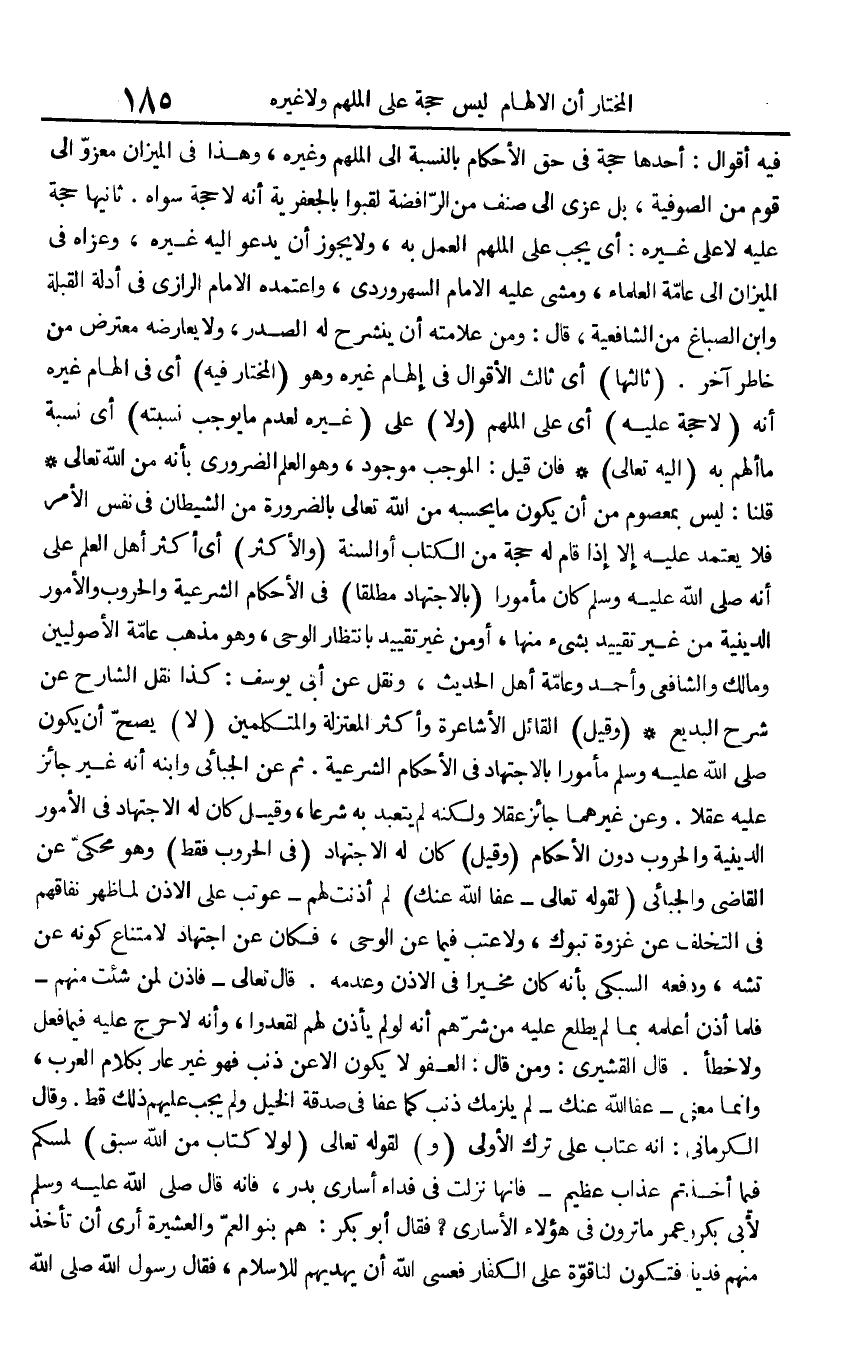 فِيهِ أَقْوَال: أَحدهَا حجَّة فِي حق الْأَحْكَام بِالنِّسْبَةِ إِلَى الملهم وَغَيره، وَهَذَا فِي الْمِيزَان معزو إِلَى قوم من الصُّوفِيَّة، بل عزى إِلَى صنف من الرافضة لقبوا بالجعفرية أَنه لَا حجَّة سواهُ ثَانِيهَا حجَّة عَلَيْهِ لَا على غَيره: أَي يجب على الملهم الْعَمَل بِهِ، وَلَا يجوز أَن يَدْعُو إِلَيْهِ غَيره، وَعَزاهُ فِي الْمِيزَان إِلَى عَامَّة الْعلمَاء، وَمَشى عَلَيْهِ الإِمَام السهروردي، وَاعْتَمدهُ الإِمَام الرَّازِيّ فِي أَدِلَّة الْقبْلَة وَابْن الصّباغ من الشَّافِعِيَّة، قَالَ: وَمن علامته أَن ينشرح لَهُ الصَّدْر، وَلَا يُعَارضهُ معترض من خاطر آخر. (ثَالِثهَا) أَي ثَالِث الْأَقْوَال فِي إلهام غَيره وَهُوَ (الْمُخْتَار فِيهِ) أَي فِي إلهام غَيره أَنه (لَا حجَّة عَلَيْهِ) أَي على الملهم (وَلَا) على (غَيره لعدم مَا يُوجب نسبته) أَي نِسْبَة مَا ألهم بِهِ (إِلَيْهِ تَعَالَى) فَإِن قيل: الْمُوجب مَوْجُود، وَهُوَ الْعلم الضَّرُورِيّ بِأَنَّهُ من الله تَعَالَى قُلْنَا: لَيْسَ بمعصوم من أَن يكون مَا يحسبه من الله تَعَالَى بِالضَّرُورَةِ من الشَّيْطَان فِي نفس الْأَمر فَلَا يعْتَمد عَلَيْهِ إِلَّا إِذا قَامَ لَهُ حجَّة من الْكتاب أَو السّنة (وَالْأَكْثَر) أَي أَكثر أهل الْعلم على أَنه صلى الله عَلَيْهِ وَسلم كَانَ مَأْمُورا (بِالِاجْتِهَادِ مُطلقًا) فِي الْأَحْكَام الشَّرْعِيَّة والحروب والأمور الدِّينِيَّة من غير تَقْيِيد بِشَيْء مِنْهَا، أَو من غير تَقْيِيد بانتظار الْوَحْي، وَهُوَ مَذْهَب عَامَّة الْأُصُولِيِّينَ وَمَالك وَالشَّافِعِيّ وَأحمد وَعَامة أهل الحَدِيث، وَنقل عَن أبي يُوسُف: كَذَا نقل الشَّارِح عَن شرح البديع (وَقيل) الْقَائِل الأشاعرة وَأكْثر الْمُعْتَزلَة والمتكلمين (لَا) يَصح أَن يكون صلى الله عَلَيْهِ وَسلم مَأْمُورا بِالِاجْتِهَادِ فِي الْأَحْكَام الشَّرْعِيَّة. ثمَّ عَن الجبائي وَابْنه أَنه غير جَائِز عَلَيْهِ عقلا. وَعَن غَيرهمَا جَائِز عقلا وَلكنه لم يتعبد بِهِ شرعا، وَقيل كَانَ لَهُ الِاجْتِهَاد فِي الْأُمُور الدِّينِيَّة والحروب دون الْأَحْكَام (وَقيل) كَانَ لَهُ الِاجْتِهَاد (فِي الحروب فَقَط) وَهُوَ محكي عَن القَاضِي والجبائي (لقَوْله تَعَالَى - {عَفا الله عَنْك لم أَذِنت لَهُم} - عوتب على الْإِذْن لما ظهر نفاقهم فِي التَّخَلُّف عَن غَزْوَة تَبُوك، وَلَا عتب فِيمَا عَن الْوَحْي، فَكَانَ عَن اجْتِهَاد لِامْتِنَاع كَونه عَن تشه، وَدفعه السُّبْكِيّ بِأَنَّهُ كَانَ مُخَيّرا فِي الْأذن وَعَدَمه. قَالَ تَعَالَى - {فَأذن لمن شِئْت مِنْهُم} - فَلَمَّا أذن أعلمهُ بِمَا لم يطلع عَلَيْهِ من شرهم أَنه لَو لم يَأْذَن لَهُم لقعدوا، وَأَنه لَا حرج عَلَيْهِ فِيمَا فعل وَلَا خطأ. قَالَ الْقشيرِي: وَمن قَالَ: الْعَفو لَا يكون إِلَّا عَن ذَنْب فَهُوَ غير عَار بِكَلَام الْعَرَب، وَإِنَّمَا معنى - {عَفا الله عَنْك} - لم يلزمك ذَنْب كَمَا عَفا فِي صَدَقَة الْخَيل وَلم يجب عَلَيْهِم ذَلِك قطّ. وَقَالَ الْكرْمَانِي: أَنه عتاب على ترك الأولى (و) لقَوْله تَعَالَى {لَوْلَا كتاب من الله سبق لمسكم فِيمَا أَخَذْتُم عَذَاب عَظِيم} - فَإِنَّهَا نزلت فِي فدَاء أُسَارَى بدر، فَإِنَّهُ قَالَ صلى الله عَلَيْهِ وَسلم لأبي بكر وَعمر مَا ترَوْنَ فِي هَؤُلَاءِ الْأُسَارَى؟ فَقَالَ أَبُو بكر: هم بَنو الْعم وَالْعشيرَة أرى أَن تَأْخُذ مِنْهُم فديَة فَتكون لنا قُوَّة على الْكفَّار فَعَسَى الله أَن يهْدِيهم لِلْإِسْلَامِ، فَقَالَ رَسُول الله صلى الله عَلَيْهِ وَسلم: