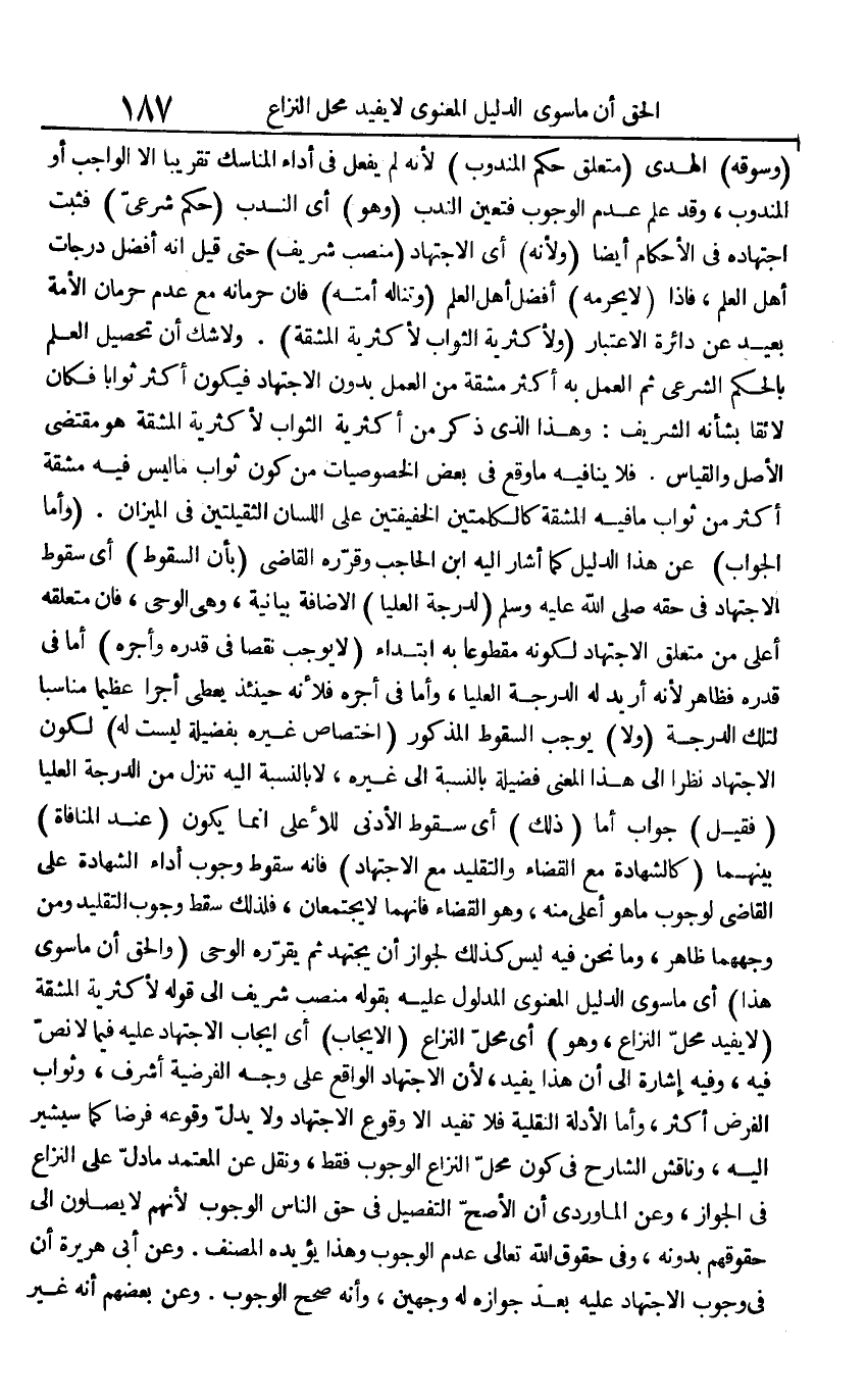 (وسوقه) الْهدى (مُتَعَلق حكم الْمَنْدُوب) لِأَنَّهُ لم يفعل فِي أَدَاء الْمَنَاسِك تَقْرِيبًا إِلَّا الْوَاجِب أَو الْمَنْدُوب، وَقد علم عدم الْوُجُوب فَتعين النّدب (وَهُوَ) أَي النّدب (حكم شَرْعِي) فَثَبت اجْتِهَاده فِي الْأَحْكَام أَيْضا (وَلِأَنَّهُ) أَي الِاجْتِهَاد (منصب شرِيف) حَتَّى قيل أَنه أفضل دَرَجَات أهل الْعلم، فَإِذا (لَا يحرمه) أفضل أهل الْعلم (وتناله أمته) فَإِن حرمانه مَعَ عدم حرمَان الْأمة بعيد عَن دَائِرَة الِاعْتِبَار (ولأكثرية الثَّوَاب لأكثرية الْمَشَقَّة). وَلَا شكّ أَن تَحْصِيل الْعلم بالحكم الشَّرْعِيّ ثمَّ الْعَمَل بِهِ أَكثر مشقة من الْعَمَل بِدُونِ الِاجْتِهَاد فَيكون أَكثر ثَوابًا فَكَانَ لائقا بِشَأْنِهِ الشريف: وَهَذَا الَّذِي ذكر من أكثرية الثَّوَاب لأكثرية الْمَشَقَّة هُوَ مُقْتَضى الأَصْل وَالْقِيَاس. فَلَا يُنَافِيهِ مَا وَقع فِي بعض الخصوصيات من كَون ثَوَاب مَا لَيْسَ فِيهِ مشقة أَكثر من ثَوَاب مَا فِيهِ الْمَشَقَّة كالكلمتين الخفيفتين على اللِّسَان الثقيلتين فِي الْمِيزَان. (وَأما الْجَواب) عَن هَذَا الدَّلِيل كَمَا أَشَارَ إِلَيْهِ ابْن الْحَاجِب وَقَررهُ القَاضِي (بِأَن السُّقُوط) أَي سُقُوط الِاجْتِهَاد فِي حَقه صلى الله عَلَيْهِ وَسلم (لدرجة الْعليا) الْإِضَافَة بَيَانِيَّة، وَهِي الْوَحْي، فَإِن مُتَعَلّقه أَعلَى من مُتَعَلق الِاجْتِهَاد لكَونه مَقْطُوعًا بِهِ ابْتِدَاء (لَا يُوجب نقصا فِي قدره وأجره) أما فِي قدره فَظَاهر لِأَنَّهُ أُرِيد لَهُ الدرجَة الْعليا، وَأما فِي أجره فَلِأَنَّهُ حِينَئِذٍ يُعْطي أجرا عَظِيما مناسبا لتِلْك الدرجَة (وَلَا) يُوجب السُّقُوط الْمَذْكُور (اخْتِصَاص غَيره بفضيلة لَيست لَهُ) لكَون الِاجْتِهَاد نظرا إِلَى هَذَا الْمَعْنى فَضِيلَة بِالنِّسْبَةِ إِلَى غَيره، لَا بِالنِّسْبَةِ إِلَيْهِ تنزل من الدرجَة الْعليا (فَقيل) جَوَاب أما (ذَلِك) أَي سُقُوط الْأَدْنَى للأعلى إِنَّمَا يكون (عِنْد الْمُنَافَاة) بَينهمَا (كَالشَّهَادَةِ مَعَ الْقَضَاء والتقليد مَعَ الِاجْتِهَاد) فَإِنَّهُ سُقُوط وجوب أَدَاء الشَّهَادَة على القَاضِي لوُجُوب مَا هُوَ أَعلَى مِنْهُ، وَهُوَ الْقَضَاء فَإِنَّهُمَا لَا يَجْتَمِعَانِ، فَلذَلِك سقط وجوب التَّقْلِيد وَمن وجههما ظَاهر، وَمَا نَحن فِيهِ لَيْسَ كَذَلِك لجَوَاز أَن يجْتَهد ثمَّ يقرره الْوَحْي (وَالْحق أَن مَا سوى هَذَا) أَي مَا سوى الدَّلِيل الْمَعْنَوِيّ الْمَدْلُول عَلَيْهِ بقوله منصب شرِيف إِلَى قَوْله لأكثرية الْمَشَقَّة (لَا يُفِيد مَحل النزاع، وَهُوَ) أَي مَحل النزاع (الْإِيجَاب) أَي إِيجَاب الِاجْتِهَاد عَلَيْهِ فِيمَا لَا نَص فِيهِ، وَفِيه إِشَارَة إِلَى أَن هَذَا يُفِيد، لِأَن الِاجْتِهَاد الْوَاقِع على وَجه الْفَرْضِيَّة أشرف، وثواب الْفَرْض أَكثر، وَأما الْأَدِلَّة النقلية فَلَا تفِيد إِلَّا وُقُوع الِاجْتِهَاد وَلَا يدل وُقُوعه فرضا كَمَا سيشير إِلَيْهِ، وناقش الشَّارِح فِي كَون مَحل النزاع الْوُجُوب فَقَط، وَنقل عَن الْمُعْتَمد مَا دلّ على النزاع فِي الْجَوَاز، وَعَن الْمَاوَرْدِيّ أَن الْأَصَح التَّفْصِيل فِي حق النَّاس الْوُجُوب لأَنهم لَا يصلونَ إِلَى حُقُوقهم بِدُونِهِ، وَفِي حُقُوق الله تَعَالَى عدم الْوُجُوب وَهَذَا يُؤَيّدهُ المُصَنّف. وَعَن أبي هُرَيْرَة أَن فِي وجوب الِاجْتِهَاد عَلَيْهِ بعد جَوَازه لَهُ وَجْهَيْن، وَأَنه صحّح الْوُجُوب. وَعَن بَعضهم أَنه غير