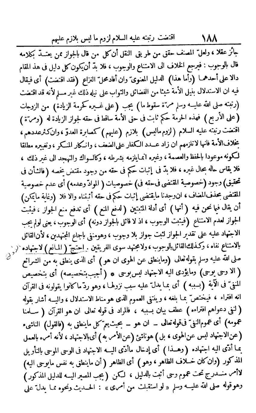 جَائِز عقلا، وَلَعَلَّ المُصَنّف حقق من طَرِيق النَّقْل أَن كل من قَالَ بِالْجَوَازِ مِمَّن يعْتد بِكَلَامِهِ قَالَ بِالْوُجُوب: فَيرجع الْخلاف إِلَى الِامْتِنَاع وَالْوُجُوب، فَلَا بُد أَن يكون كل دَلِيل فِي هَذَا الْمقَام دَالا على أَحدهمَا (وَأما هَذَا) الدَّلِيل الْمَعْنَوِيّ وَإِن أَفَادَ مَحل النزاع (فقد اقْتَضَت) أَي فَيُقَال فِيهِ إِن الِاسْتِدْلَال بنيل الْأمة شَيْئا من الْفَضَائِل وَالثَّوَاب على نيله ذَلِك غير مُسلم لِأَنَّهُ قد اقْتَضَت (رتبته صلى الله عَلَيْهِ وَسلم مرّة سُقُوط مَا) يجب (على غَيره كَحُرْمَةِ الزِّيَادَة) من الزَّوْجَات (على الْأَرْبَع) فَهَذِهِ الْحُرْمَة حكم ثَابت فِي حق الْأمة سَاقِط فِي حَقه لجَوَاز الزِّيَادَة لَهُ (وَمرَّة) اقْتَضَت رتبته صلى الله عَلَيْهِ وَسلم (لُزُوم مَا لَيْسَ) بِلَازِم (عَلَيْهِم) كمصابرة الْعَدو، وَإِن كثر عَددهمْ، بِخِلَاف الْأمة فَإِنَّهَا لَا تلزمهم إِن زَاد عدد الْكفَّار على الضعْف، وإنكار الْمُنكر، وتغييره مُطلقًا لكَونه مَوْعُودًا بِالْحِفْظِ والعصمة، وَغَيره إِنَّمَا يلْزمه بِشَرْطِهِ، وكالسواك والتهجد إِلَى غير ذَلِك، فَلَا يُقَاس حَاله بِحَال غَيره، فَلَا بُد فِي إِثْبَات حكم فِي حَقه من وجود مُقْتَض يَخُصُّهُ (فالشأن فِي تَحْقِيق) وجود (خُصُوصِيَّة الْمُقْتَضى فِي حَقه فِي) خصوصيات (الْموَاد وَعَدَمه) أَي عدم خُصُوصِيَّة الْمُقْتَضى بِحَذْف الْمُضَاف، إِن وجدنَا مَا يقتضى إِثْبَات حكم فِي حَقه أَثْبَتْنَاهُ وَإِلَّا فَلَا (وَغَايَة مَا يُمكن) أَن يُقَال فِيمَا نَحن فِيهِ (أَنَّهَا) أَي أَدِلَّة المثبتين (لدفع الْمَنْع) أَي تدفع منع الْجَوَاز، فَيثبت الْجَوَاز لعدم الِامْتِنَاع (فَيثبت الْوُجُوب، إِذْ لَا قَائِل بِالْجَوَازِ دونه) أَي الْوُجُوب، يَعْنِي لَو لم يجب الِاجْتِهَاد عَلَيْهِ على تَقْدِير الْجَوَاز لثبت جَوَاز بِلَا وجوب، وَهُوَ منفي بِإِجْمَاع الْمُجْتَهدين، لِأَن الْقَائِل بالامتناع نَفَاهُ، وَكَذَلِكَ الْقَائِل بِالْوُجُوب، وَلَا مُجْتَهد سوى الْفَرِيقَيْنِ. احْتج (الْمَانِع) لاجتهاده صلى الله عَلَيْهِ وَسلم بقوله تَعَالَى {وَمَا ينْطق عَن الْهوى إِن هُوَ} أَي الَّذِي ينْطق بِهِ من الشَّرَائِع {إِلَّا وَحي يُوحى} وَمَا يُؤَدِّي إِلَيْهِ الِاجْتِهَاد لَيْسَ بِوَحْي (أُجِيب بتخصيصه) أَي بتخصيص الْمَنْفِيّ فِي الْآيَة (بِسَبَبِهِ) أَي بِمَا يدل عَلَيْهِ سَبَب نُزُولهَا، وَهُوَ رد مَا كَانُوا يَقُولُونَهُ فِي الْقُرْآن إِنَّه افتراء، فَيخْتَص بِمَا بلغه، وينتفي الْعُمُوم الَّذِي هُوَ منَاط الِاسْتِدْلَال، وَإِلَيْهِ أَشَارَ بقوله (لنفي دَعوَاهُم افتراءه) عطف بَيَان بِسَبَبِهِ، فَالْمُرَاد فِي قَوْله تَعَالَى إِن هُوَ الْقُرْآن (سلمنَا عُمُومه) أَي عُمُوم النَّفْي فِي قَوْله تَعَالَى - {ان هُوَ} - بِحَيْثُ يعم كل مَا ينْطق بِهِ (فَالْقَوْل) النَّاشِئ (عَن الِاجْتِهَاد لَيْسَ عَن الْهوى، بل) هُوَ نَاشِئ (عَن الْأَمر بِهِ) أَي بِالِاجْتِهَادِ، لِأَنَّهُ أمره بِالْعَمَلِ بِمَا أدّى إِلَيْهِ اجْتِهَاده (وَهَذَا) أَي إِدْخَال مَا أدّى إِلَيْهِ الِاجْتِهَاد فِي الْوَحْي الموحى بالتأويل الْمَذْكُور (وَإِن كَانَ خلاف الظَّاهِر، وَهُوَ) أَي الظَّاهِر (أَن مَا ينْطق بِهِ نفس مَا يُوحى إِلَيْهِ) لَا أَمر مندرج تَحت عُمُوم وَحي أثبت بِالدَّلِيلِ، لَكِن (يجب الْمصير إِلَيْهِ للدليل الْمَذْكُور) وَهُوَ قَوْله صلى الله عَلَيْهِ وَسلم " لَو اسْتقْبلت من أَمْرِي ": الحَدِيث وَنَحْوه مِمَّا يدل على