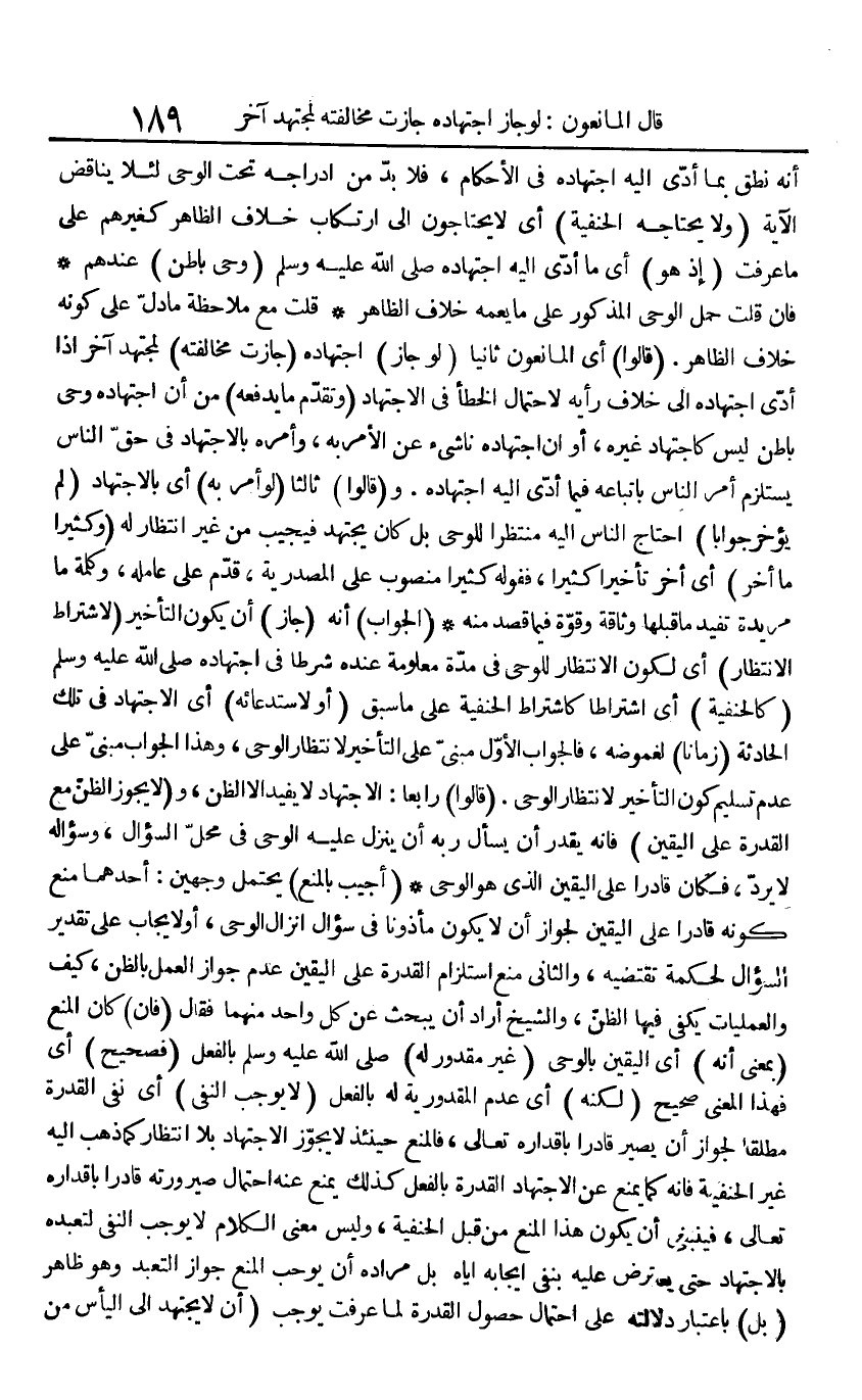 أَنه نطق بِمَا أدّى إِلَيْهِ اجْتِهَاده فِي الْأَحْكَام، فَلَا بُد من إدراجه تَحت الْوَحْي لِئَلَّا يُنَاقض الْآيَة (وَلَا يَحْتَاجهُ الْحَنَفِيَّة) أَي لَا يَحْتَاجُونَ إِلَى ارْتِكَاب خلاف الظَّاهِر كغيرهم على مَا عرفت (إِذْ هُوَ) أَي مَا أدّى إِلَيْهِ اجْتِهَاده صلى الله عَلَيْهِ وَسلم (وَحي بَاطِن) عِنْدهم فَإِن قلت حمل الْوَحْي الْمَذْكُور على مَا يعمه خلاف الظَّاهِر قلت مَعَ مُلَاحظَة مَا دلّ على كَونه خلاف الظَّاهِر. (قَالُوا) أَي المانعون ثَانِيًا (لَو جَازَ) اجْتِهَاده (جَازَت مُخَالفَته) لمجتهد آخر إِذا أدّى اجْتِهَاده إِلَى خلاف رَأْيه لاحْتِمَال الْخَطَأ فِي الِاجْتِهَاد (وَتقدم مَا يَدْفَعهُ) من أَن اجْتِهَاده وَحي بَاطِن لَيْسَ كاجتهاد غَيره، أَو أَن اجْتِهَاده نَاشِئ عَن الْأَمر بِهِ، وَأمره بِالِاجْتِهَادِ فِي حق النَّاس يسْتَلْزم أَمر النَّاس باتباعه فِيمَا أدّى إِلَيْهِ اجْتِهَاده. و (قَالُوا) ثَالِثا (لَو أَمر بِهِ) أَي بِالِاجْتِهَادِ (لم يُؤَخر جَوَابا) احْتَاجَ النَّاس إِلَيْهِ منتظرا للوحي بل كَانَ يجْتَهد فيجيب من غير انْتِظَار لَهُ (وَكَثِيرًا مَا أخر) أَي أخر تَأْخِيرا كثيرا، فَقَوله كثيرا مَنْصُوب على المصدرية، قدم على عَامله، وَكلمَة مَا مزيدة تفِيد مَا قبلهَا وثاقة وَقُوَّة فِيمَا قصد مِنْهُ (الْجَواب) أَنه (جَازَ) أَن يكون التَّأْخِير (لاشْتِرَاط الِانْتِظَار) أَي لكَون الِانْتِظَار للوحي فِي مُدَّة مَعْلُومَة عِنْده شرطا فِي اجْتِهَاده صلى الله عَلَيْهِ وَسلم (كالحنفية) أَي اشتراطا كاشتراط الْحَنَفِيَّة على مَا سبق (أَو لاستدعائه) أَي الِاجْتِهَاد فِي تِلْكَ الْحَادِثَة (زَمَانا) لغموضه، فَالْجَوَاب الأول مَبْنِيّ على التَّأْخِير لانتظار الْوَحْي، وَهَذَا الْجَواب مَبْنِيّ على عدم تَسْلِيم كَون التَّأْخِير لانتظار الْوَحْي. (قَالُوا) رَابِعا: الِاجْتِهَاد لَا يُفِيد إِلَّا الظَّن، و (لَا يجوز الظَّن مَعَ الْقُدْرَة على الْيَقِين) فَإِنَّهُ يقدر أَن يسْأَل ربه أَن ينزل عَلَيْهِ الْوَحْي فِي مَحل السُّؤَال، وسؤاله لَا يرد، فَكَانَ قَادِرًا على الْيَقِين الَّذِي هُوَ الْوَحْي (أُجِيب بِالْمَنْعِ) يحْتَمل وَجْهَيْن: أَحدهمَا منع كَونه قَادِرًا على الْيَقِين لجَوَاز أَن لَا يكون مَأْذُونا فِي سُؤال إِنْزَال الْوَحْي، أَو لإِيجَاب على تَقْدِير السُّؤَال لحكمة تَقْتَضِيه، وَالثَّانِي منع استلزام الْقُدْرَة على الْيَقِين عدم جَوَاز الْعَمَل بِالظَّنِّ، كَيفَ والعمليات يَكْفِي فِيهَا الظَّن، وَالشَّيْخ أَرَادَ أَن يبْحَث عَن كل وَاحِد مِنْهُمَا فَقَالَ (فَإِن) كَانَ الْمَنْع (بِمَعْنى أَنه) أَي الْيَقِين بِالْوَحْي (غير مَقْدُور لَهُ) صلى الله عَلَيْهِ وَسلم بِالْفِعْلِ (فَصَحِيح) أَي فَهَذَا الْمَعْنى صَحِيح (لكنه) أَي عدم المقدورية لَهُ بِالْفِعْلِ (لَا يُوجب النَّفْي) أَي نفي الْقُدْرَة مُطلقًا لجَوَاز أَن يصير قَادِرًا بأقداره تَعَالَى، فالمنع حِينَئِذٍ لَا يجوز الِاجْتِهَاد بِلَا انْتِظَار كَمَا ذهب إِلَيْهِ غير الْحَنَفِيَّة فَإِنَّهُ كَمَا يمْنَع عَن الِاجْتِهَاد الْقُدْرَة بِالْفِعْلِ كَذَلِك يمْنَع عَنهُ احْتِمَال صَيْرُورَته قَادِرًا بأقداره تَعَالَى، فَيَنْبَغِي أَن يكون هَذَا الْمَنْع من قبل الْحَنَفِيَّة، وَلَيْسَ معنى الْكَلَام لَا يُوجب النَّفْي لتعبده بِالِاجْتِهَادِ حَتَّى يعْتَرض عَلَيْهِ بِنَفْي إِيجَابه إِيَّاه بل مُرَاده أَن يُوجب الْمَنْع جَوَاز التَّعَبُّد وَهُوَ ظَاهر (بل) بِاعْتِبَار دلَالَته على احْتِمَال حُصُول الْقُدْرَة لما عرفت يُوجب (أَن لَا يجْتَهد إِلَى الْيَأْس من
